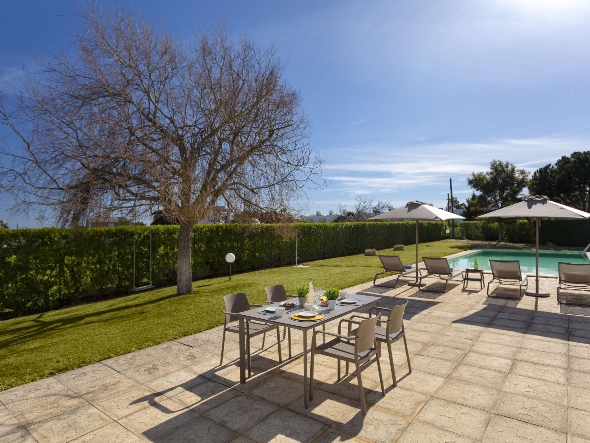 "Almond Tree", 7-room villa 396 m2 on 2 levels. Object suitable for 12 adults. Spacious, very comfortable and beautiful furnishings: lounge with dining table, cable TV, flat screen, air conditioning and forced-air heating. Exit to the terrace, to the swimming pool. 5 rooms, each room with 1 french bed (140 cm, length 190 cm), shower/WC, air conditioning and forced-air heating. 1 room with 1 french bed (140 cm, length 190 cm), hip bath/WC, air conditioning and forced-air heating. Kitchen (2 hot plates, oven, dishwasher, 4 ceramic glass hob hotplates, toaster, kettle, microwave, freezer, electric coffee machine, Capsules for coffee machine (Delta not incl)) with dining table. Exit to the terrace. Sep. WC. On the lower ground floor: playroom with cable TV and flat screen. Exit to the patio. Exit to the terrace. Terrace furniture, barbecue, deck chairs (8). Very beautiful view of the countryside. Facilities: washing machine, iron, children's high chair, baby cot for up to 2 year olds, hair dryer. Internet (WiFi). Parking at the house. Please note: suitable for families. Non-smoking house. 1 small pet/ dog allowed. Smoke alarm, fire extinguisher. 128984/AL