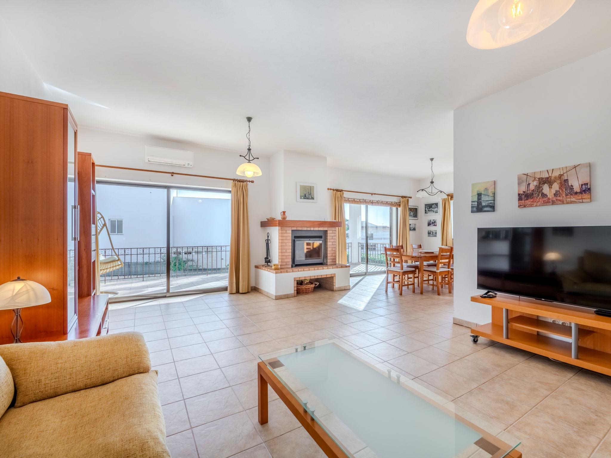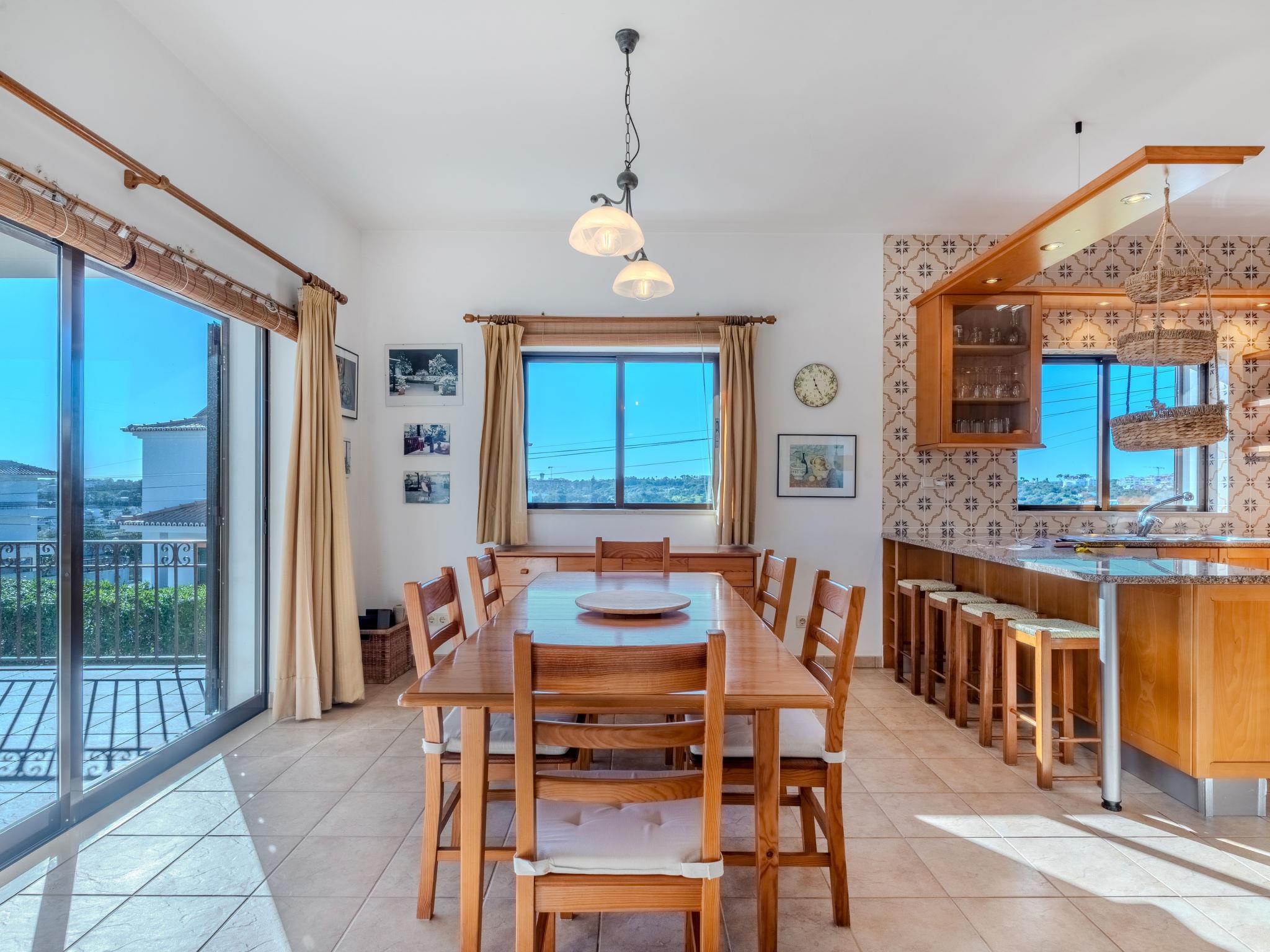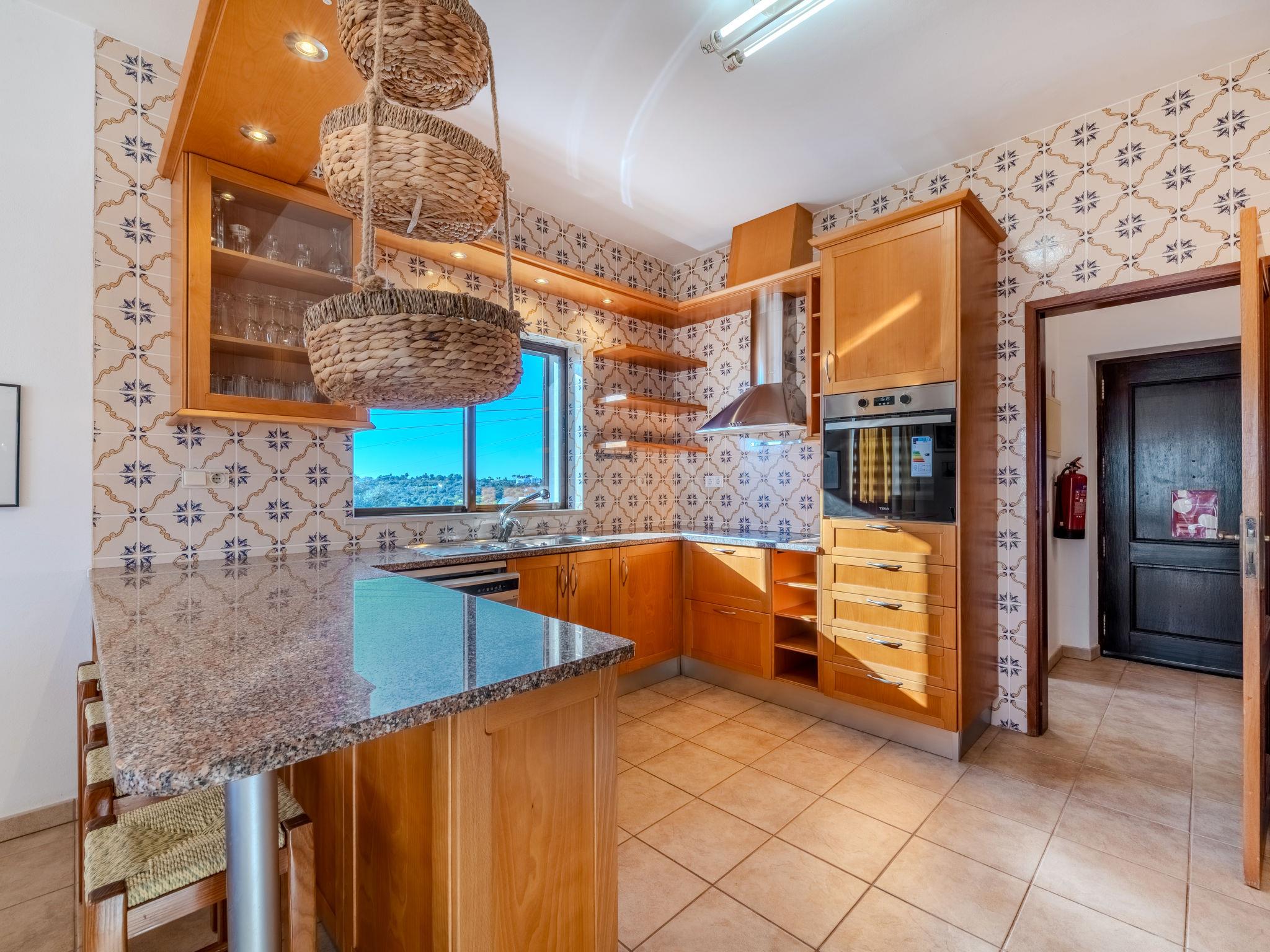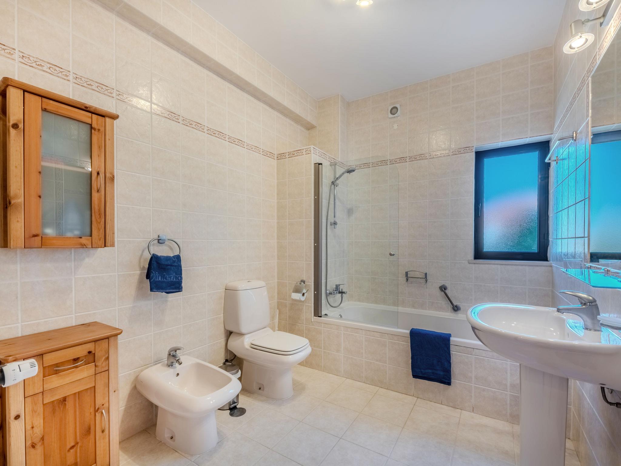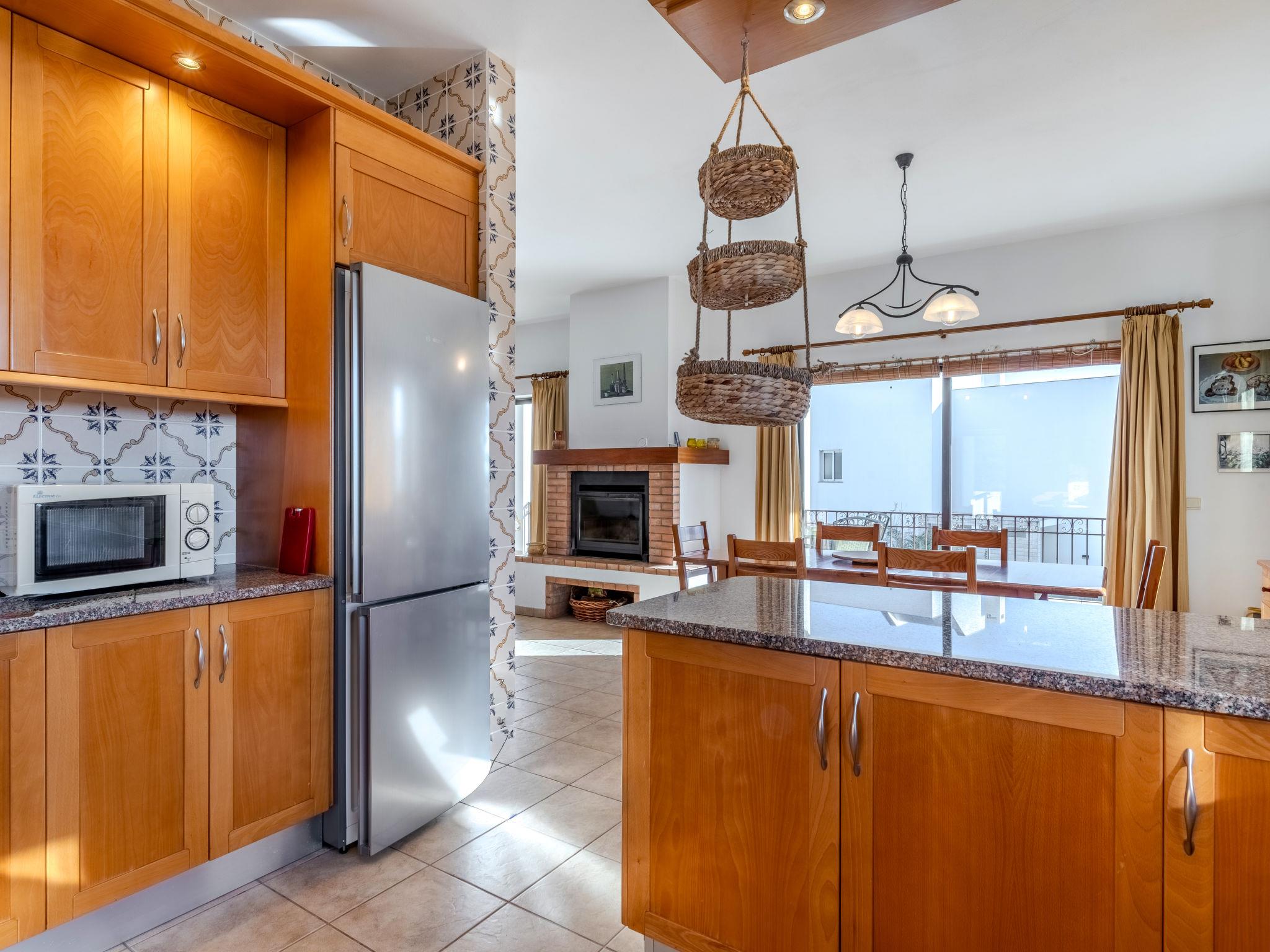 "Ninho do Mocho", 4-room house 270 m2 on 2 levels. Spacious, practical and comfortable furnishings: living/dining room with open-hearth fireplace, cable TV, flat screen, air conditioning and forced-air heating. Exit to the balcony. 1 large room with 2 beds (100 cm, length 200 cm), air conditioning and forced-air heating. Exit to the balcony. 1 room with 1 french bed (160 cm, length 200 cm). Open kitchen (oven, 4 induction hot plates, toaster, kettle, electric coffee machine, Capsules for coffee machine (Dolce Gusto) extra). 2 baths/bidet/WC, sep. WC. Underfloor heating. Heating available only from 01.11. to 31.03. Upper floor: 1 room with 2 beds (95 cm, length 195 cm), air conditioning and forced-air heating. Exit to the terrace. Shower/WC. Large balcony, large terrace, garden. Terrace furniture, deck chairs. Partial view of the sea, the swimming pool and the garden. Facilities: washing machine, dryer, iron, children's high chair, baby cot for up to 2 year olds, hair dryer. Internet (WiFi, free). Parking at the house. Maximum 1 small pet/ dog allowed. 36079/AL