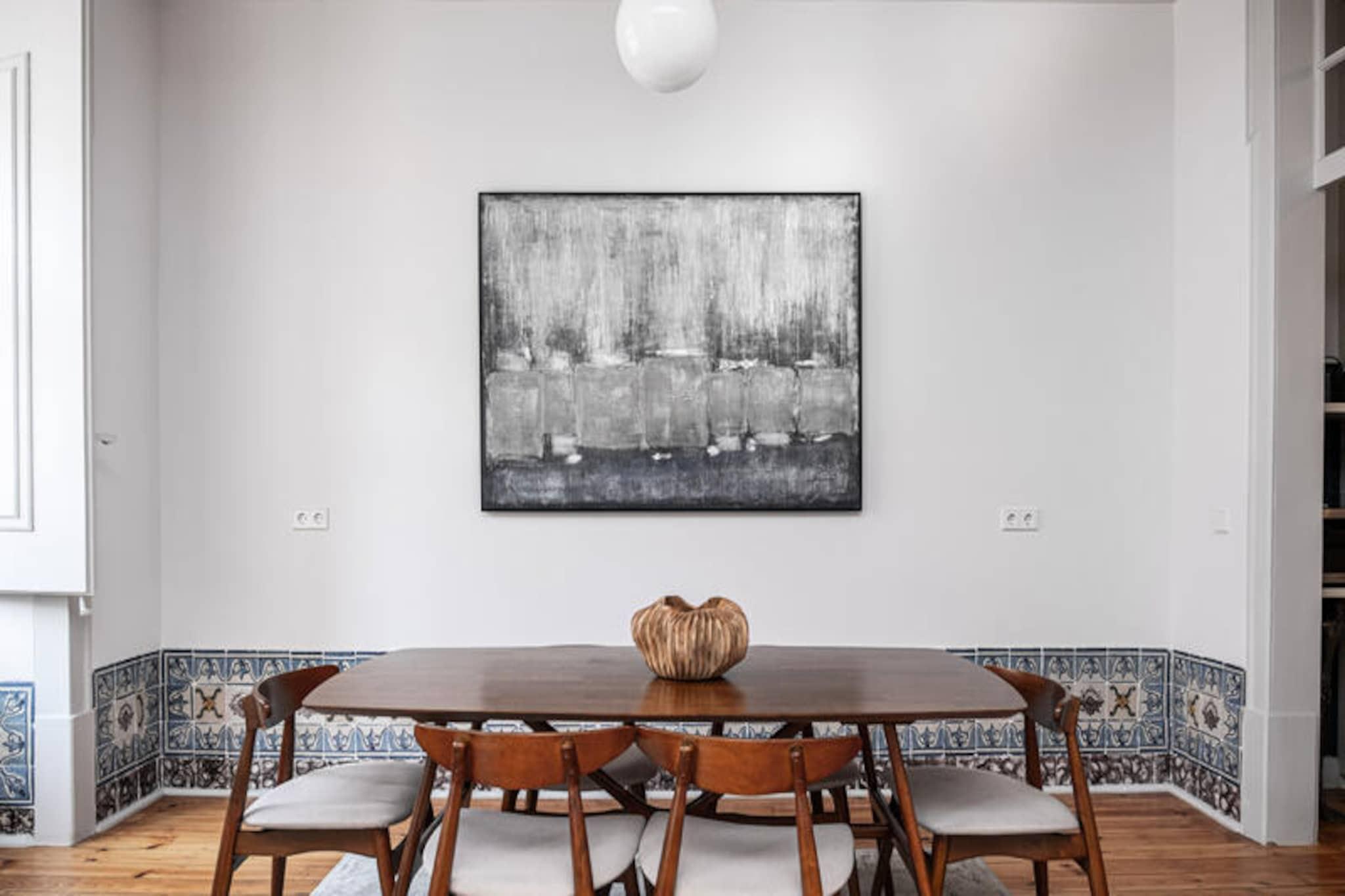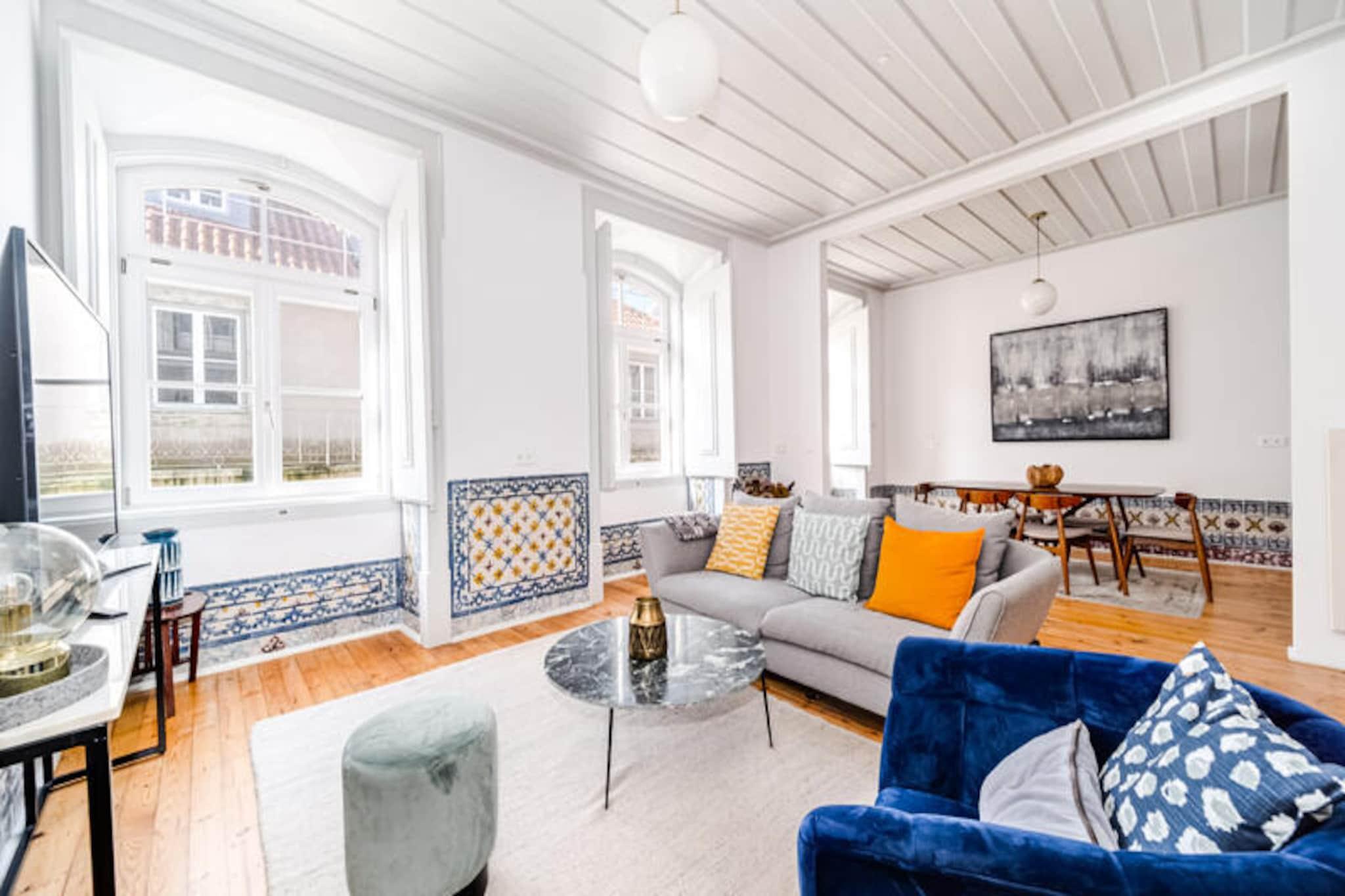 I hjärtat av Lissabons pulserande historiska distrikt erbjuder denna eleganta lägenhet en harmonisk blandning av modern komfort och tidlös charm. Bara några steg från det ikoniska Chiado-kvarteret, omgivet av kullerstensgator, traditionella kaféer och en livlig atmosfär som fångar essensen av Portugals huvudstad. Oavsett om du utforskar den närliggande floden Tejo eller njuter av lokala delikatesser på välkända restauranger, fördjupar detta läge dig i stadens rika kultur och historia. Denna smakfullt inredda lägenhet är 130 m² stor och rymmer bekvämt upp till sex gäster fördelade på tre rymliga sovrum. Interiören är omsorgsfullt utformad och kombinerar modern stil med varma, inbjudande inslag. Det fullt utrustade köket, med induktionshäll, diskmaskin och kaffebryggare, inbjuder dig att laga mat med lätthet, medan det mysiga vardagsrummet med satellit-TV och Wi-Fi garanterar avkoppling efter en dags sightseeing. Ytterligare bekvämligheter som luftkonditionering, tvättmaskin och hiss bidrar till bekvämligheten under din vistelse. Inom gångavstånd hittar du allt du behöver: charmiga kaféer som Nicolau Lisboa, lokala stormarknader och tunnelbanestationen Baixa-Chiado för enkel tillgång till resten av staden. För dig som söker grönområden ligger Jardim do Príncipe Real och Jardim Botânico de Lisboa bara en kort bilresa bort. Ikoniska landmärken, inklusive det livliga Praça do Comércio och den pittoreska stadsdelen Alfama, finns också i närheten och erbjuder oändliga möjligheter att utforska. Oavsett om du är här för att njuta av Lissabons historiska charm, njuta av det pulserande nattlivet eller bara koppla av i en elegant urban reträtt, erbjuder denna lägenhet den perfekta basen för en oförglömlig vistelse i en av Europas mest fascinerande städer.