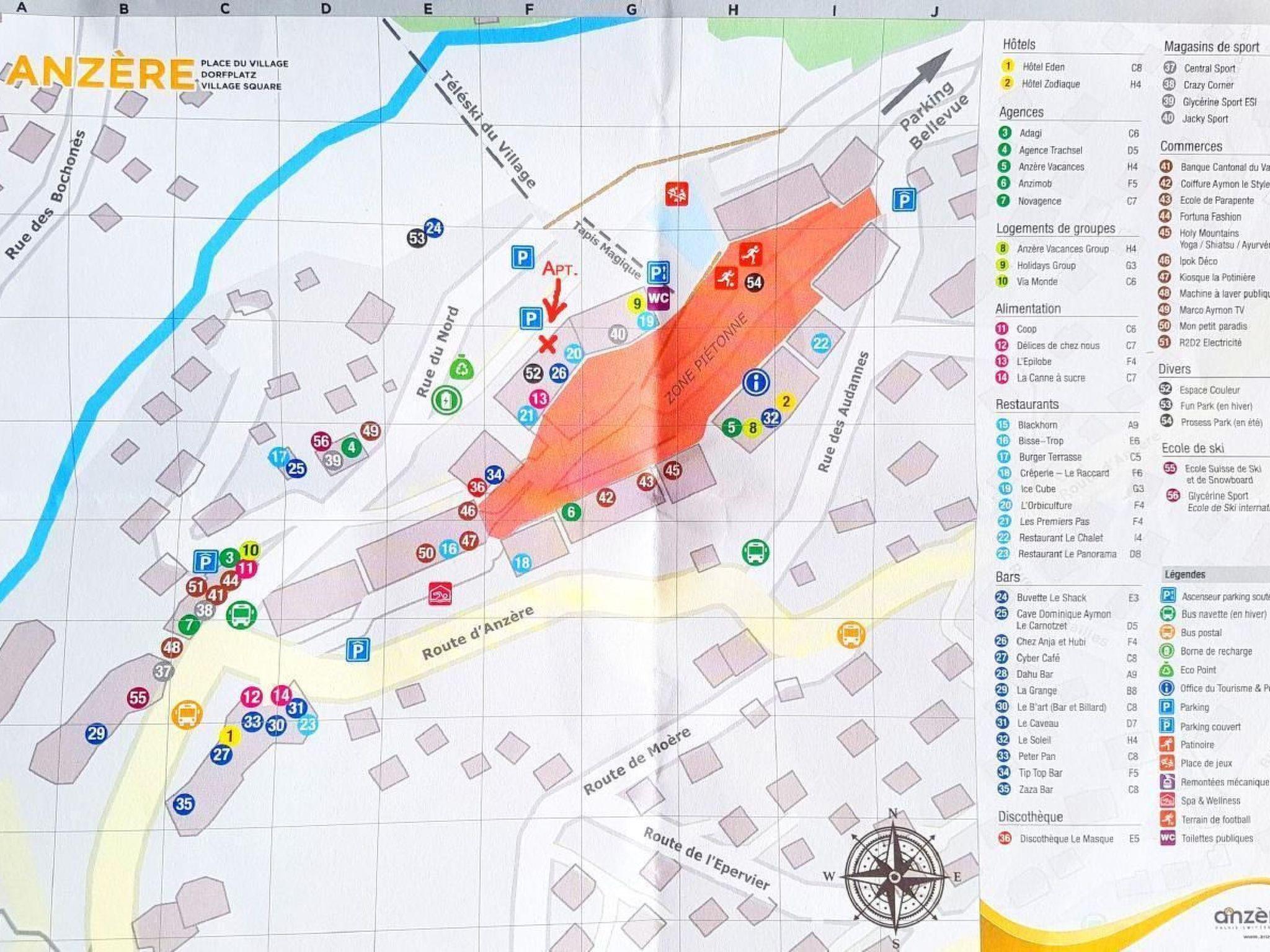 The apartment is located at the very center of Anzère which has a cozy atmosphere of a community due to unique layout around a large car-free public area. Just downstairs are a nice restaurant, a bakery/cafe, a pizzeria, a painting studio (great for kids) and a sports shop. Only a few steps away in the same public area are other restaurants, bars, shops, a wellness center with indoor and outdoor swimming pools, an ice skating rink (free), a sledging slope with a Magic Carpet skilift (also free) and a large playground.