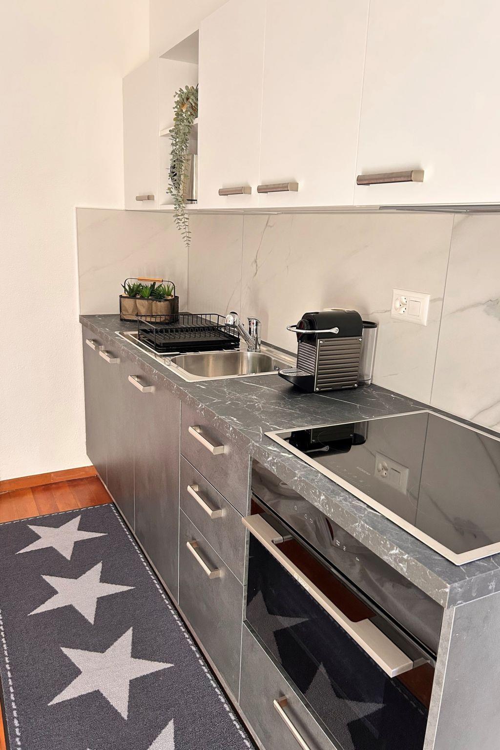 The interiors are cosy and functional. In the living area, a dining table, cable TV, radio and WLAN ensure your comfort and relaxation. The upper floor has a bedroom with a double bed and another bedroom with two single beds - ideal for families or a small group of friends. The kitchen leaves nothing to be desired and has a coffee machine (Nespresso capsules), a kettle, a hob with oven and a fridge. A bathroom with a spacious shower, washbasin and toilet completes the interior of the flat.