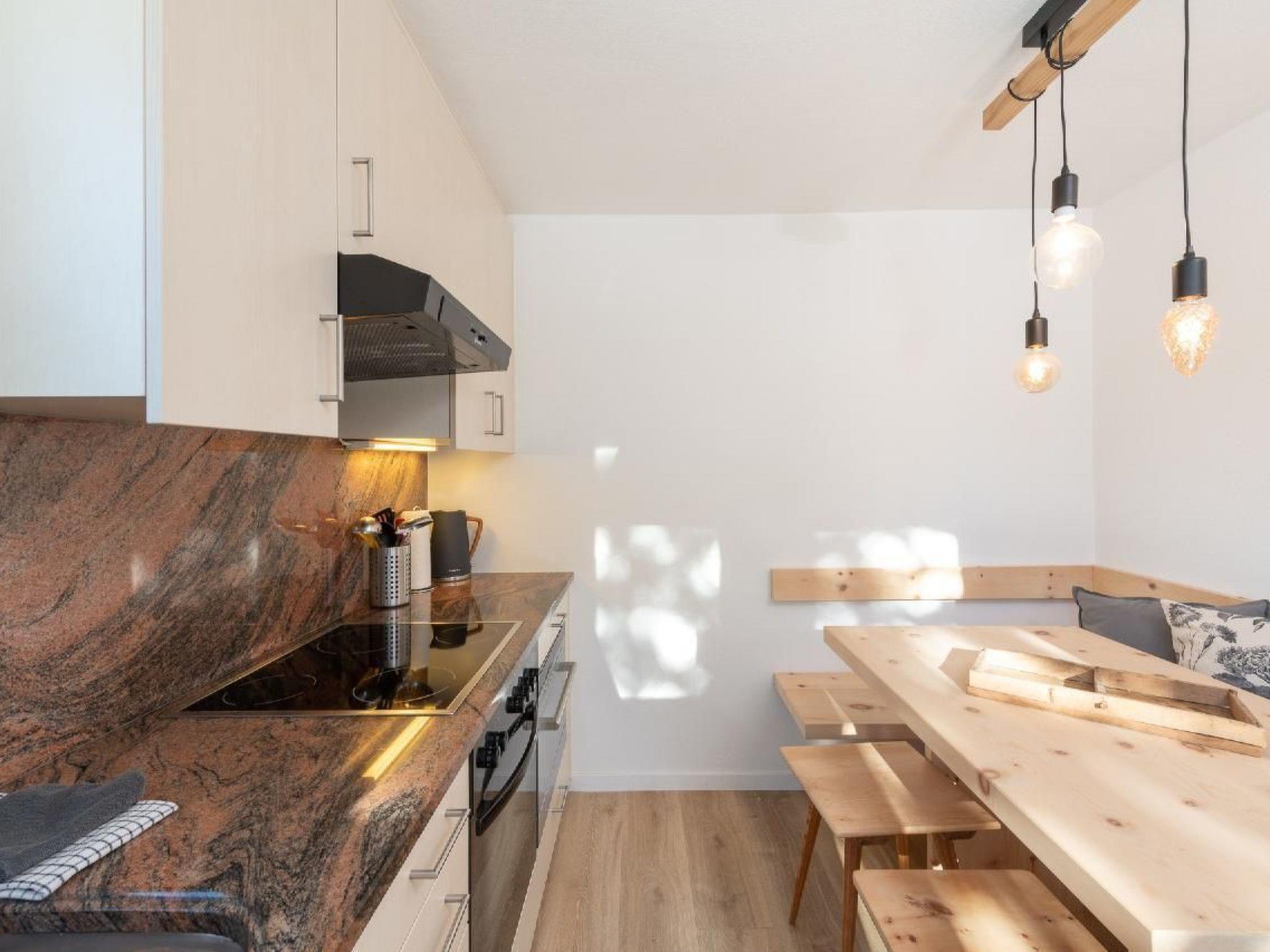 Inside, you will find amenities that will make your stay unforgettable. The kitchen, with a beautiful Swiss stone pine dining area, is fully equipped - including a fridge with freezer compartment, oven, dishwasher and a fully automatic coffee machine for whole beans. In the living room, a green sofa, a cosy reading chair and a TV invite you to relax. A cosy wooden floor harmoniously connects all the rooms, complemented by a bathroom with a walk-in rain shower that leaves nothing to be desired.