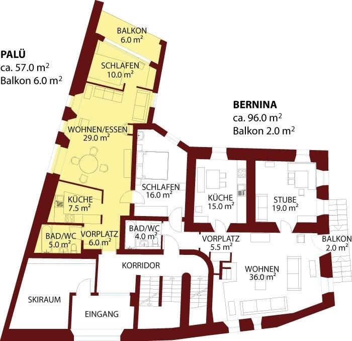 Die Wohnung Palü bietet auf 57 m² alles, was man für einen erholsamen Aufenthalt im Engadin braucht. Der helle Wohn- und Essbereich ist mit einem Schwedenofen, einem Esstisch und liebevoll ausgewählten Arvenmöbeln eingerichtet, die eine warme und gemütliche Atmosphäre schaffen. Die offene Küche ist vollständig ausgestattet – mit Kochherd, Backofen, Geschirrspüler, Kühlschrank, Nespresso-Maschine und Geschirr. Das separate Schlafzimmer verfügt über ein Doppelbett (140 cm) und direkten Zugang zum Balkon, auf dem man die Engadiner Bergluft geniessen kann. Das Badezimmer bietet eine Badewanne mit Duschvorrichtung, WC, Waschbecken und Haartrockner. WLAN, ein Flachbild-TV mit Netflix und Bodenheizung sorgen für modernen Komfort. Ideal für zwei bis vier Personen, die Ruhe, Authentizität und den Engadiner Charme suchen.
