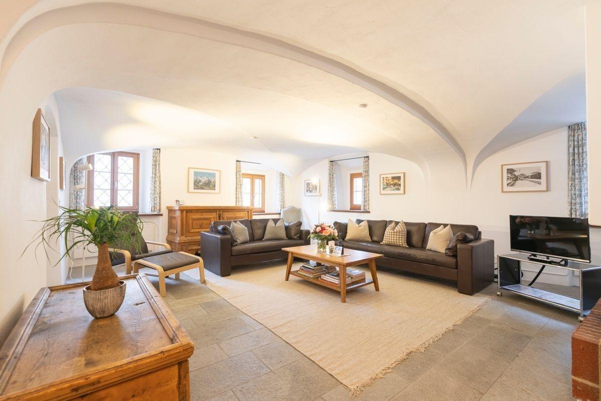 Die Wohnung Diavolezza verbindet traditionellen Engadiner Stil mit grosszügigem Wohnkomfort. Besonders hervorzuheben ist das elegante Wohnzimmer mit Cheminée, Ledersofas und antiken Möbeln, das eine warme und einladende Atmosphäre schafft. Die angrenzende Engadinerstube mit Esstisch, Eckbank und zwei zusätzlichen Betten verleiht der Wohnung ihren unverwechselbaren Charakter. Die historische Gewölbeküche mit Balkon lädt zum gemeinsamen Kochen und Geniessen ein. Durchdachte Details wie WLAN, Netflix-TV und Bodenheizung sorgen für modernen Komfort, während das Haus selbst Geschichte und echten Engadiner Charme ausstrahlt. Hunde sind herzlich willkommen, und der Check-in erfolgt bequem über eine Schlüsselbox.