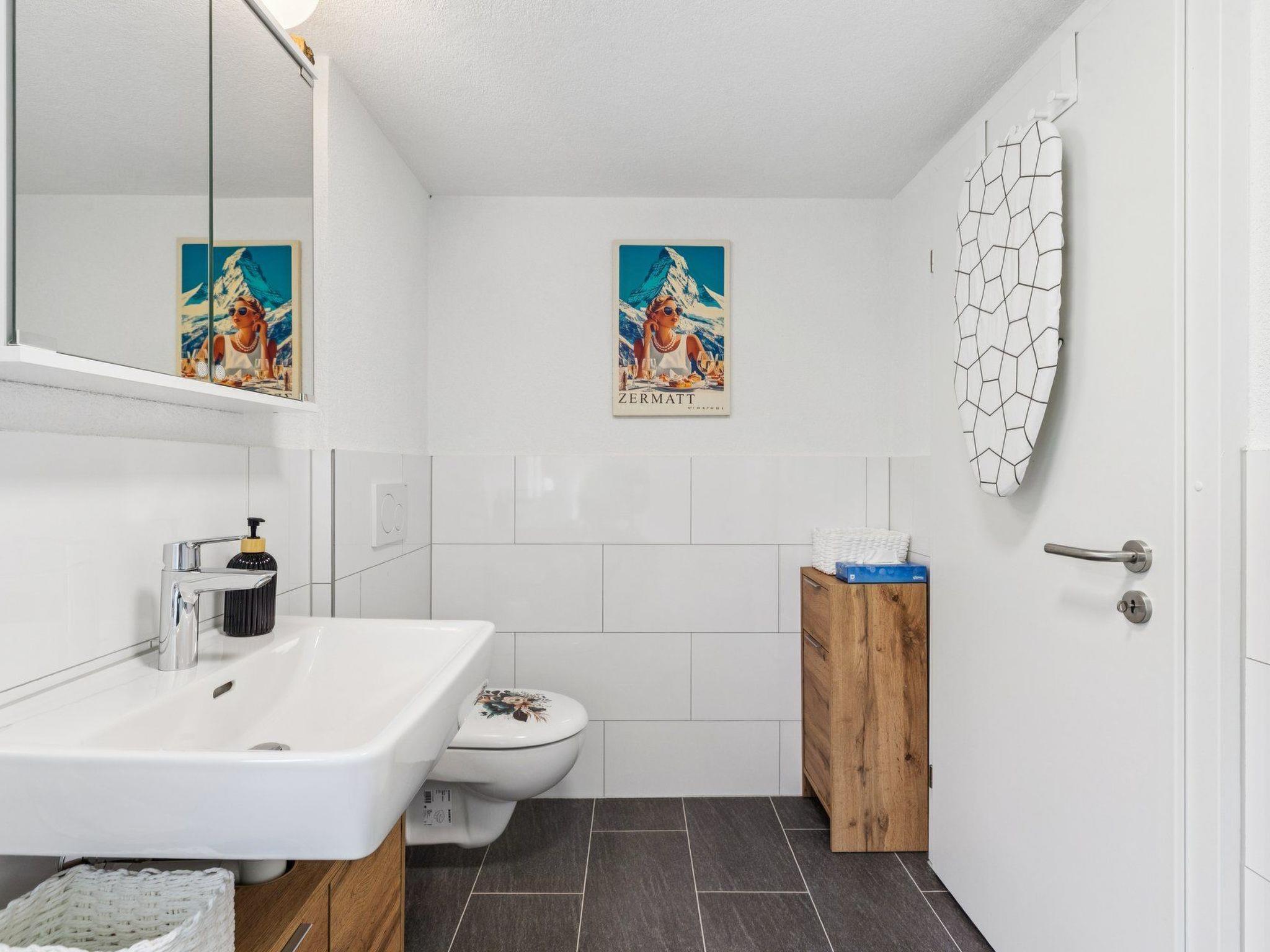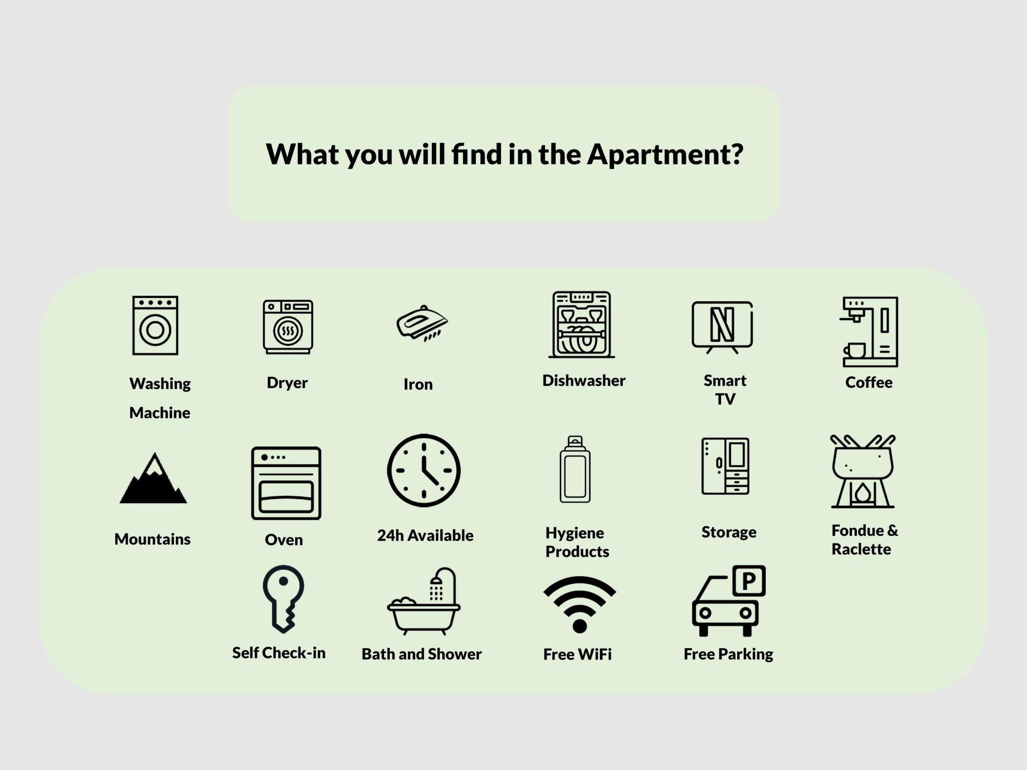 In the fully equipped kitchen, you can start your stay with a delicious NESPRESSO coffee and enjoy all the great amenities of this flat. A welcome set with coffee, tea and delicious Swiss chocolate from the Glarus region also awaits you.