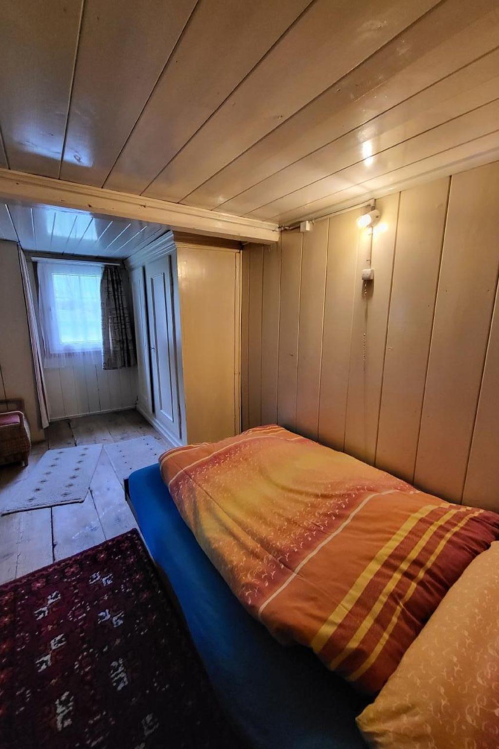 Downstairs: Hallway, simple kitchen with corner bench (6 p.), fridge with freezer compartment, electric cooker and wood-burning cooker, washing machine and wood-burning stove. Living room with dining area and adjoining room. They are connected to each other. In the adjoining room: a sofa that can be pulled out into an extra bed. In the front part: cosy living room with sofa, TV and tiled stove. There is also a dining table with seating for 6 people. It is important to note that the living room is sloping and tall people cannot stand well everywhere. However, this only applies to this one room!