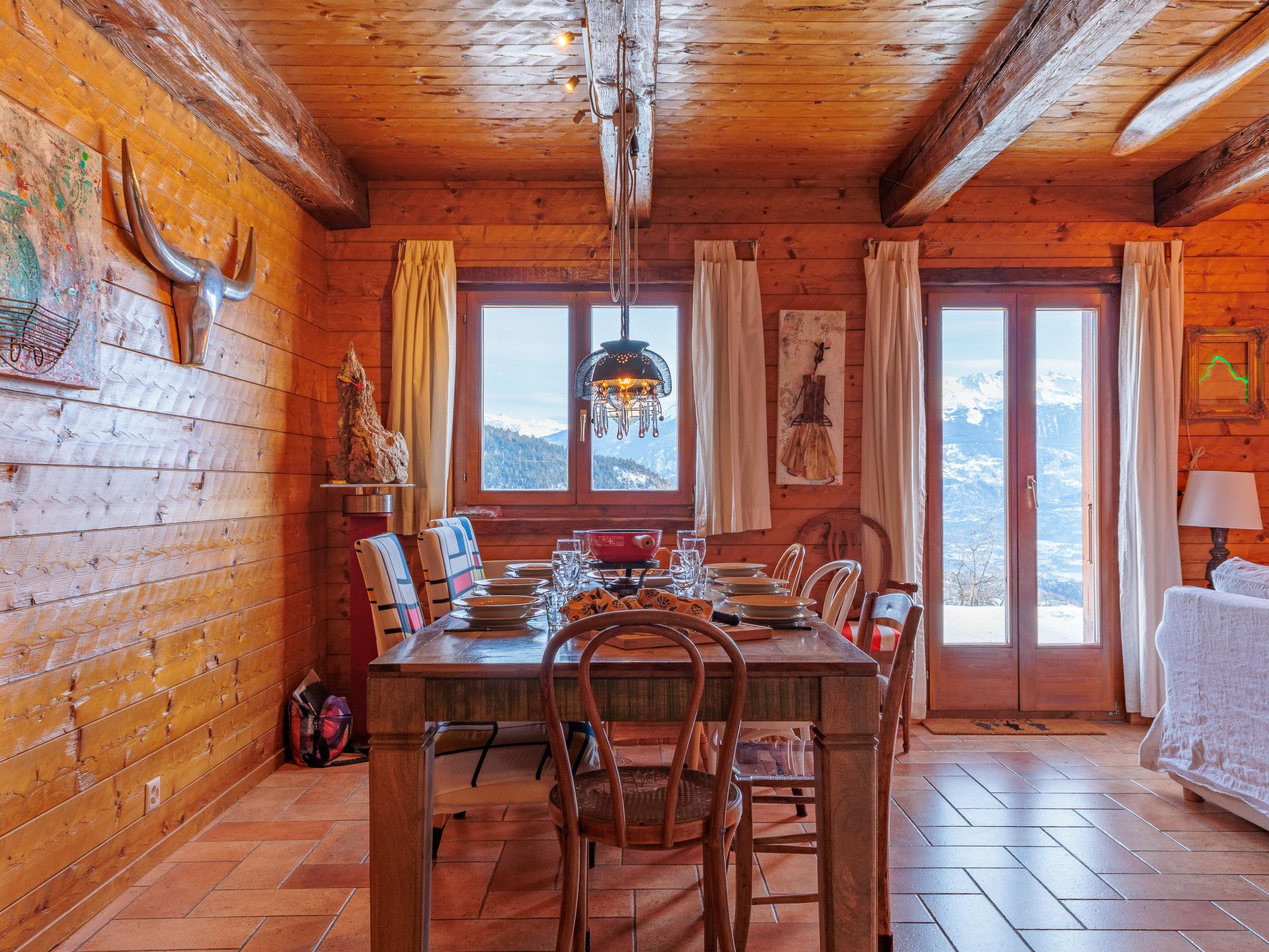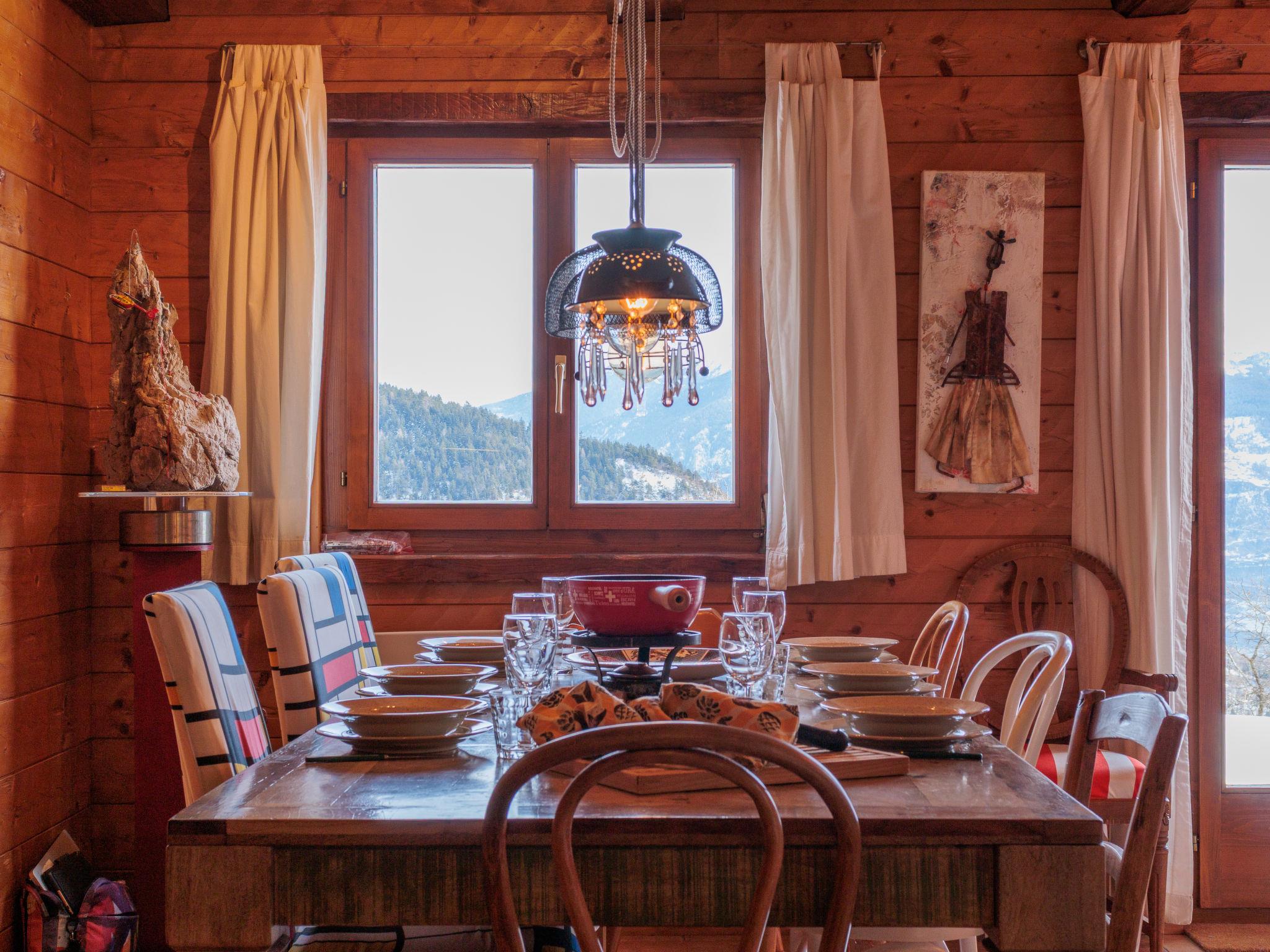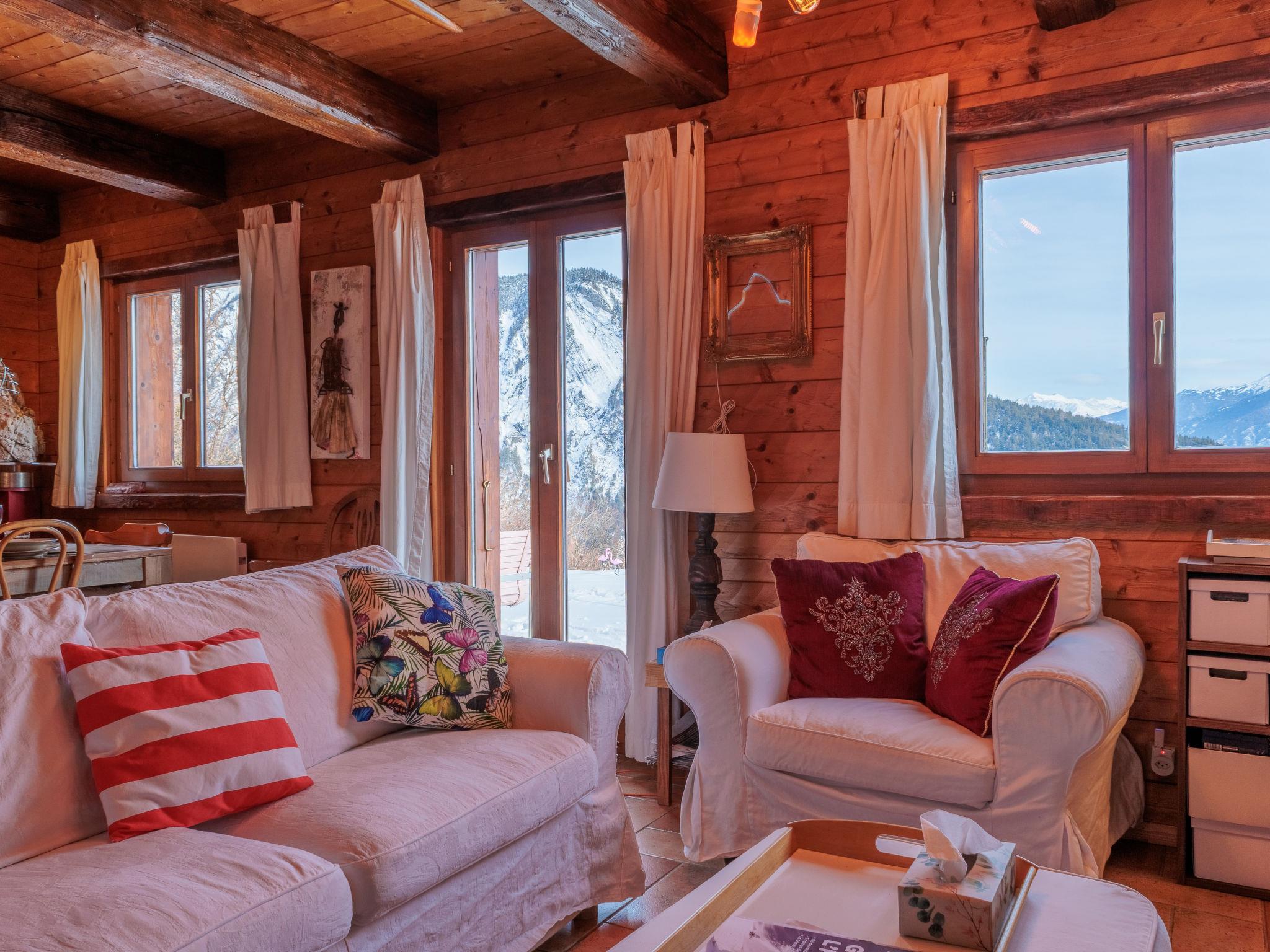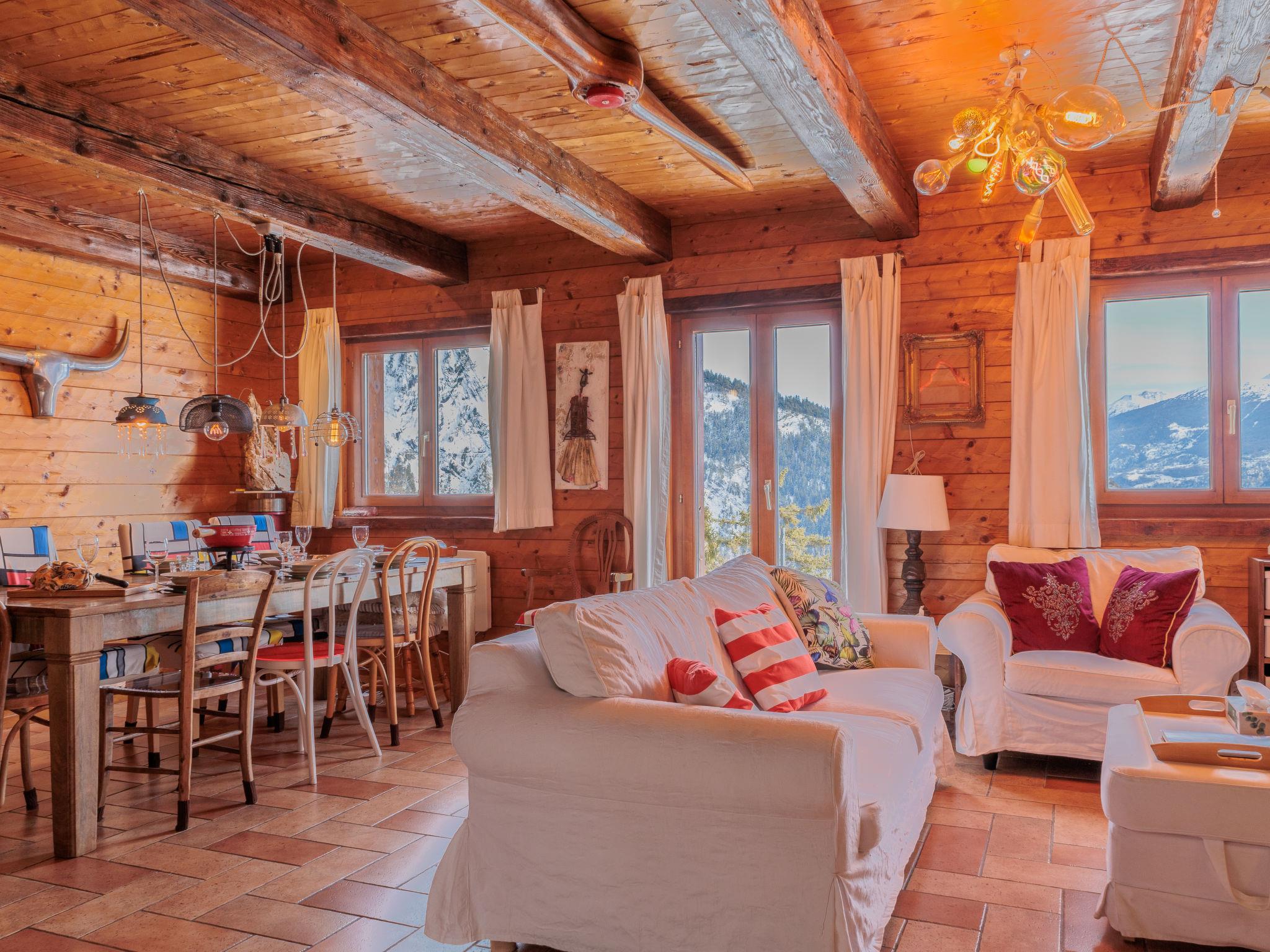 "Mayens du Rudet", 4-room chalet 125 m2 on 2 levels, south facing position. Beautiful and cosy furnishings: living/dining room with open-hearth fireplace, cable TV and DVD. Exit to the garden. Open kitchen (4 hot plates, oven, dishwasher, kettle, microwave, electric coffee machine, Capsules for coffee machine (Nespresso) extra, raclette grill, fondue Set (cheese)). Sep. WC. Heating. Upper floor: 1 room with 1 french bed (160 cm, length 200 cm). 1 room with 2 beds (90 cm, length 200 cm). 1 room with 1 french bed (140 cm, length 200 cm). Exit to the terrace, north facing position. Shower/WC. Forced-air heating. Heating not available in all rooms. Terrace, garden, south facing position. Terrace furniture, barbecue, conservatory. Marvellous panoramic view of the mountains and the valley. Facilities: washing machine, dryer. Internet (WiFi, free). Parking (3 cars). Please note: non-smokers only.