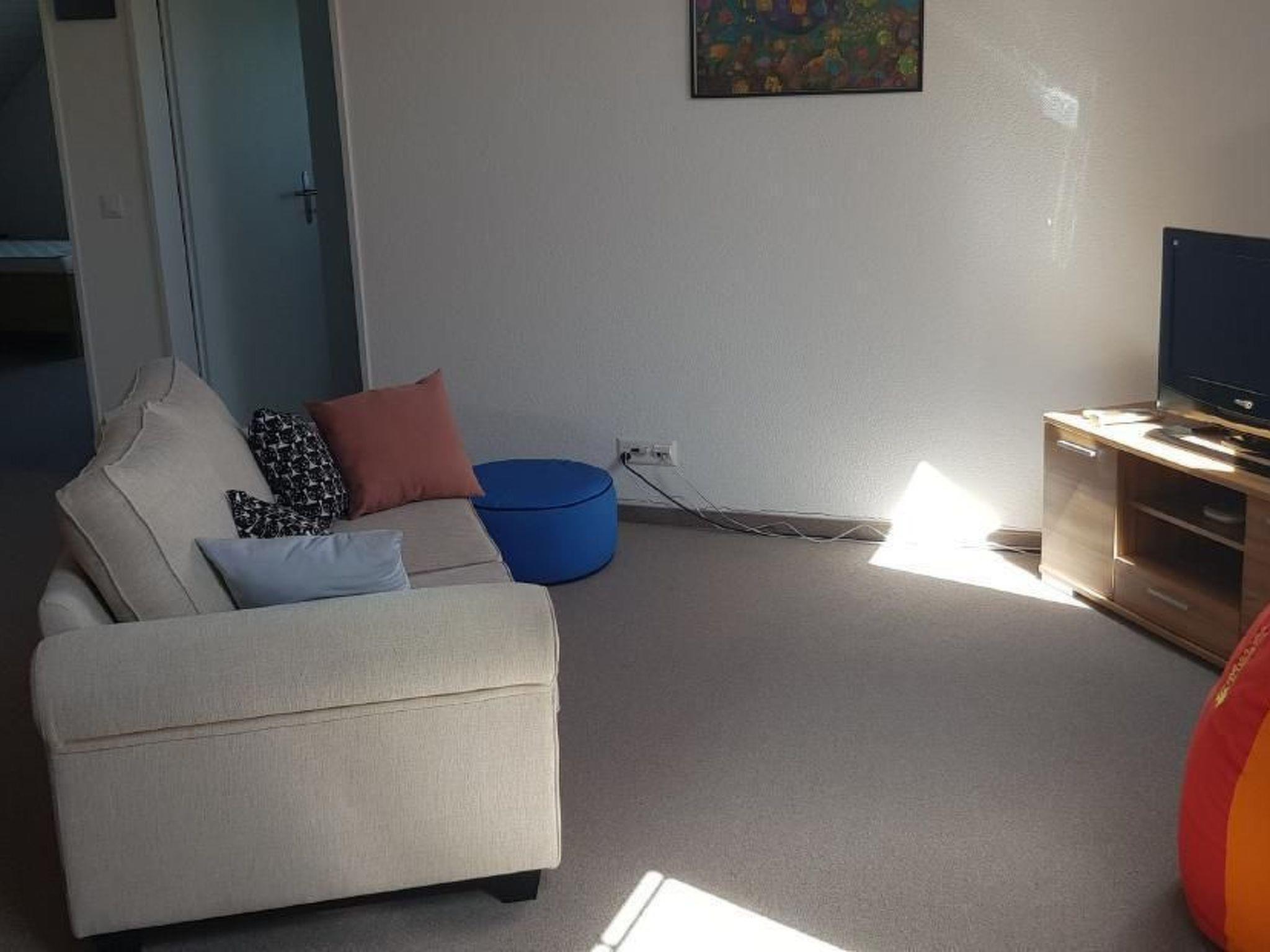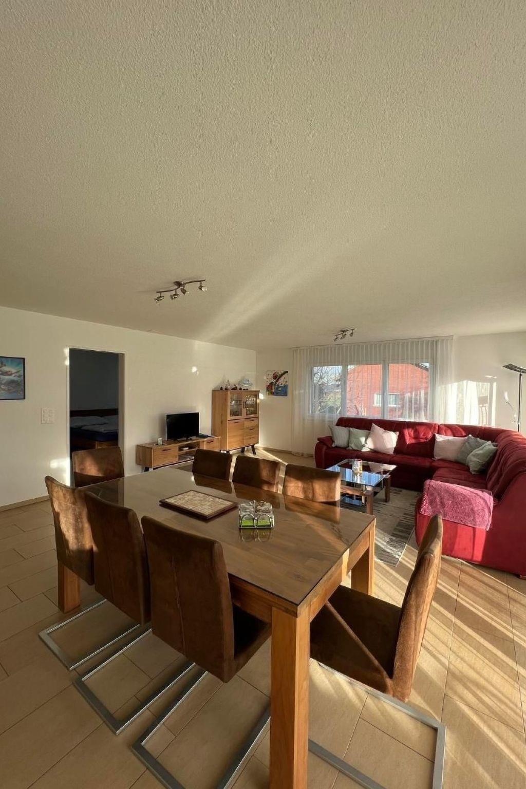 The living room has a cosy corner sofa and flat screen with Swisscom TV.