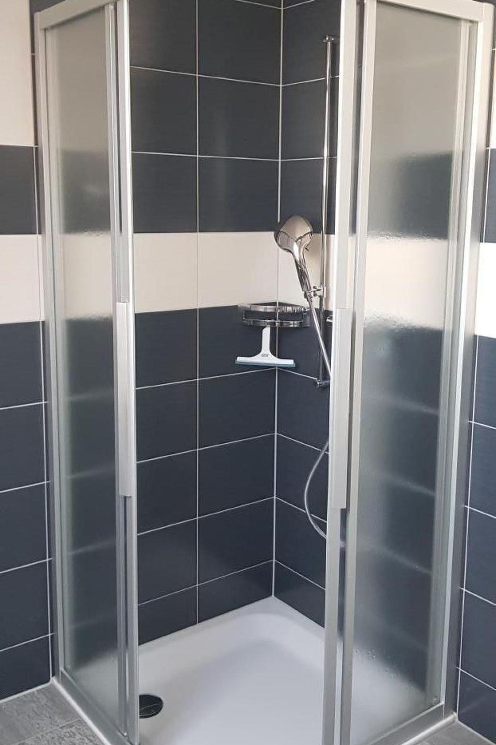 The bathroom is equipped with a washbasin, mirror cabinet, WC and shower with folding seat.