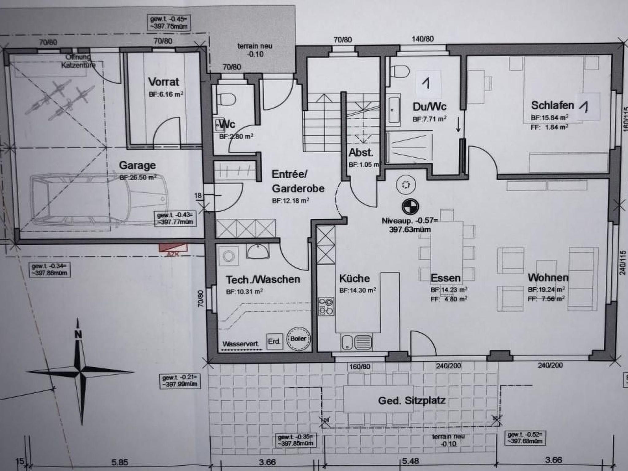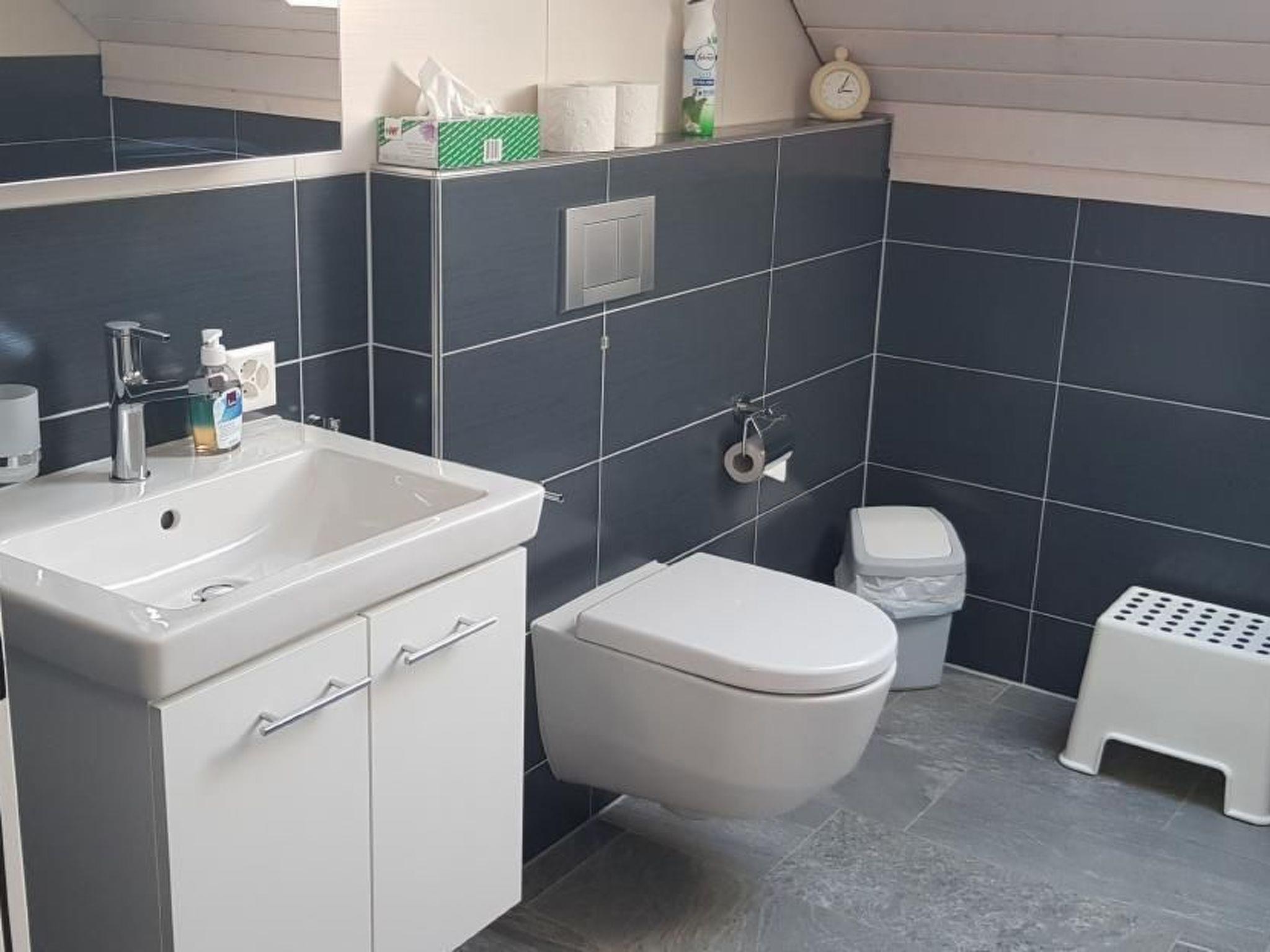 On the ground floor is the general living area with open-plan kitchen and dining area and cosy living room. From here you enter bedroom 1 with direct access to a bathroom. Also on the ground floor is a separate guest WC, the utility room with washing machine and tumble dryer and heat pump heating. Attached to the house is a garage for 1 car and bicycles, with direct access to the ground floor. The ground floor is rounded off with a covered seating area with sun blinds, which is accessible from the living room. Garden furniture and deckchairs as well as an electric barbecue are available.