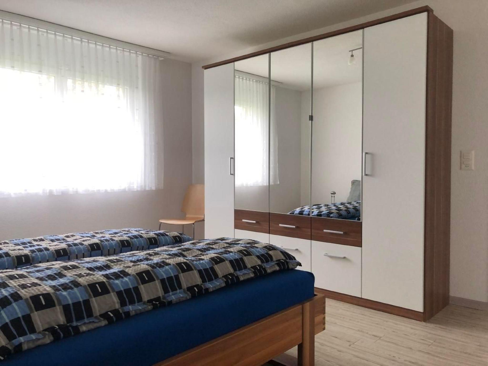The bedroom is furnished with a double bed, bedside table, large wardrobe and wall mirror.
