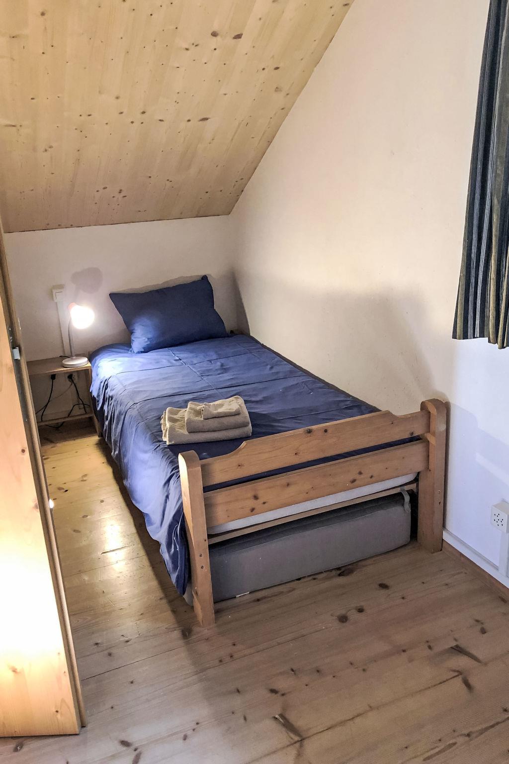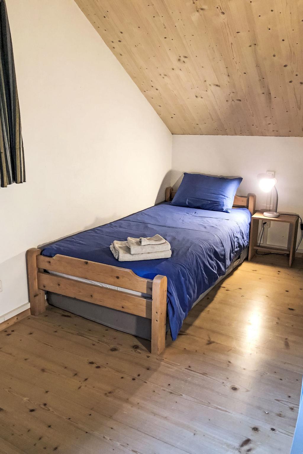 3-room chalet 92 m2 on 2 levels. Bright, partly with sloping ceilings, comfortable and wooden furniture furnishings: open living/dining room with Scandinavian wood stove, dining table, cable TV, flat screen and radio. Exit to the terrace. Open kitchen (oven, dishwasher, 4 ceramic glass hob hotplates, freezer, electric coffee machine, fondue Set (cheese)). Bath/shower/WC. Electric heating, wood heating, boiler (300 litres). Upper floor: 1 double bedroom with 1 double bed (180 cm, length 200 cm). 1 room with 2 beds (90 cm, length 200 cm), 1 sleeping facility (80 cm, length 180 cm). Wooden floors. Terrace 12 m2. Terrace furniture, deck chairs (2). Very beautiful panoramic view of the mountains, the valley and the countryside. Facilities: children's high chair, baby cot, baby changing unit. Internet (WiFi, free). Garage at 100 m. Please note: suitable for families. Non-smokers only.