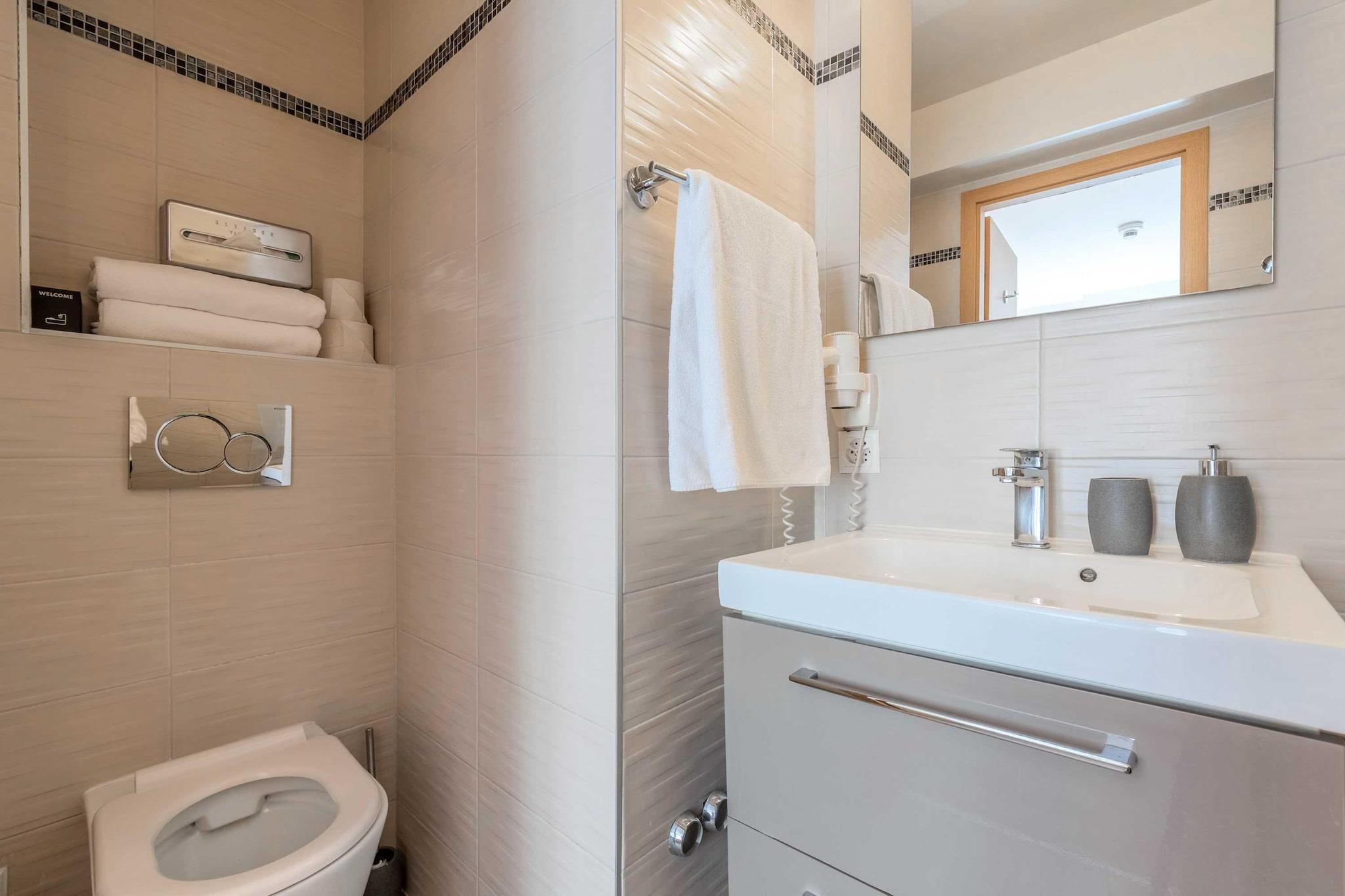 On the 1st floor: (Living room(double sofa bed, TV(flatscreen)), Kitchen(dining table, hob, electric kettle, coffee machine, combination microwave, fridge, electric hot plates, dishes and cutlery, Cooking basics, Wine glasses), bedroom(double bed, TV, heating), bathroom(shower, washbasin, toilet, hairdryer, shampoo, body soap)) air conditioning, iron, hot water, Extra pillows and blankets