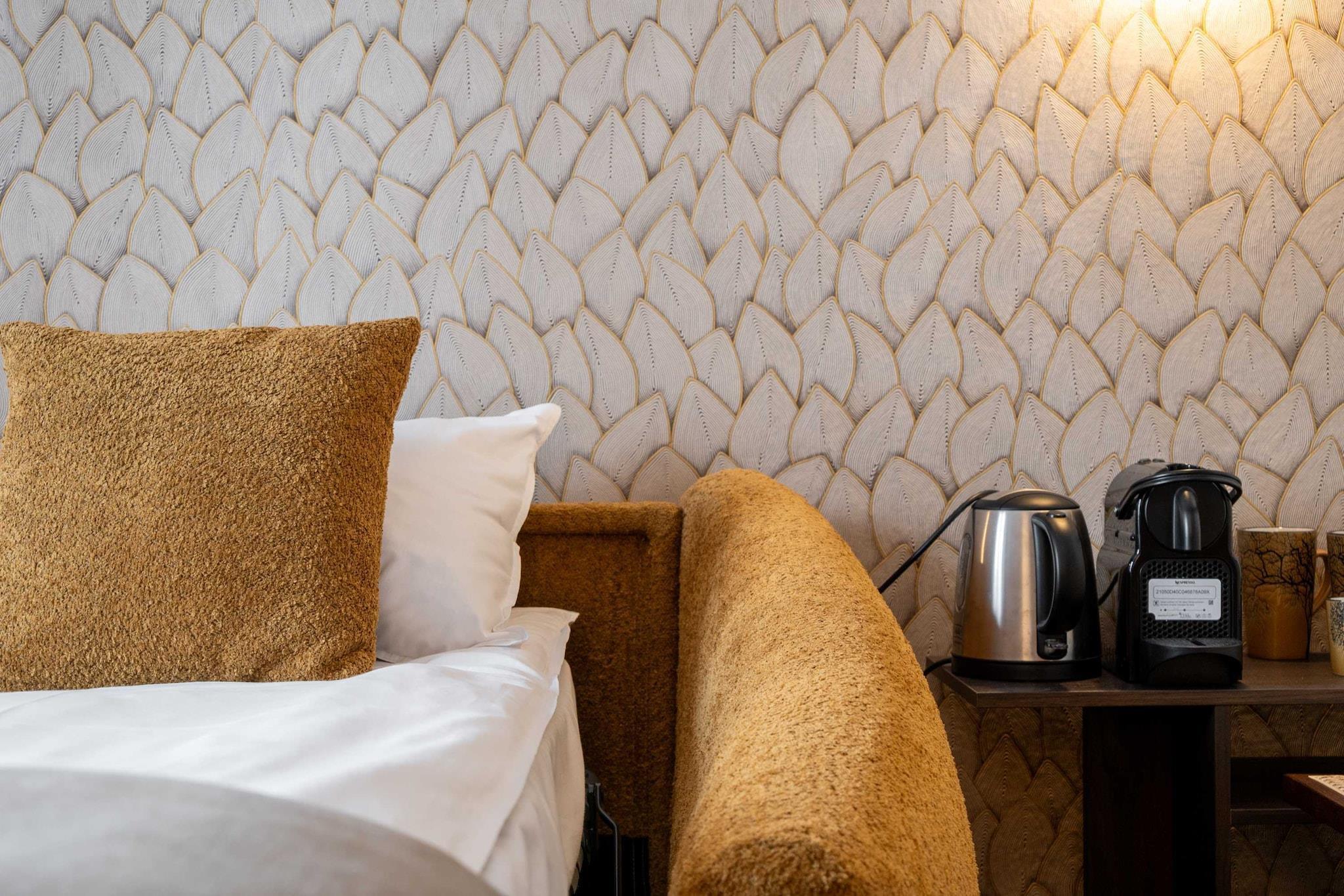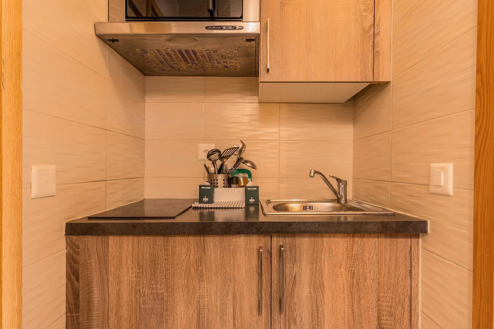 On the 4th floor: (Living room(double sofa bed, TV(flatscreen)), Kitchen(dining table, hob, electric kettle, coffee machine, microwave, fridge, electric hot plates, dishes and cutlery, Cooking basics, Wine glasses), bedroom(single bed, single bed, TV), bathroom(shower, toilet, hairdryer, shampoo, body soap, hot water))