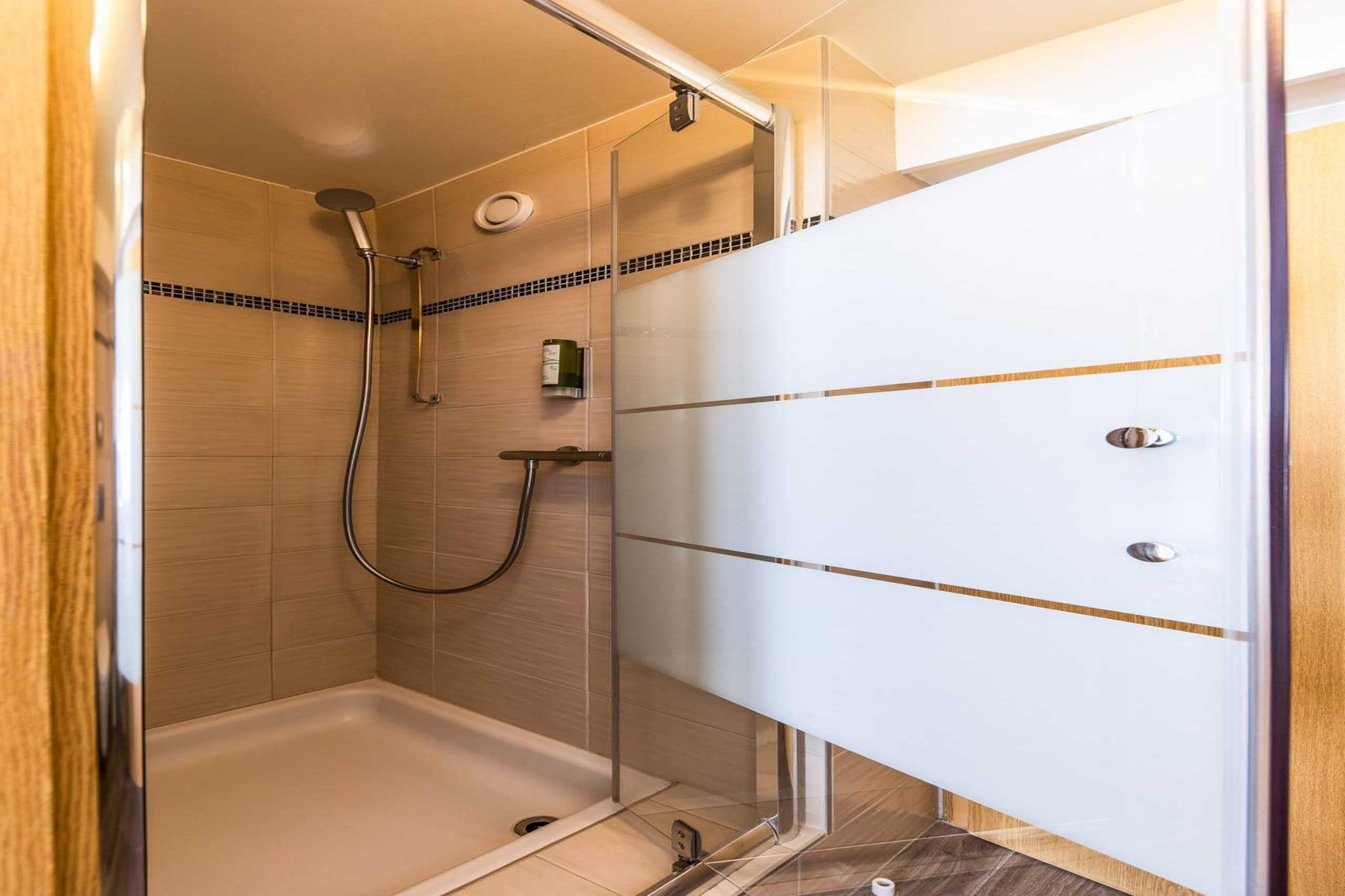 On the 5th floor: (Living room(double sofa bed, TV(flatscreen)), Kitchen(hob, coffee machine, combination microwave, fridge, electric hot plates, dishes and cutlery, Cooking basics, Wine glasses), bedroom(double bed, TV), bathroom(toilet, hairdryer, shampoo, body soap, hot water))