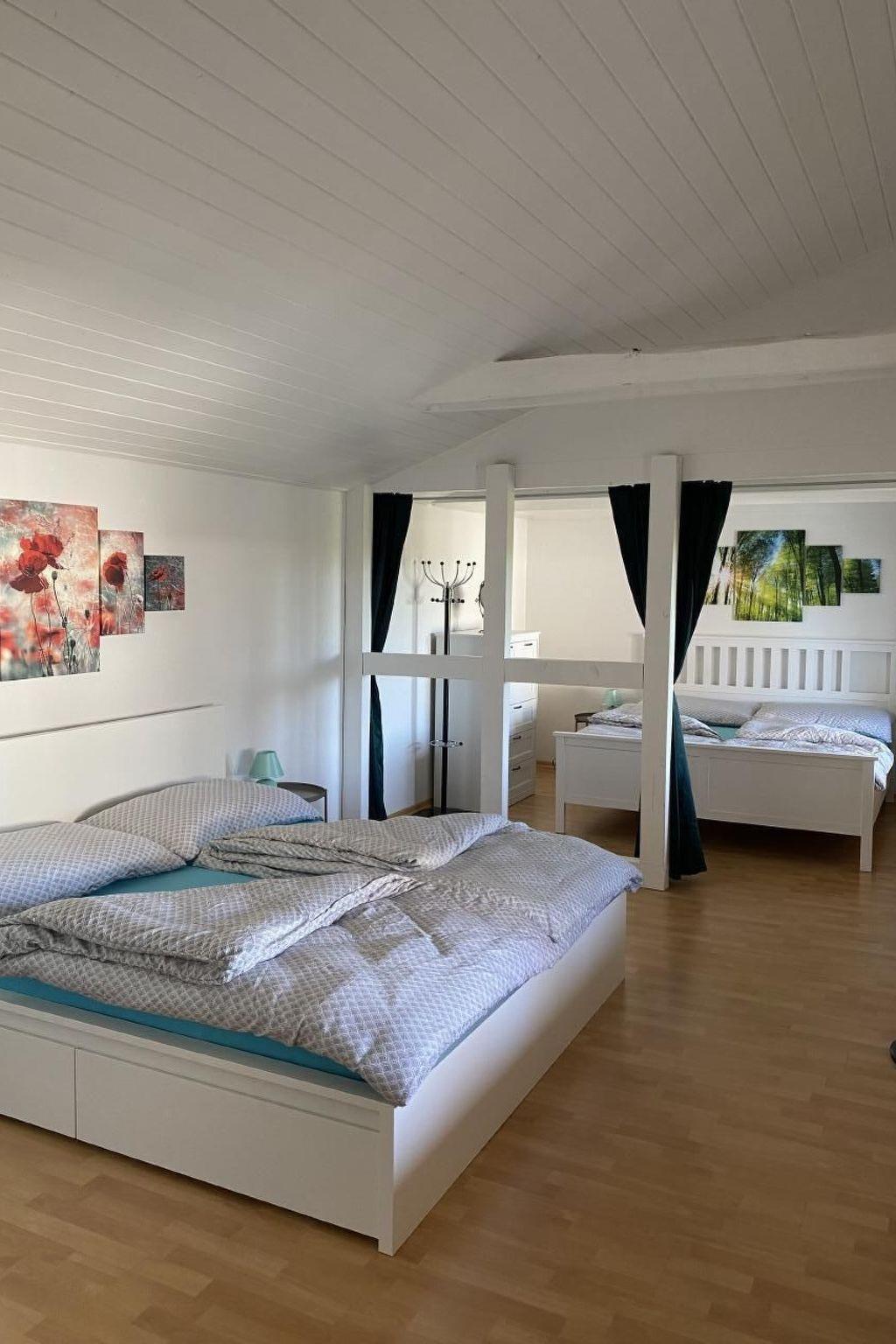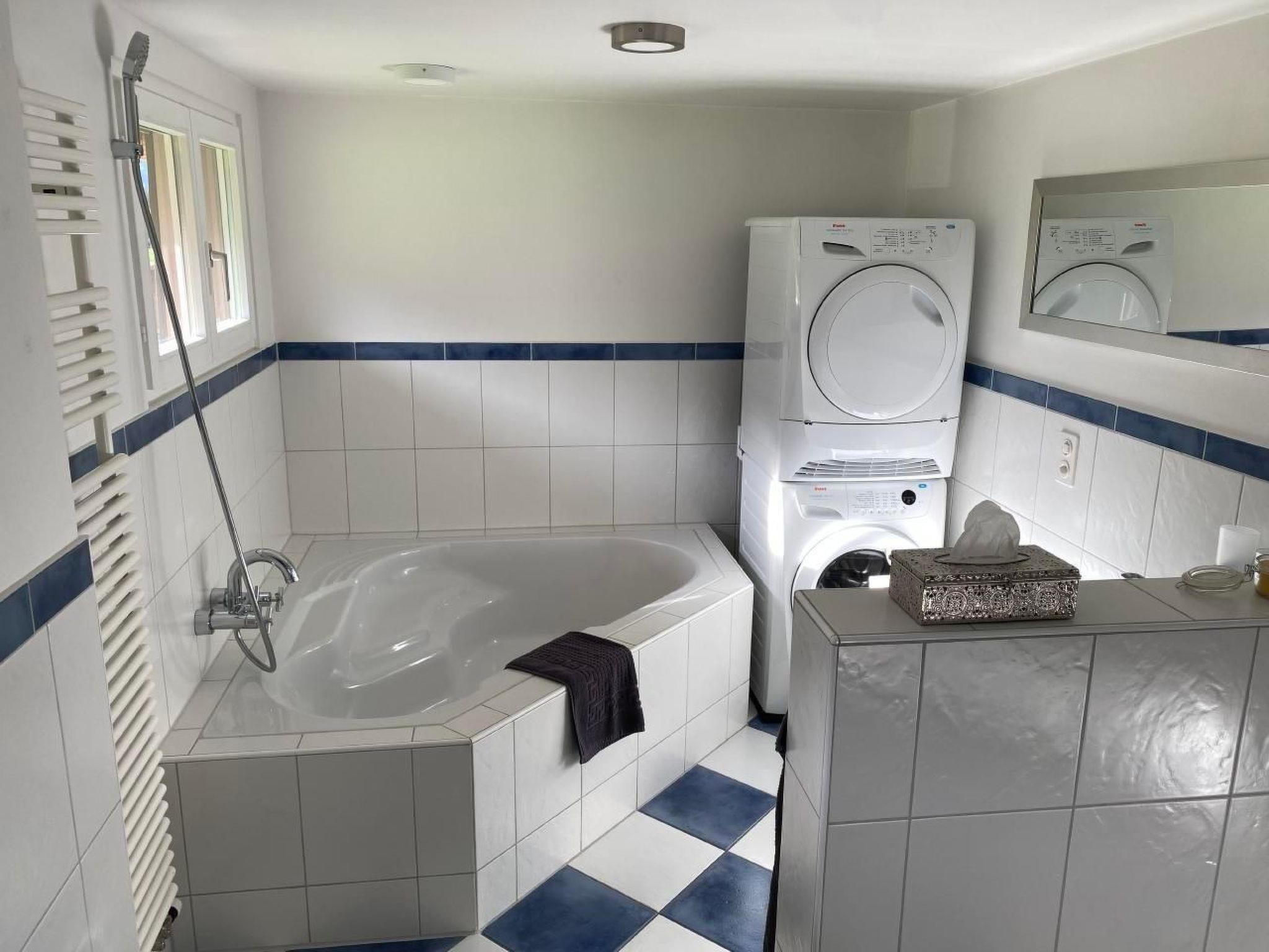 Inside, the flat has a fully equipped kitchen, including a ceramic hob, oven, large fridge, dishwasher, Delizio capsule coffee machine (Migros), kettle, toaster, as well as a raclette oven and a cheese fondue/chinoise set for convivial evenings. The bedroom is furnished with two comfortable 180x200 cm beds and a travel cot, all secured by opaque curtains for your privacy. The bathroom has a walk-in shower, corner bath, washing machine and tumble dryer as well as a hairdryer.