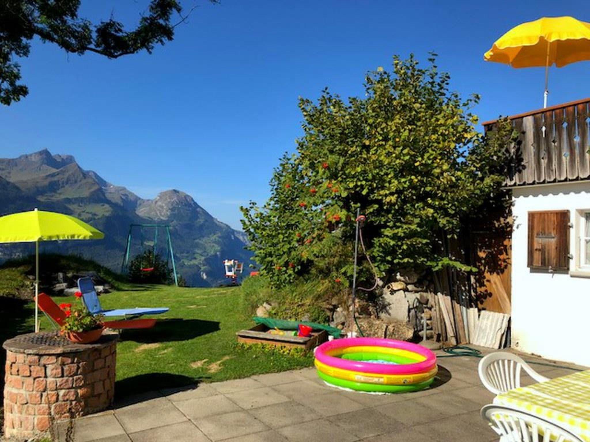 4-bedroom apartment on the upper floor in a two-family chalet. Private parking space at house access. The holiday home has an electric kitchen with dishwasher, living room with TV, 4 bedrooms and a shower with WC. Washing machine and dryer for exclusive use. Balcony and terrace. Living area approx. 100 m2. During the summer season the garden with children's playground and fireplace can be used. In winter Skihäsli taxi stop less than 100 m next to Chalet Gibu, ski slope accessible by ski. Wi-Fi available, Nespresso machine, microwave and toaster also on site. Balcony around the front of the house with beautiful valley view or mountains/summits as well as garden terrace with "evening sun." View of Badsee (approx. 75 metres in altitude below the property). In high summer, a "children's pool" can be set up on request on the house square. Ping pong table available as well as basketball basket.