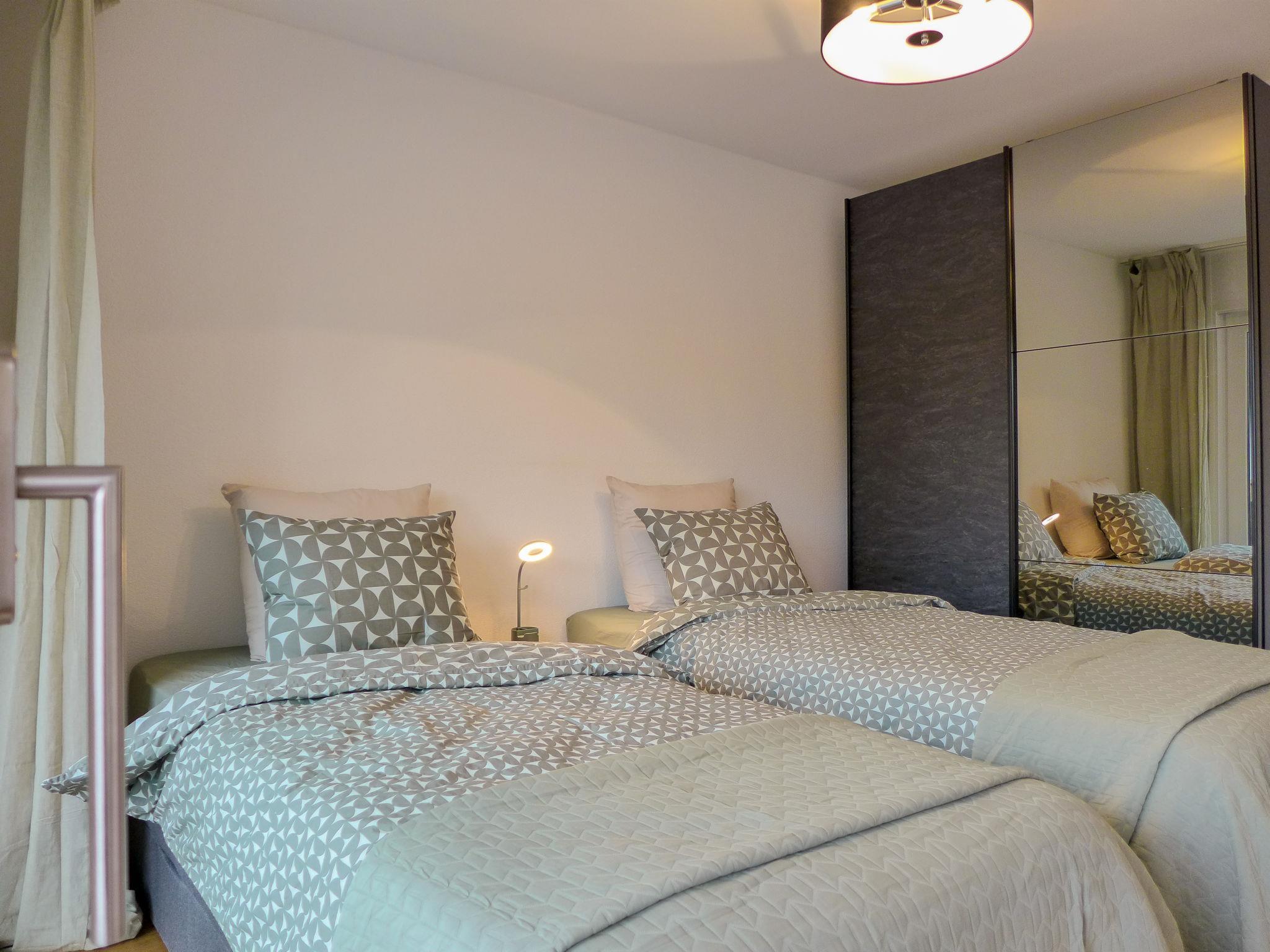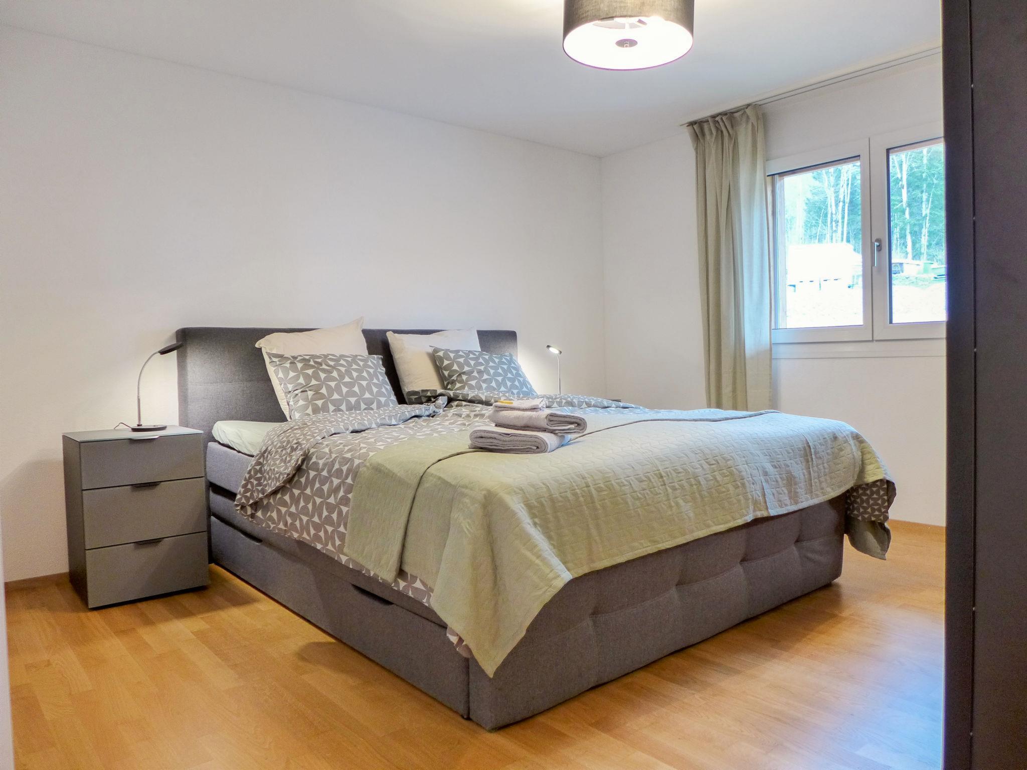 "Ibex", 3-room apartment 68 m2 on 1st floor, south facing position. Spacious and bright, comfortable and tasteful furnishings: open living/dining room with panoramic window with dining table, digital TV and flat screen. Exit to the balcony. 1 large room with 1 double bed (180 cm, length 200 cm). 1 room with 2 beds (90 cm, length 200 cm). Exit to the balcony. Open kitchen (oven, dishwasher, 4 ceramic glass hob hotplates, kettle, freezer, electric coffee machine, Capsules for coffee machine (Nespresso) extra, fondue Set (cheese)). Shower/WC. Underfloor heating. Large balcony, south facing position. Balcony furniture. Marvellous panoramic view of the mountains and the countryside. Facilities: children's high chair, baby cot for up to 2 year olds (extra), hair dryer. Internet (WiFi, free). Parking (roofed, 2 cars). Please note: non-smokers only. Maximum 1 pet/ dog allowed. Smoke alarm, fire extinguisher.