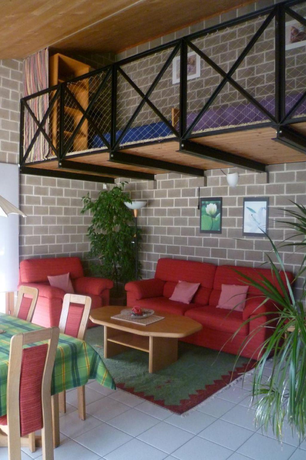 The interior of the flat is characterised by its cosy living room with integrated kitchen and WC on the ground floor. A spiral staircase leads down to the bedroom with a double bed and a shower room with another WC. Above the living room, an open gallery with two single beds invites you to linger. The flat is designed to comfortably accommodate 2 adults and 2 children.