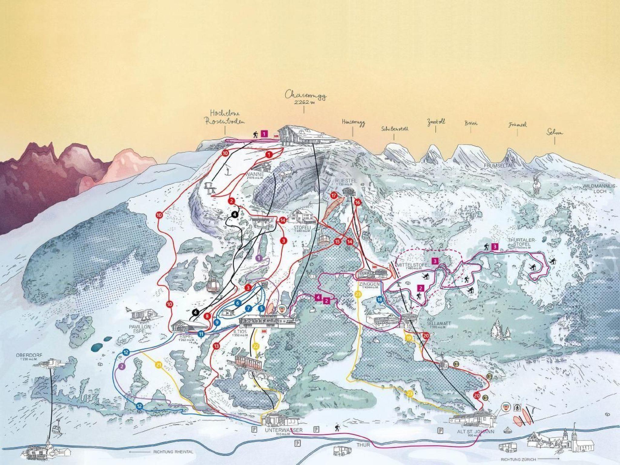 Adjacent to the garden, the smaller room offers direct access to a spacious picnic area, perfect for enjoying meals amid nature's embrace. Additionally, a Pavilion awaits in front of the studio, furnished with a cozy sofa, a quaint table, and two inviting chairs, offering picturesque views of the Flumserberg.