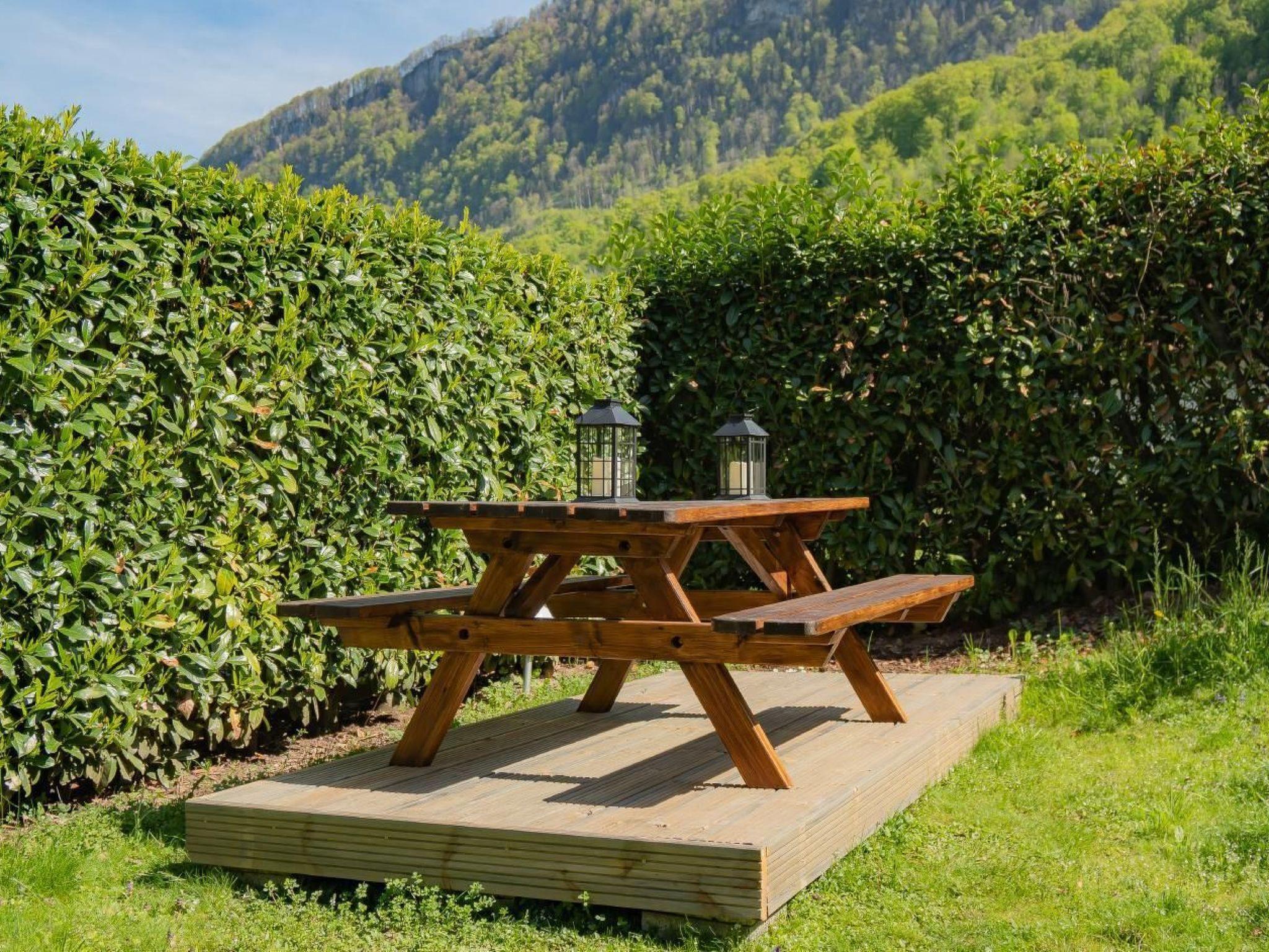 Nestled in the chalet's backyard lies the inviting swimming pool, accessible year-round for guests' enjoyment.