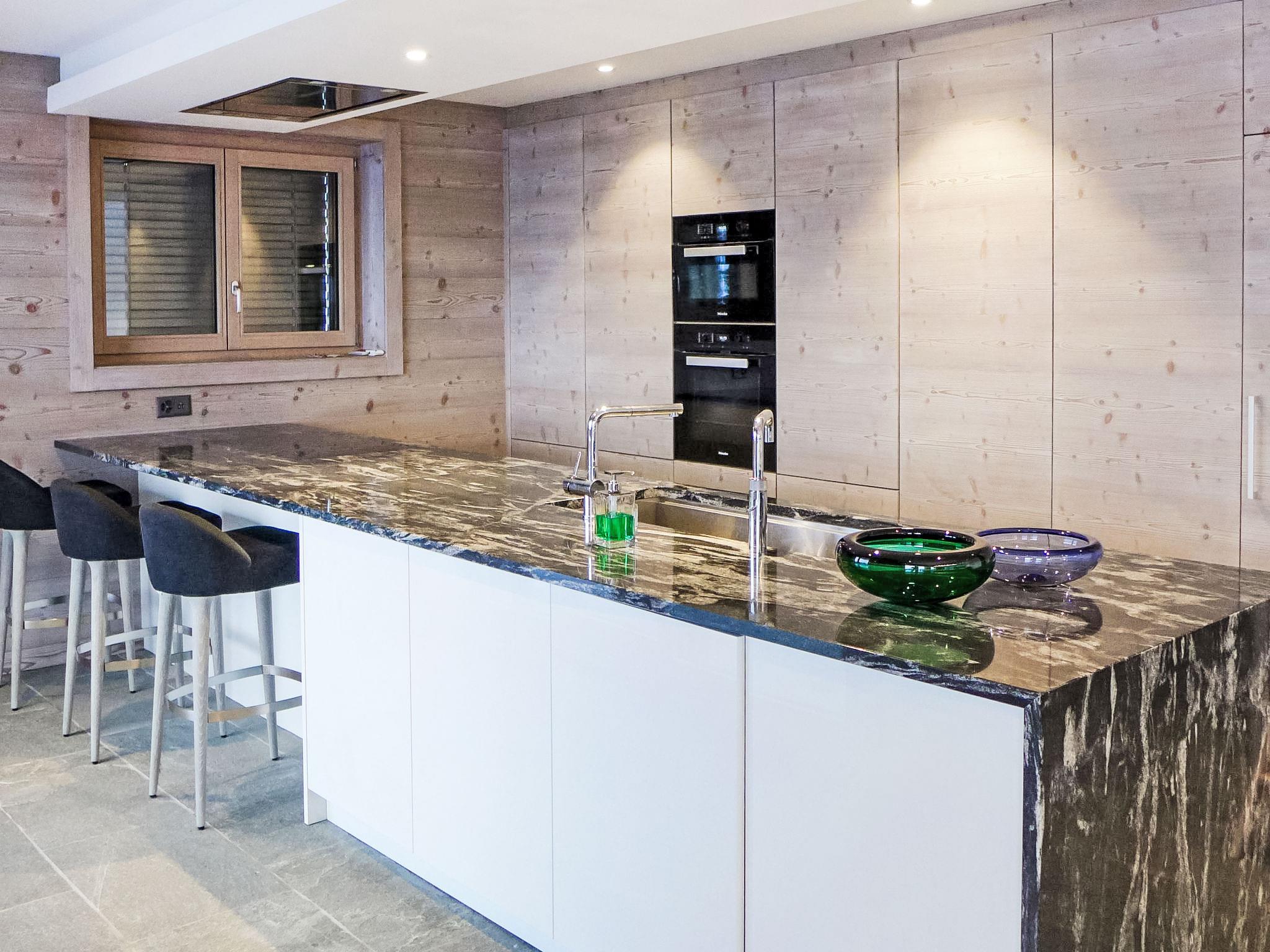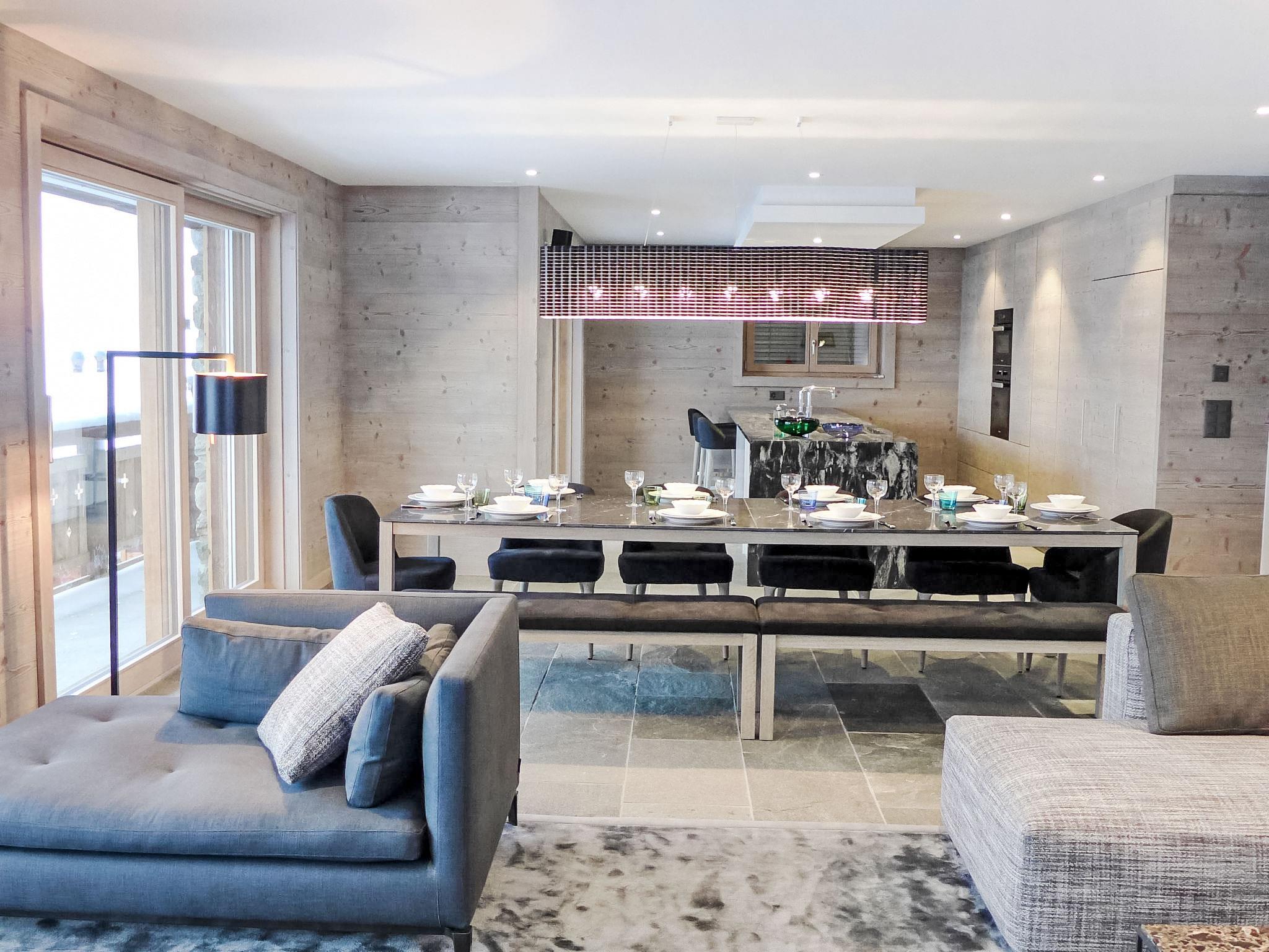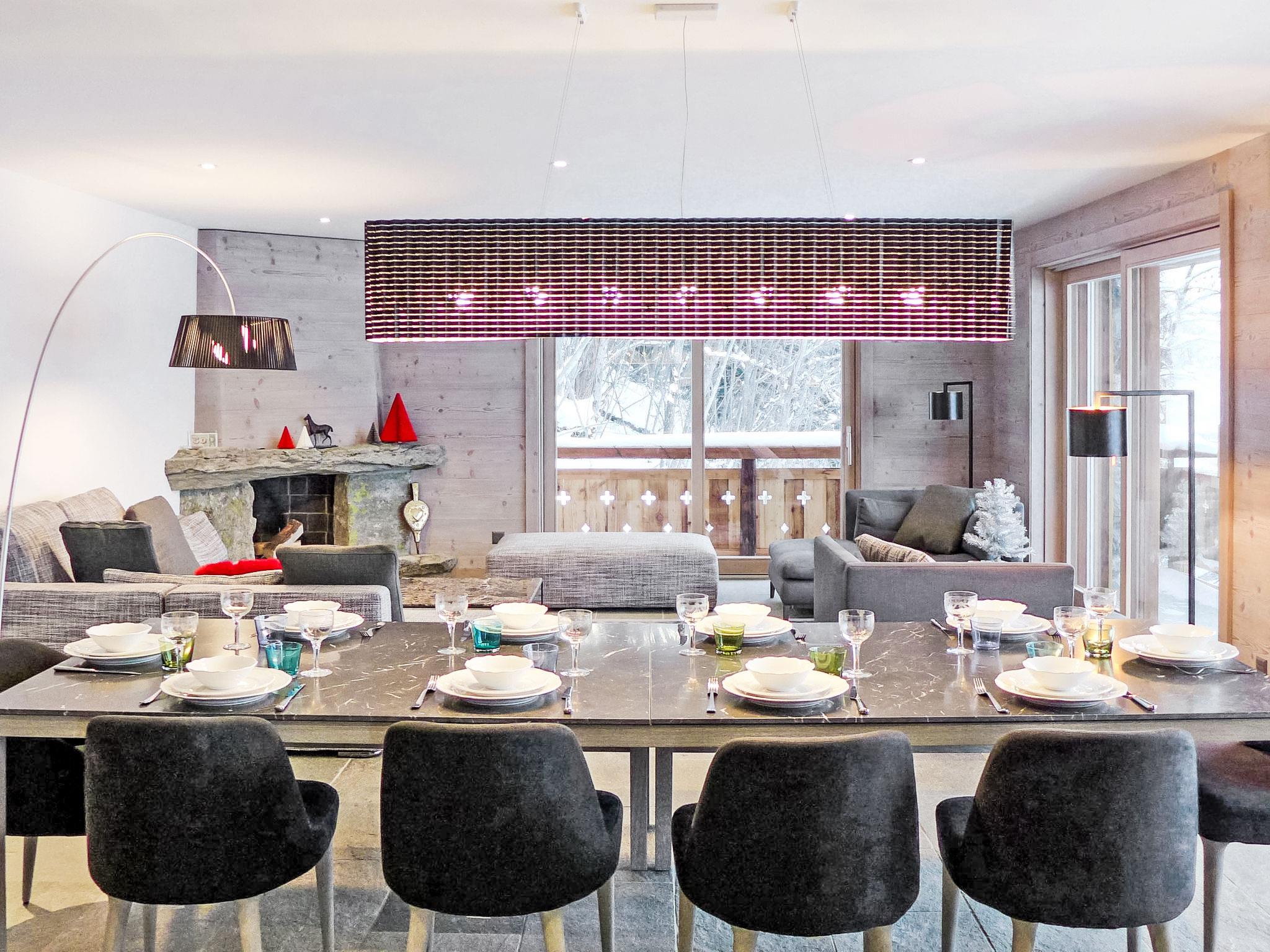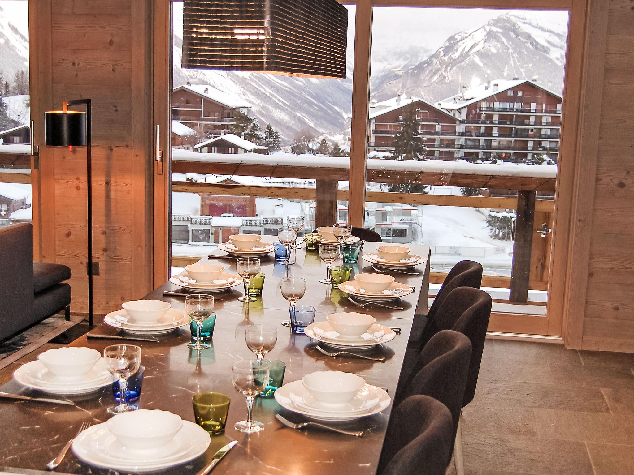 "Le Refuge 1", 6-room maisonette 200 m2 on 1st floor. Spacious, luxurious furnishings: large living/dining room with panoramic window north facing position and west facing position with open-hearth fireplace. Exit to the balcony. Large, open kitchen (oven, dishwasher, 6 induction hot plates, microwave, freezer, electric coffee machine, Capsules for coffee machine (Nespresso) extra, raclette grill, fondue Set (cheese)). On the lower ground floor: 1 large room with Dressing room with 1 french bed (200 cm, length 200 cm), separate WC, shower and double hand-basin. Exit to the terrace. Upper floor: entrance hall. 1 room with 1 french bed (180 cm, length 200 cm), bath/WC. Exit to the balcony, west facing position. 1 room with 1 french bed (180 cm, length 200 cm), shower/WC. 1 children's room with 2 x 2 bunk beds (90 cm, length 190 cm). Exit to the balcony, west facing position. Lounge with cable TV and DVD. Shower/WC, sep. WC. Large balcony, north facing position and west facing position. Beautiful view of the mountains and the resort. Facilities: washing machine, dryer, children's high chair, baby cot, hair dryer. Internet (WiFi, free). Garage (2 cars), height 220 cm, width 500 cm. E-charging station. Please note: suitable for families. Non-smokers only. 4 subscriptions for SPA Bisses during the stay are included in the rental price. This SPA is part of the 4 Valleys Mer de Glace complex. Facilities: 2 dishwashers.