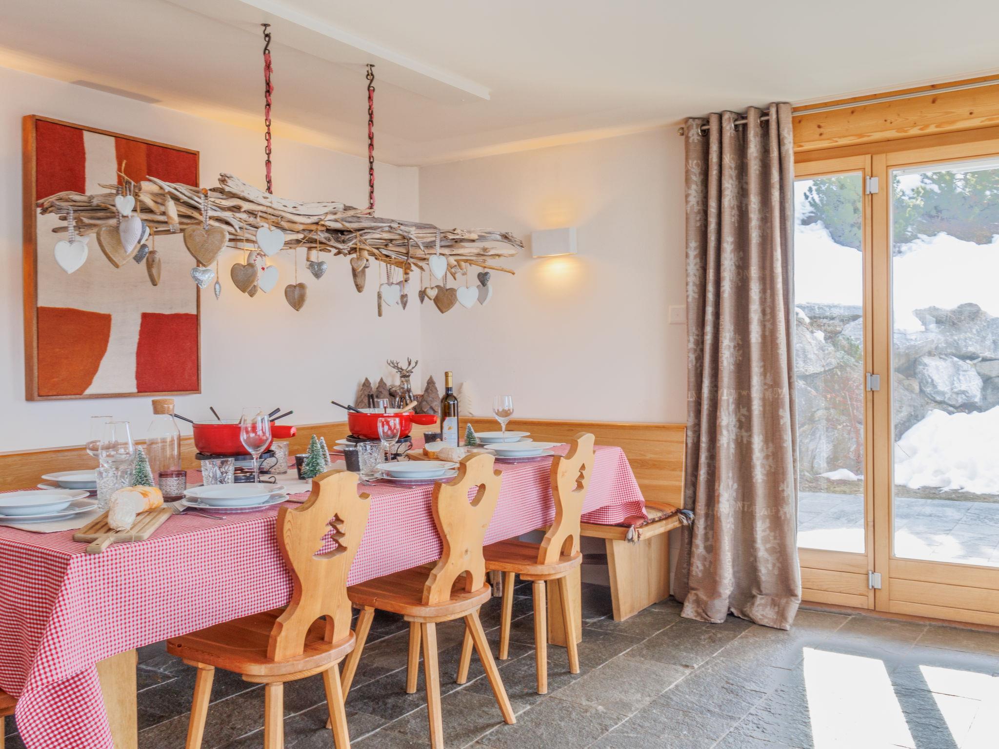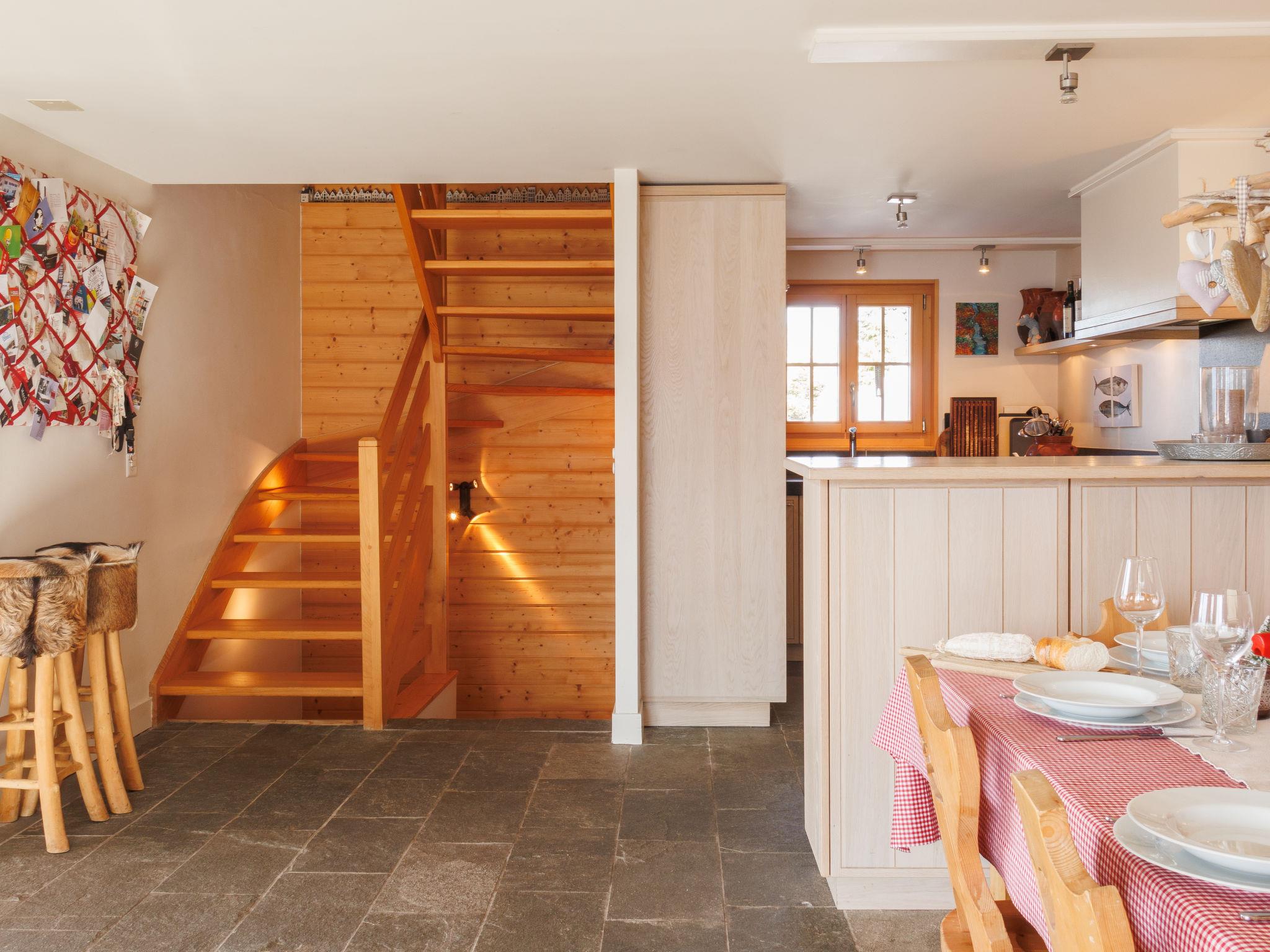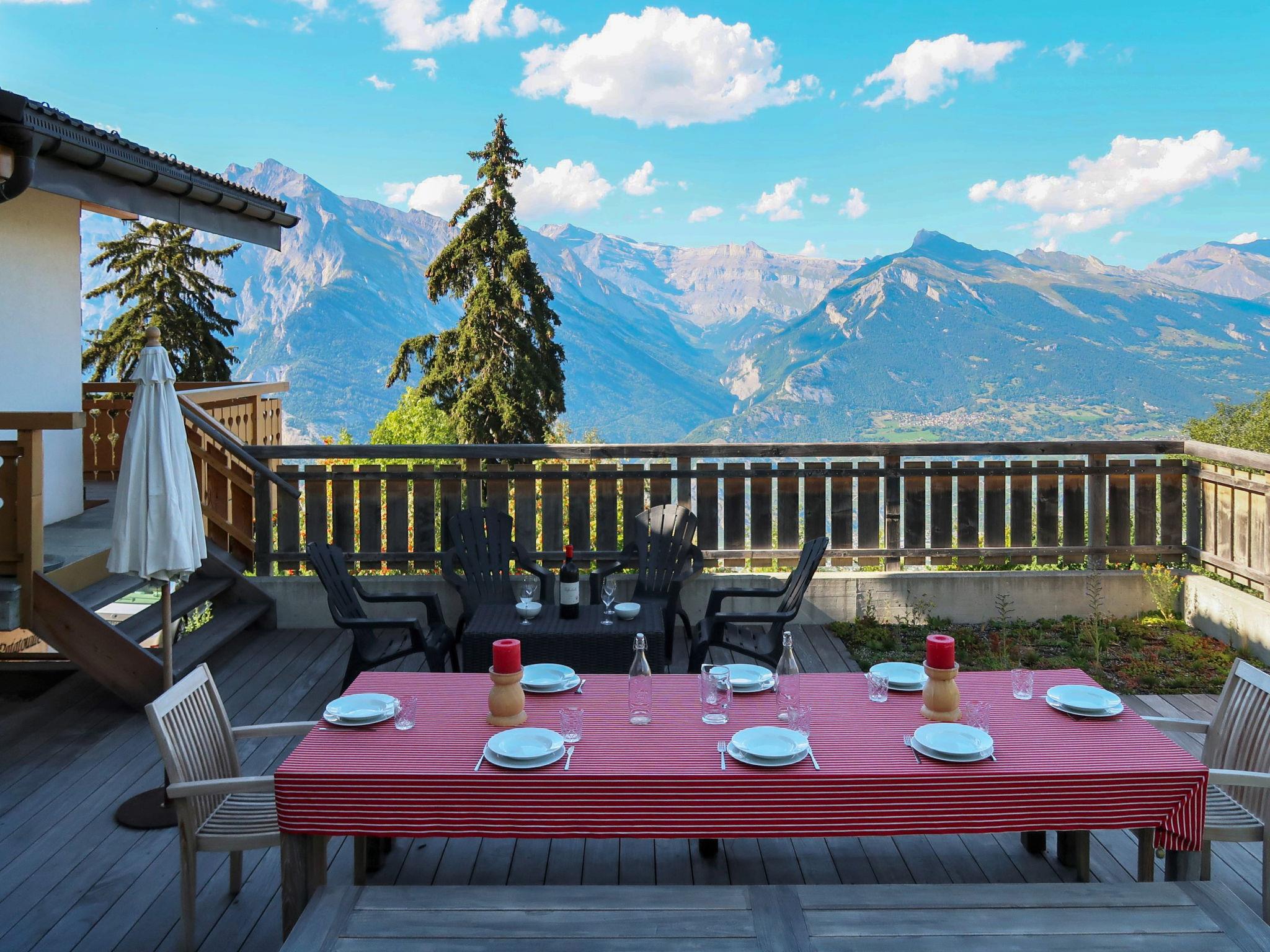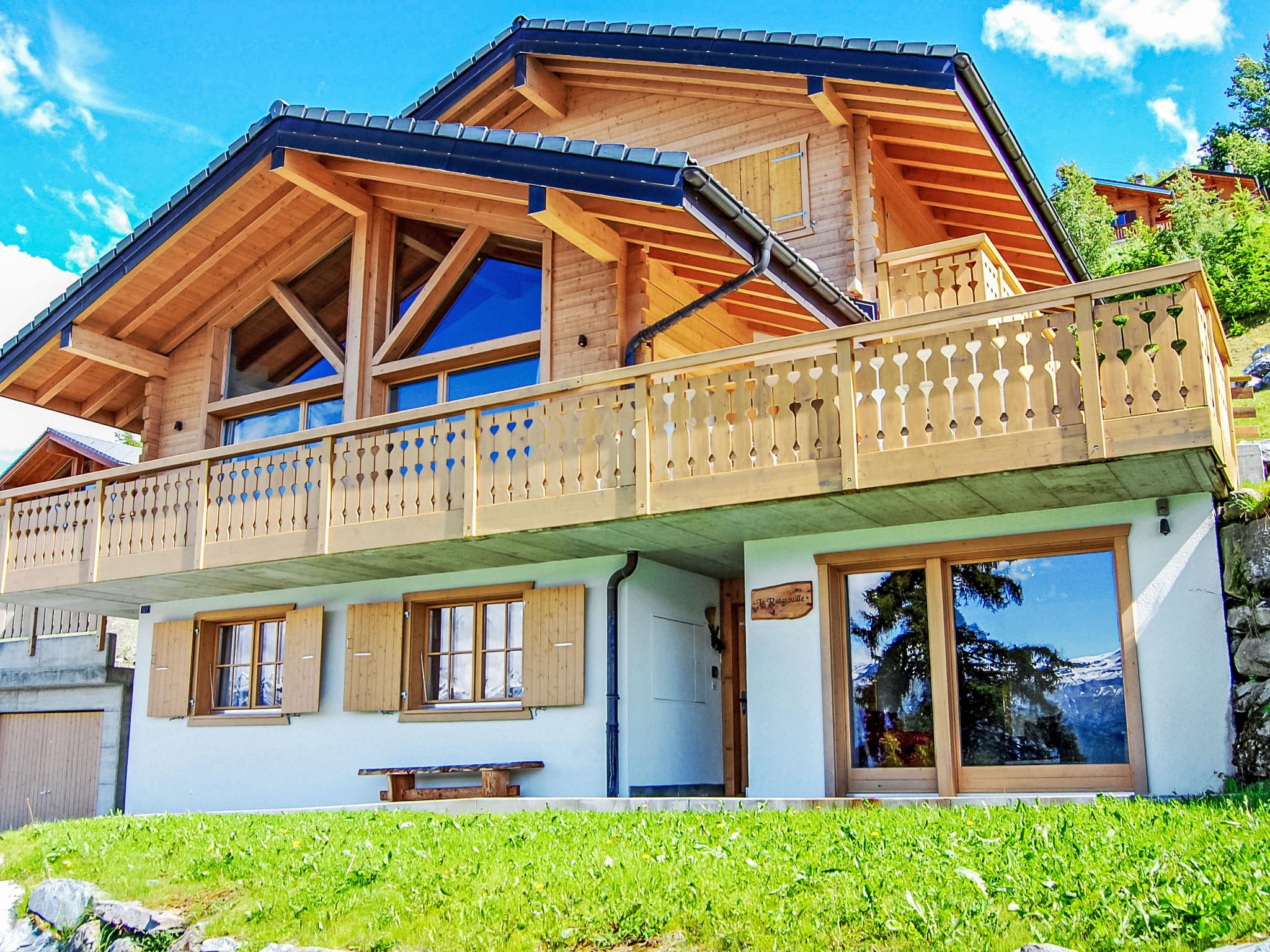 "Ratatouille", 5-room chalet 210 m2 on 3 levels. Beautiful and tasteful furnishings: living/dining room with open-hearth fireplace and satellite TV. Open kitchen (oven, dishwasher, 5 ceramic glass hob hotplates, toaster, kettle, microwave, electric coffee machine, Capsules for coffee machine (Nespresso) extra, raclette grill, fondue Set (cheese)) with bar. Electric heating. On the lower ground floor: 1 room with 1 french bed. 2 rooms, each room with 2 beds (90 cm, length 200 cm). Bath/WC, shower, sep. WC. Upper floor: 1 room with 2 beds (90 cm, length 200 cm). Shower/WC. Natural stone floors. Large balcony, north facing position and west facing position, small balcony, east facing position terrace, west facing position. Terrace furniture, barbecue, deck chairs. Very beautiful view of the mountains and the valley. Facilities: washing machine, dryer, children's high chair, baby cot, hair dryer. Internet (WiFi, free). Garage (2 cars), height 195 cm, width 275 cm. Please note: non-smoking house. Maximum 1 pet/ dog allowed.