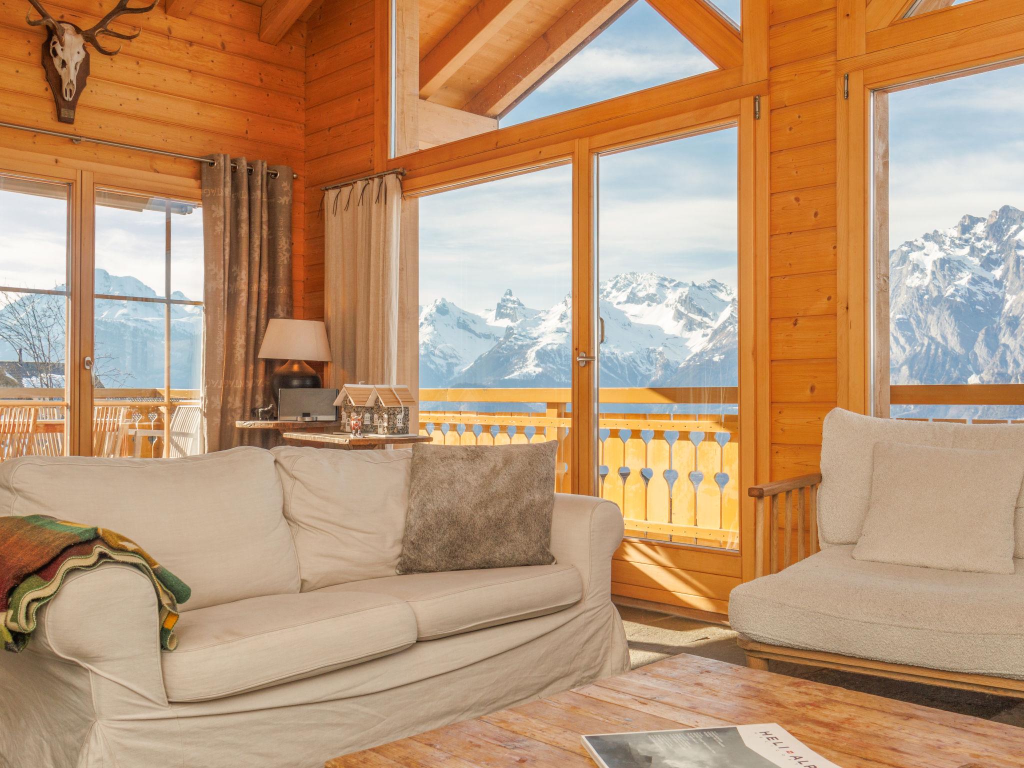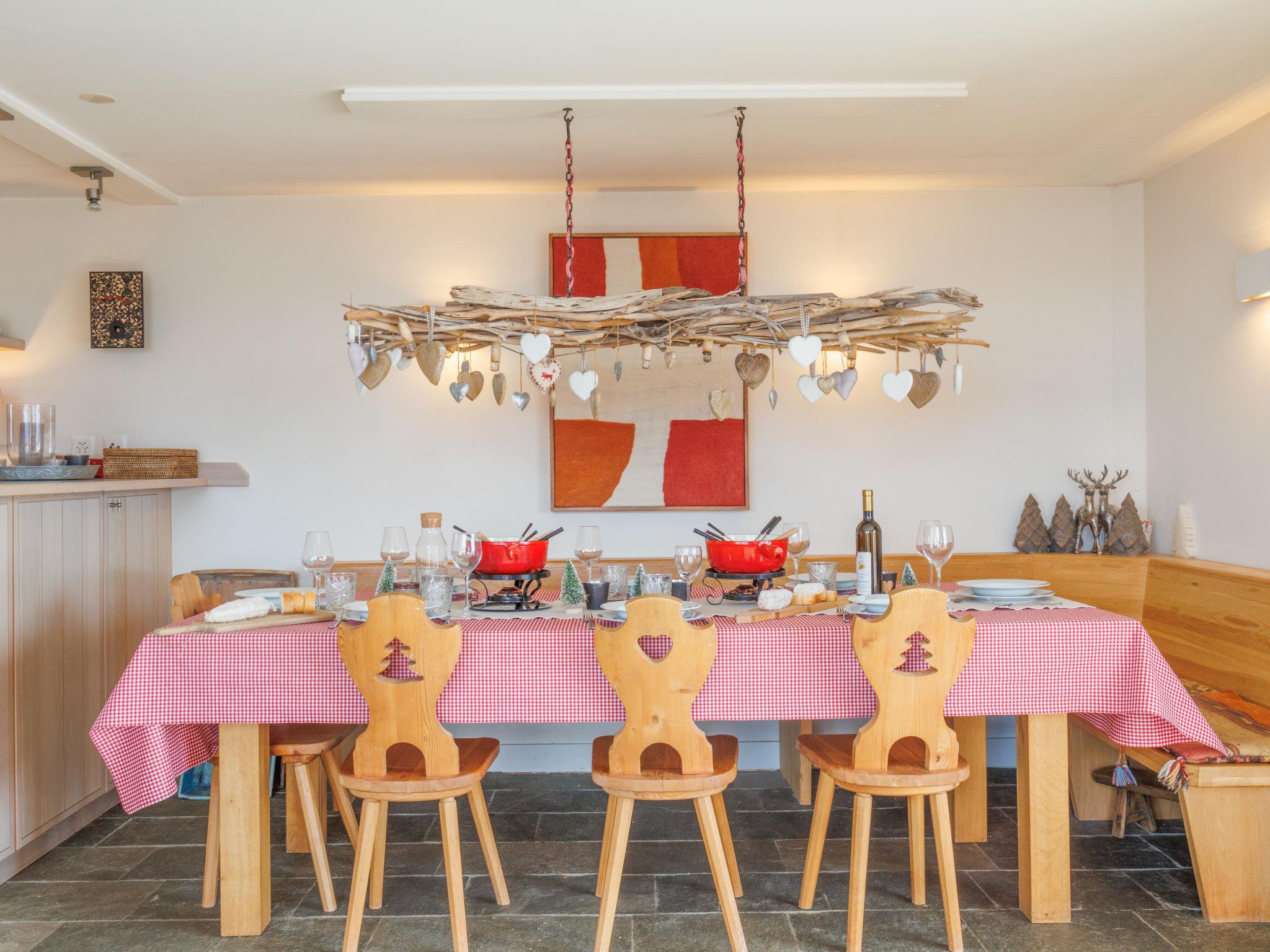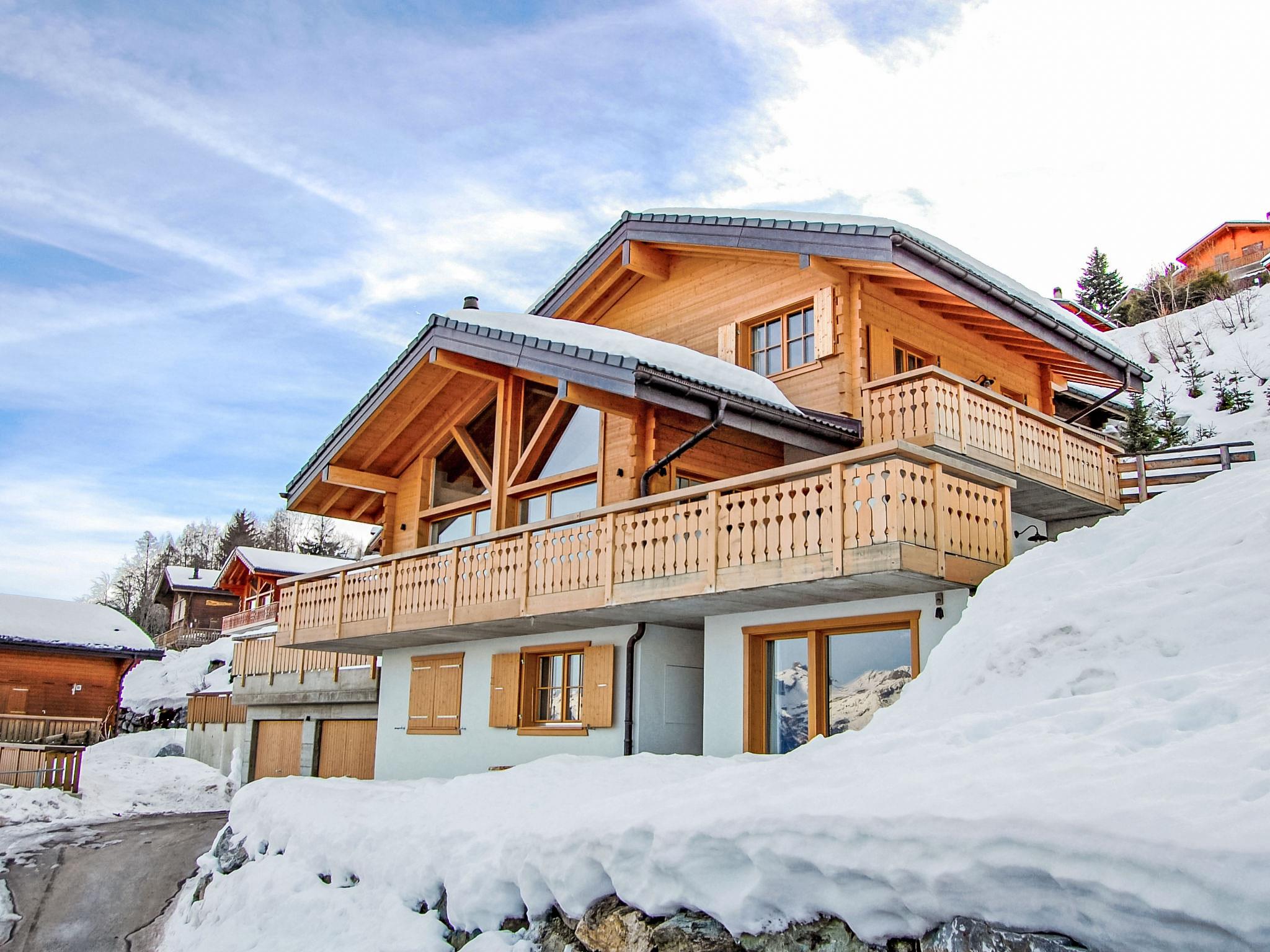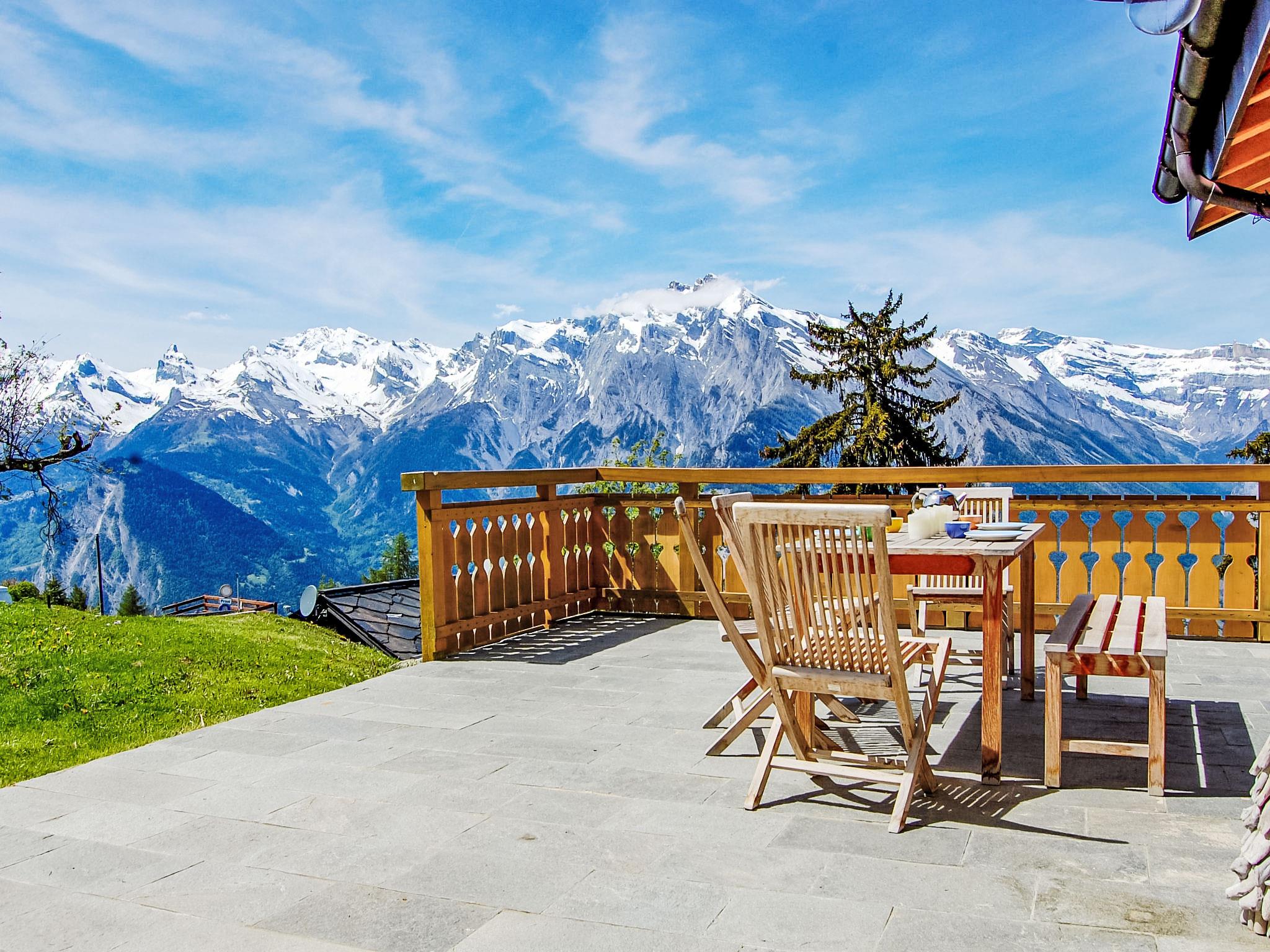 "Ratatouille", 5-room chalet 210 m2 on 3 levels. Beautiful and tasteful furnishings: living/dining room with open-hearth fireplace and satellite TV. Open kitchen (oven, dishwasher, 5 ceramic glass hob hotplates, toaster, kettle, microwave, electric coffee machine, Capsules for coffee machine (Nespresso) extra, raclette grill, fondue Set (cheese)) with bar. Electric heating. On the lower ground floor: 1 room with 1 french bed. 2 rooms, each room with 2 beds (90 cm, length 200 cm). Bath/WC, shower, sep. WC. Upper floor: 1 room with 2 beds (90 cm, length 200 cm). Shower/WC. Natural stone floors. Large balcony, north facing position and west facing position, small balcony, east facing position terrace, west facing position. Terrace furniture, barbecue, deck chairs. Very beautiful view of the mountains and the valley. Facilities: washing machine, dryer, children's high chair, baby cot, hair dryer. Internet (WiFi, free). Garage (2 cars), height 195 cm, width 275 cm. Please note: non-smoking house. Maximum 1 pet/ dog allowed.