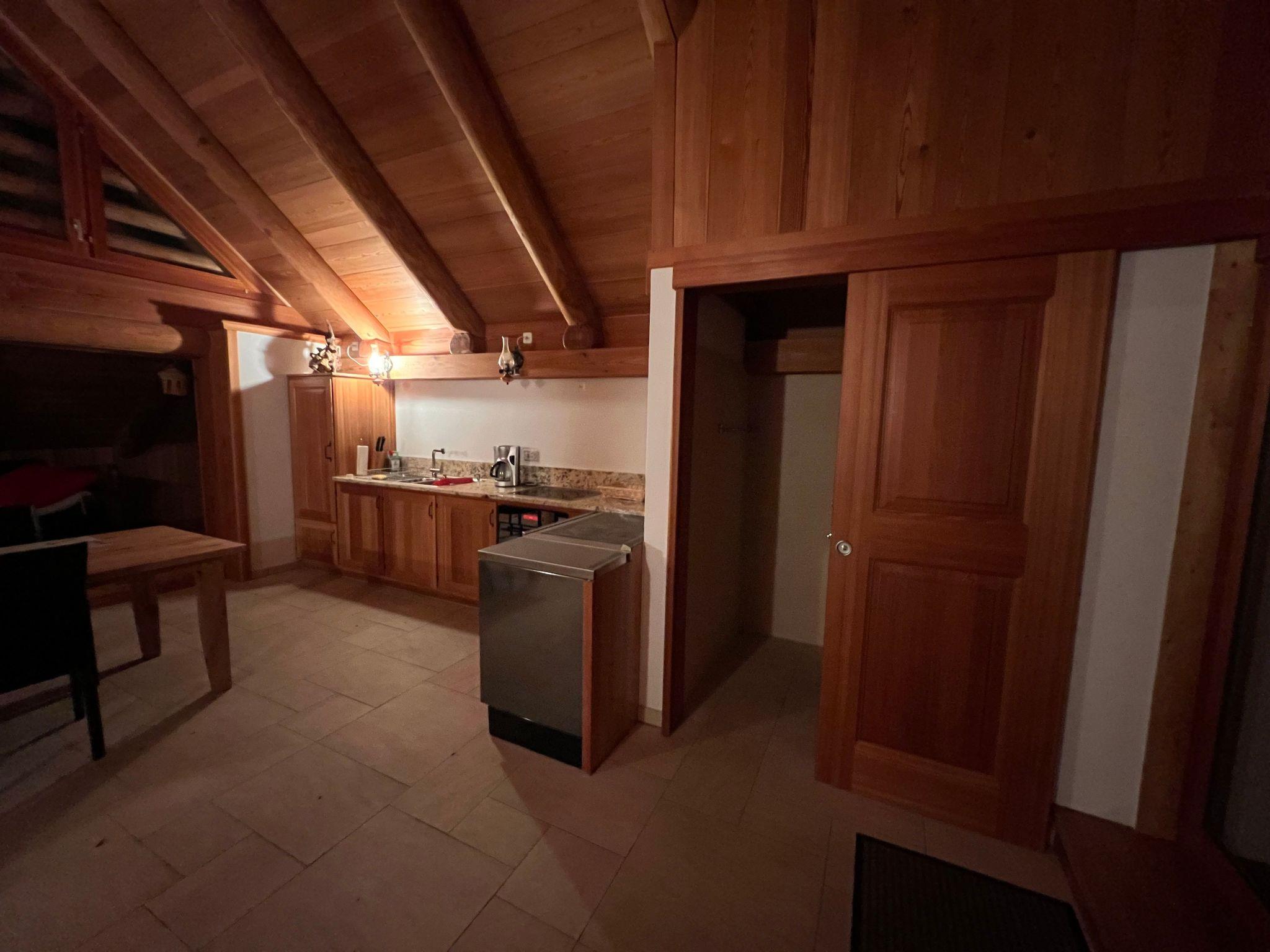 Inside, the villa is equipped with all the necessary amenities to ensure a pleasant and carefree stay. On the ground floor, you will find a darkened bedroom with a double bed, next to a bathroom with shower. Going up to the first floor, you will find a spacious living room equipped with a kitchenette, table and chairs, perfect for sharing meals and moments together. Here, a wood-burning stove adds a touch of warmth and cosiness to the cooler evenings, while the sofa, TV with four Swiss channels and radio offer a variety of ways to relax and entertain.