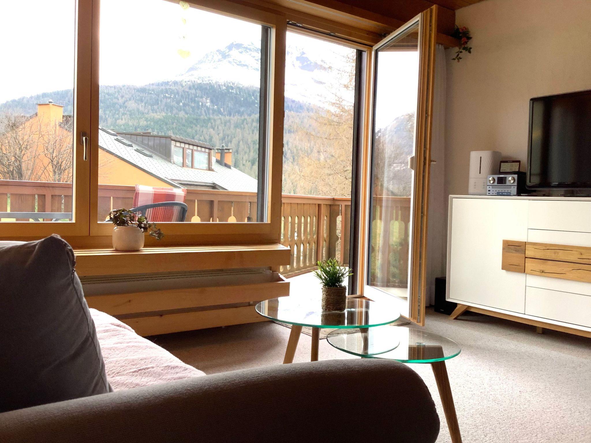 Holiday flat no. 6 is located on the 1st floor of the Azalea house, on Via d'Arövens 14 (quiet street with no through traffic) in the Muragls neighbourhood, close to nature, with a magnificent view of the mountain panorama. The 60 m2 flat is very bright and has modern furnishings with a large flat-screen TV and its own WLAN (fibre optic). It offers a bedroom, a bathroom, an open-plan kitchen, a large living and dining area and a balcony furnished with table, chairs and parasol. The bedroom is furnished with 2 single beds (each measuring 0.90 x 2.00 m, with individually and electrically adjustable slatted frames) and a built-in wardrobe. The bathroom has a bathtub (bath and shower option), a hairdryer and hand and bath towels are available. The kitchen is fully equipped with a large fridge (with freezer compartment), coffee machine (Nespresso system), dishwasher, fondue dishes and raclette oven. In the communal areas of the house you will also find a laundry room with washing machine and tumble dryer, a storage room for your bicycles as well as a ski room and garage parking space.