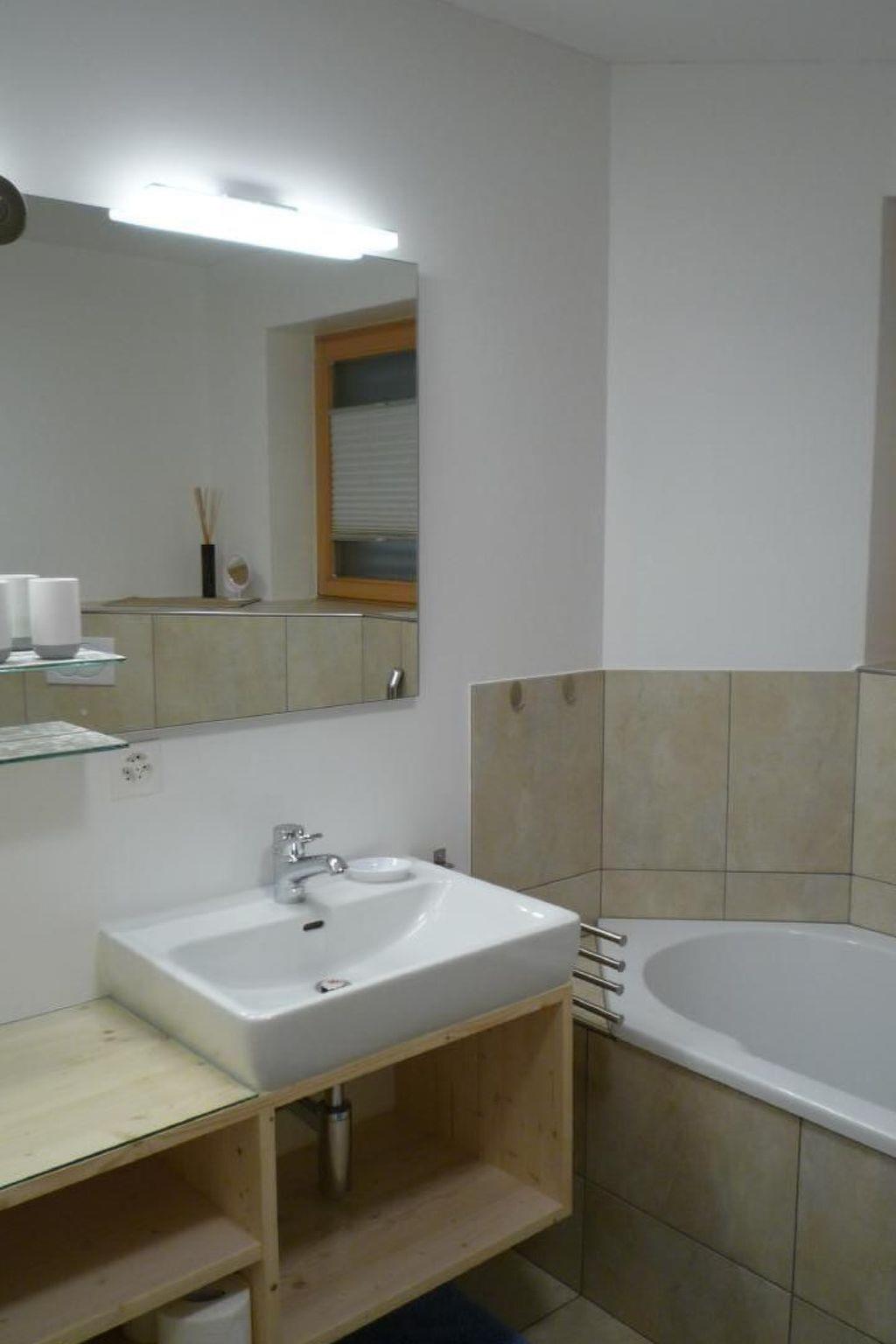 Bathroom: A wet room with bathtub, separate shower, large washbasin, WC and plenty of storage space and separate WC with washbasin.
