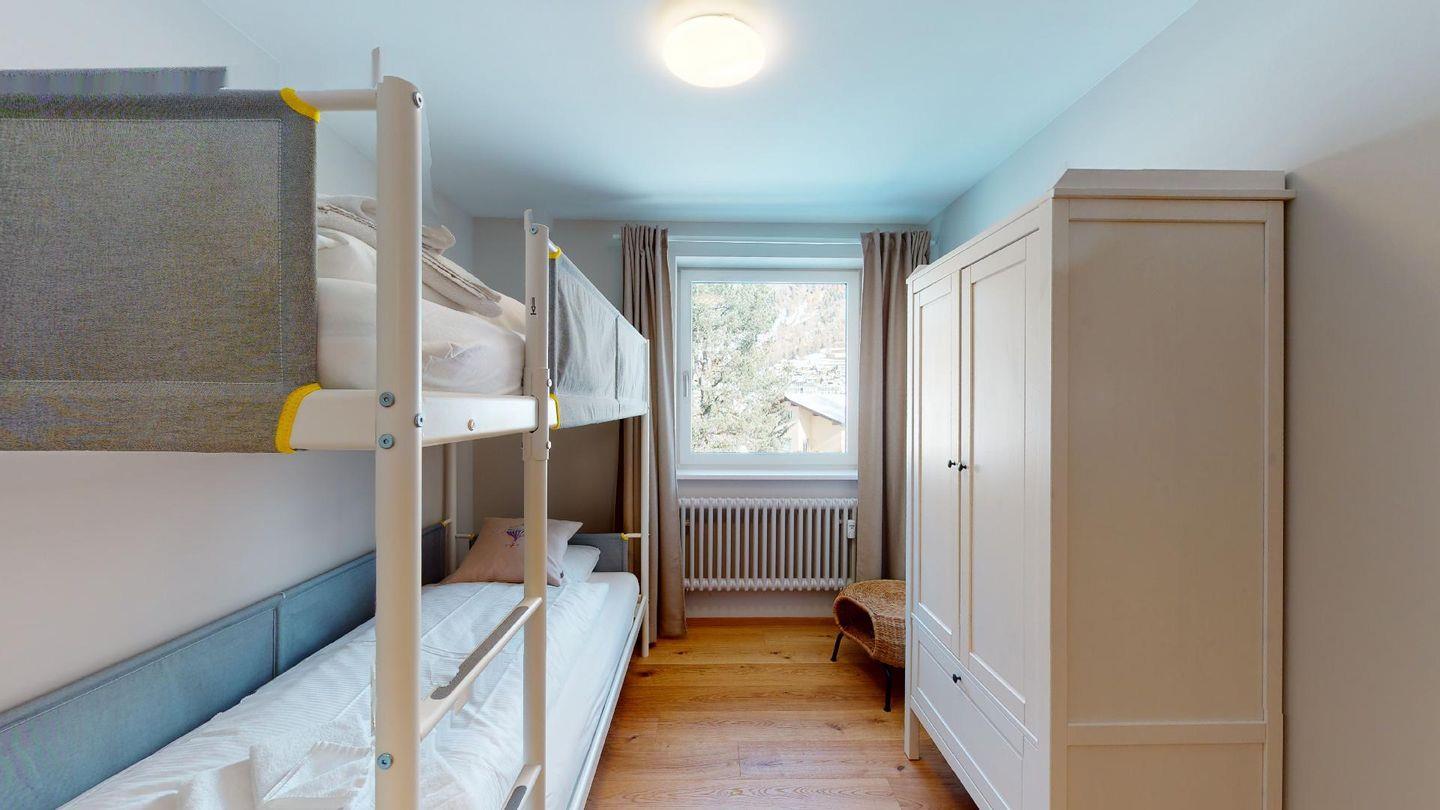 2. Stock: Zwei Doppelschlafzimmer, eines davon mit Balkon und ein Schlafzimmer mit Etagenbett. Ein Badezimmer.
