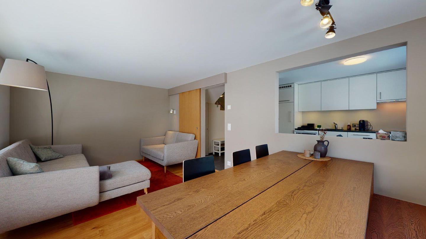 Im 2020 renovierte 5½-Zimmer Wohnung (106m2) im 1. Stock, auf zwei Etagen verteilt. 1. Stock: Halboffene Küche mit Kühlschrank, Herd, Ofen, Geschirrspüler, Chicco d'Oro Kaffeemaschine und grosser Durchreiche zum Esstisch. Wohn-/ Esszimmer mit grossem Esstisch, Sofa und Balkon. Ein Schlafzimmer/TV-Zimmer mit Doppelbett, Sofa, Smart-TV (bitte eigene Netflix und Amazon Logindaten mitbringen) und eigenem Badezimmer. Ein Gäste-WC.