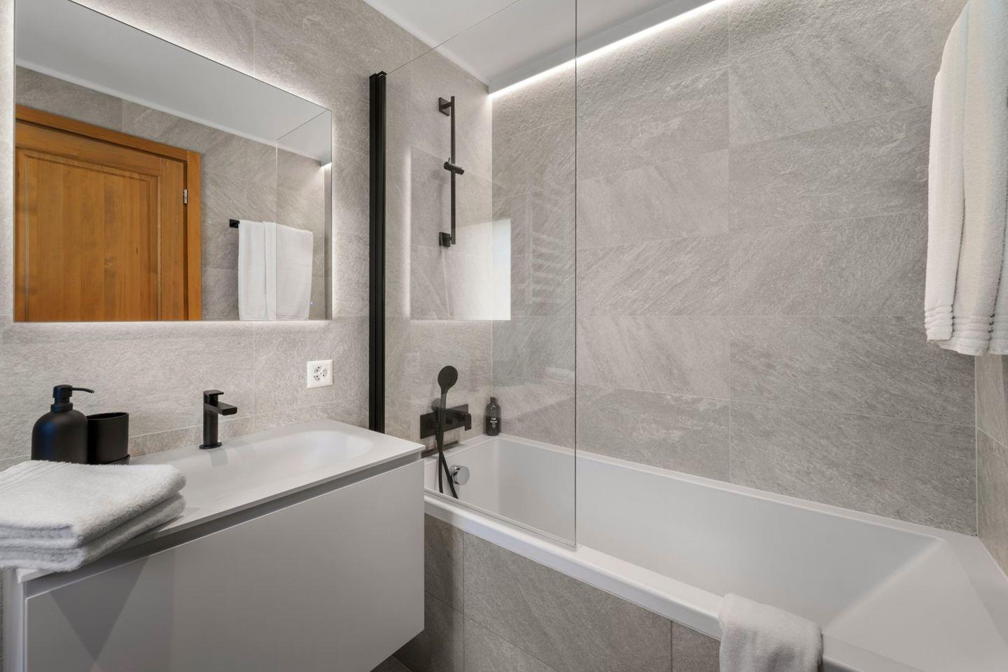 Neue 3½ Zimmerwohnung im 1. Stock, ca. 94m². Eingang zum Wohnzimmer mit offener Küche und Gartensitzplatz. Ein Schlafzimmer mit eigenem Badezimmer mit Wanne. Ein Schlafzimmer mit zwei Einzelbetten. Badezimmer mit Dusche. Zugang über die Aussentreppe oder mit dem Lift. Ein Parkplatz. Gemeinschaftliche Waschküche und Ski-/ Veloraum. Haustiere sind erlaubt.