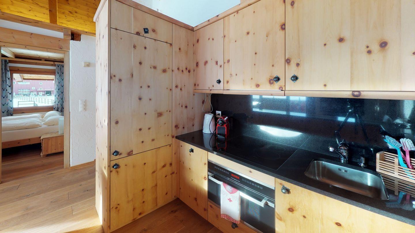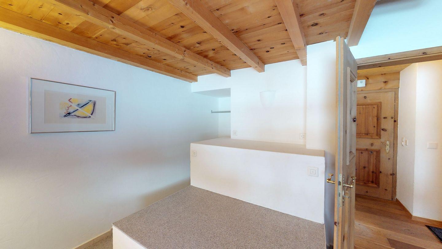 Die Wohnung verfügt über ein grosszügiges Wohnzimmer mit offener Küche. Vom Wohnzimmer aus gelangt man auf den Balkon mit herrlichem Blick Richtung St. Moritz und dem Piz Mezdi. Die zwei Schlafzimmer sind einmal mit einem Doppelbett und einmal mit einem Etagenbett ausgestattet. Ein weiteres Zimmer, welches als Garadobe und Abstellzimmer dienen kann, steht den Gästen zusätzlich zur Verfügung.