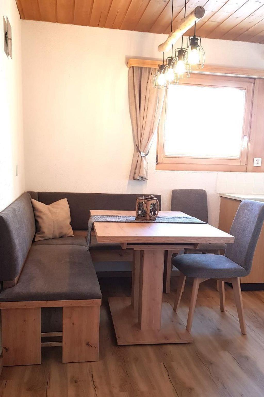 Our cosy flat, furnished with attention to detail, awaits you on the second floor of our apartment building. It offers a comfortable two-and-a-half room flat with balcony, ideal for couples or families. Relax in the living room with a pull-out sofa bed, which offers space for an additional person or two children. A wood-burning stove, complemented by a typical Samnaun stove couch, provides warmth and a cosy atmosphere. A fully equipped kitchen with dining area, a double bedroom and a bathroom/WC round off the living area. Free WLAN is also available, and we offer a bread roll service for a perfect start to the day.