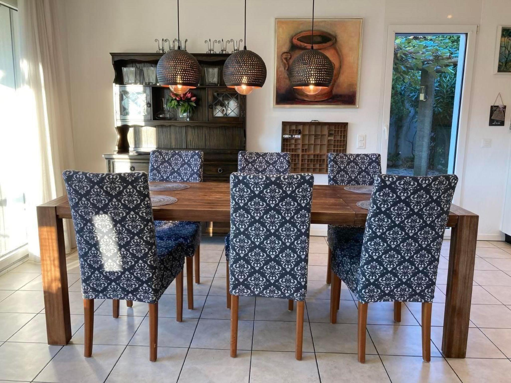 - open-plan living/dining area with fireplace, dining table for 6 people