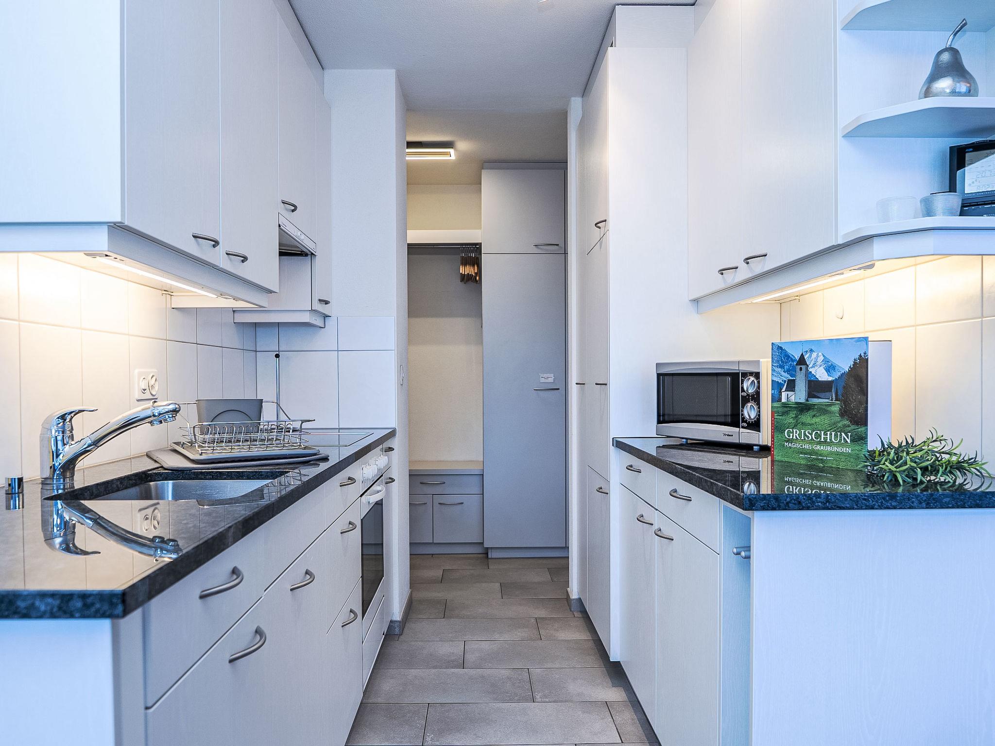 "Chesa Fleury", 2-room apartment 60 m2 on 3rd floor. Fully renovated in 2025, comfortable furnishings: living/dining room with winter garden with dining table and TV (flat screen). Exit to the balcony, south-west facing position. 1 double bedroom with 1 french bed (160 cm, length 200 cm). Open kitchen (oven, dishwasher, 4 ceramic glass hob hotplates, toaster, kettle, electric coffee machine, Capsules for coffee machine (Nespresso) extra, fondue Set (cheese)) with dining table. Exit to the balcony. Bath/WC. Heating. Parquet floors. Small balcony. Balcony furniture. Side view of the mountains and the resort. Facilities: hair dryer. Internet (WiFi, free). Garage (1 car), height 195 cm, width 205 cm. Please note: non-smokers only, non-smoking house.