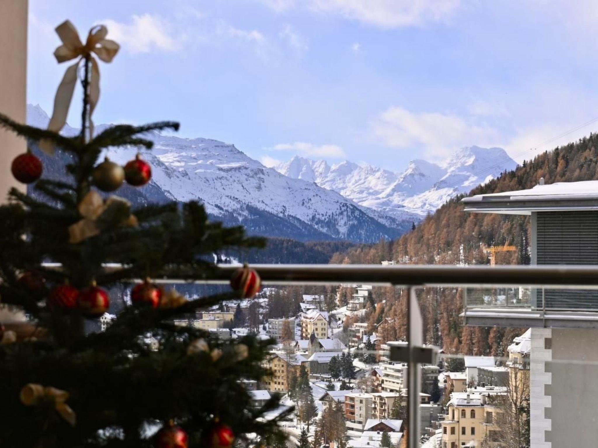 From the balcony you have a spectacular view of the Engadine mountains, the lake and St. Moritz. In the evening, when the sun goes down, this view is particularly beautiful, especially when the lights of St. Moritz come on.