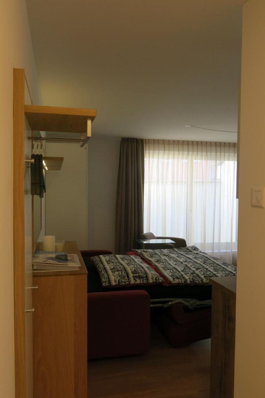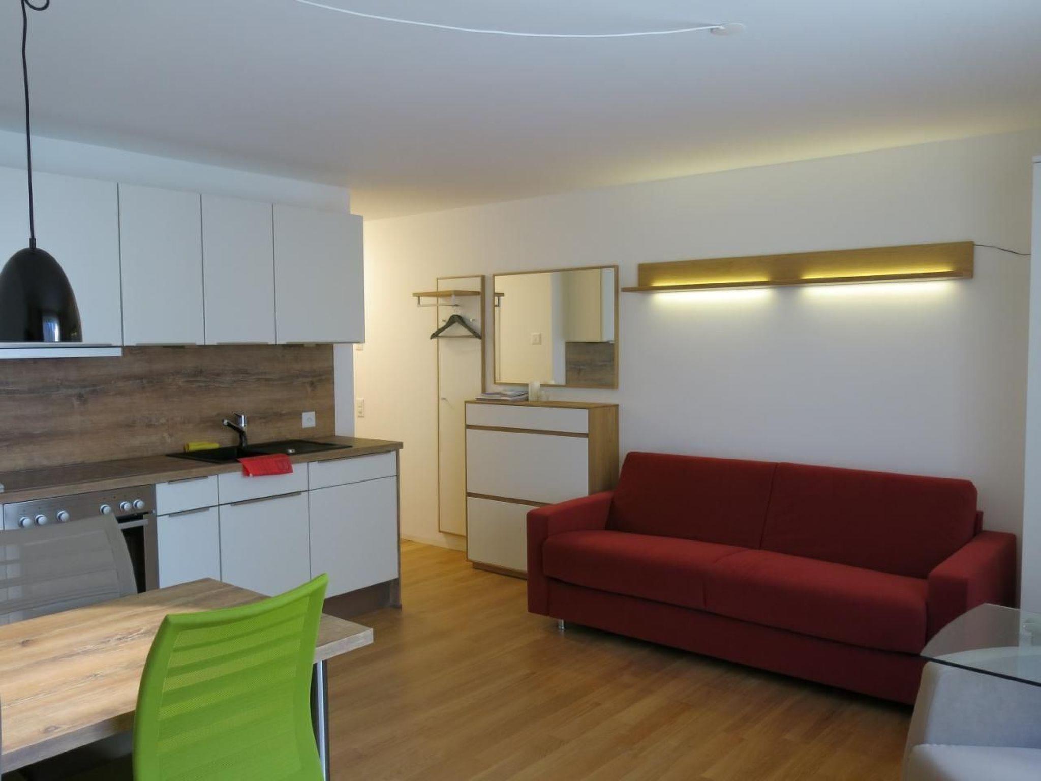 Although the outside area of the studio is modest, as it is located on the level of the cellar compartments, the direct daylight makes it pleasant to spend time inside, even if the view is limited. Nevertheless, the prime location provides direct access to the region's stunning outdoor activities.