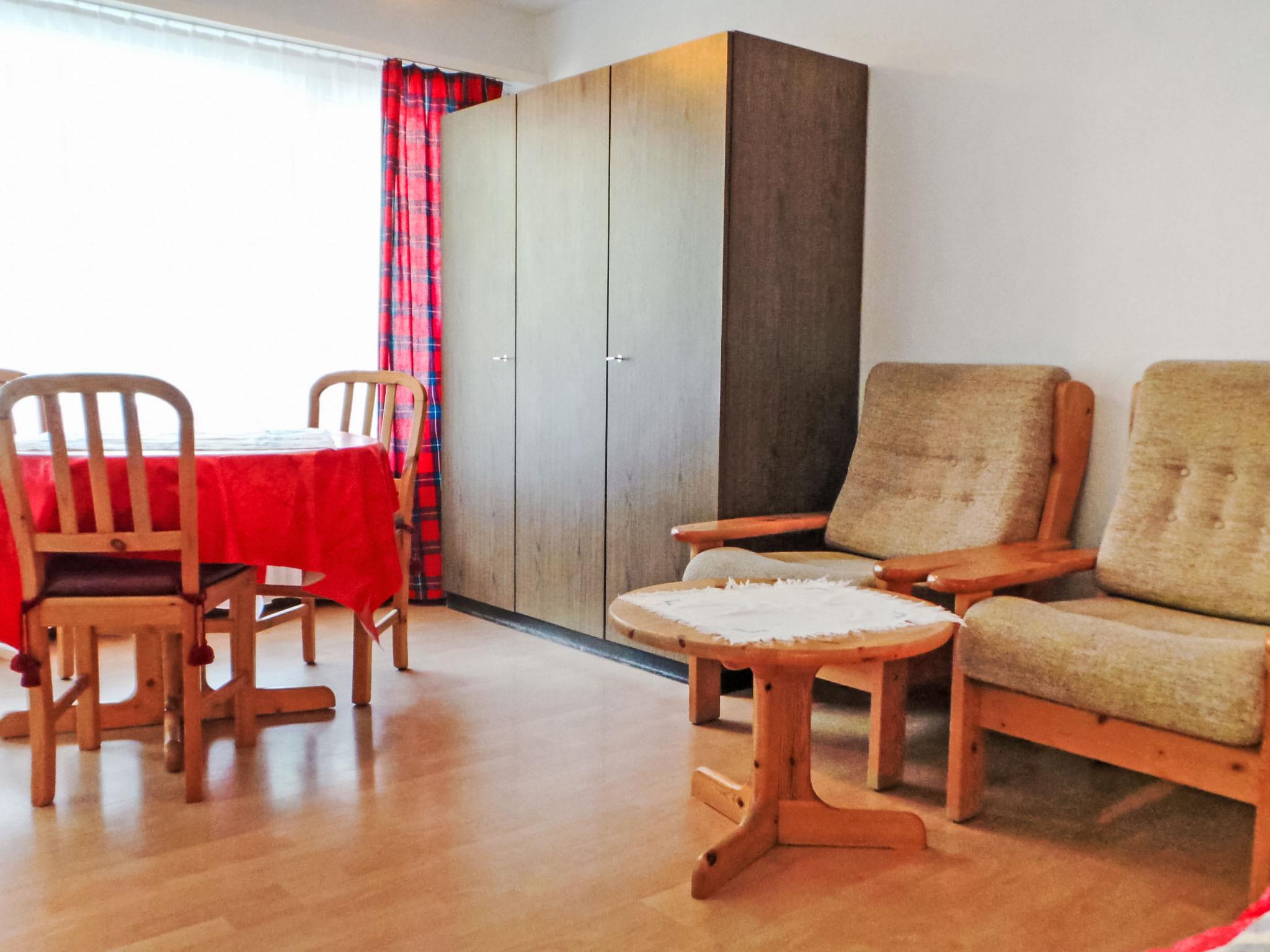 1-room apartment 30 m2, on the ground floor. Simple and practical furnishings: living/sleeping room with 1 double bed (2 x 90 cm, length 200 cm), dining table, cable TV and radio. Exit to the balcony. Kitchen (3 hot plates, toaster, kettle, freezer, electric coffee machine, fondue Set (cheese)). Bath/WC. Balcony 8 m2, east facing position. Balcony furniture. View of the mountains. Facilities: hair dryer. Internet (WiFi, free). Please note: non-smokers only. Maximum 1 pet/ dog allowed.