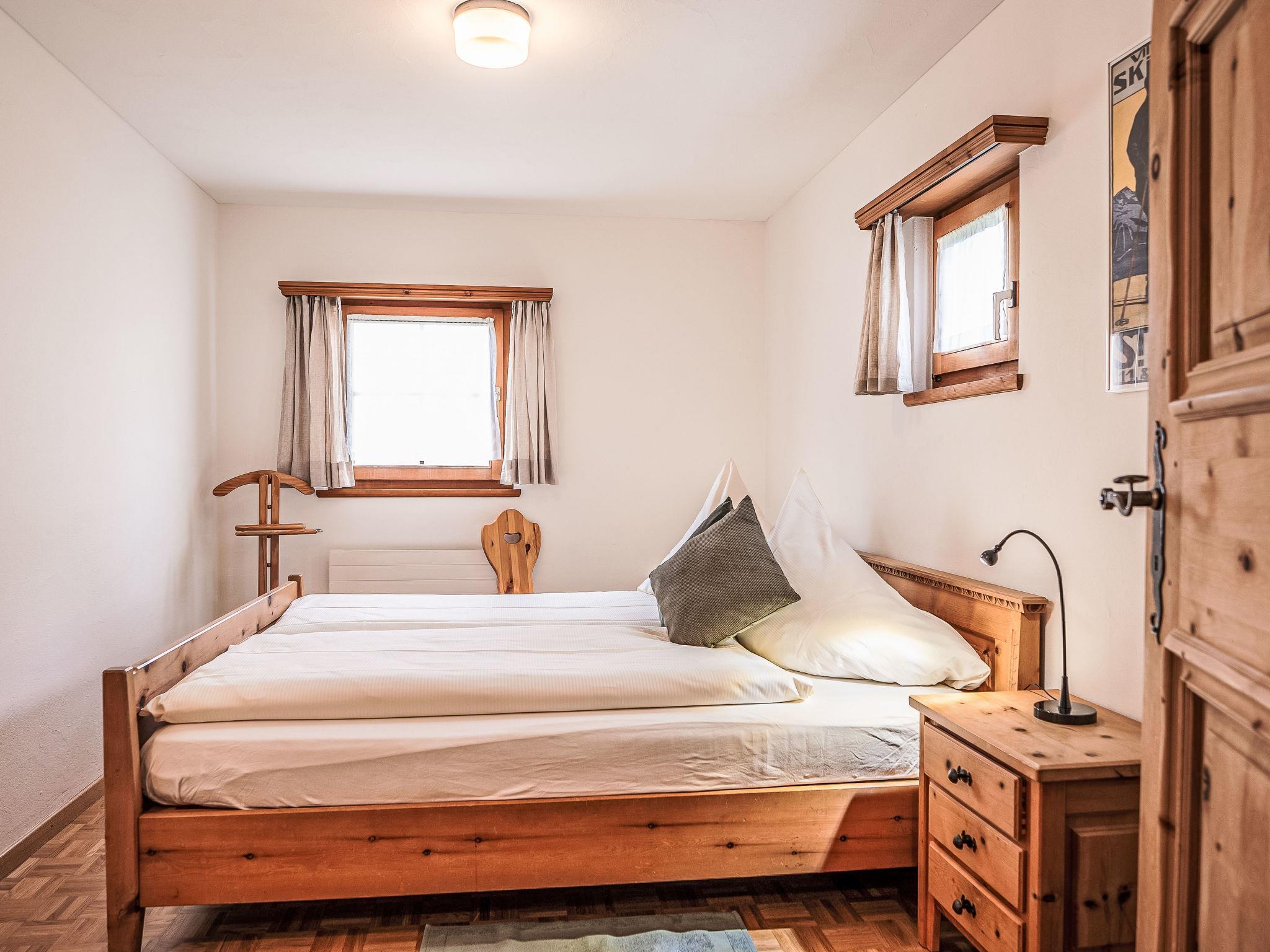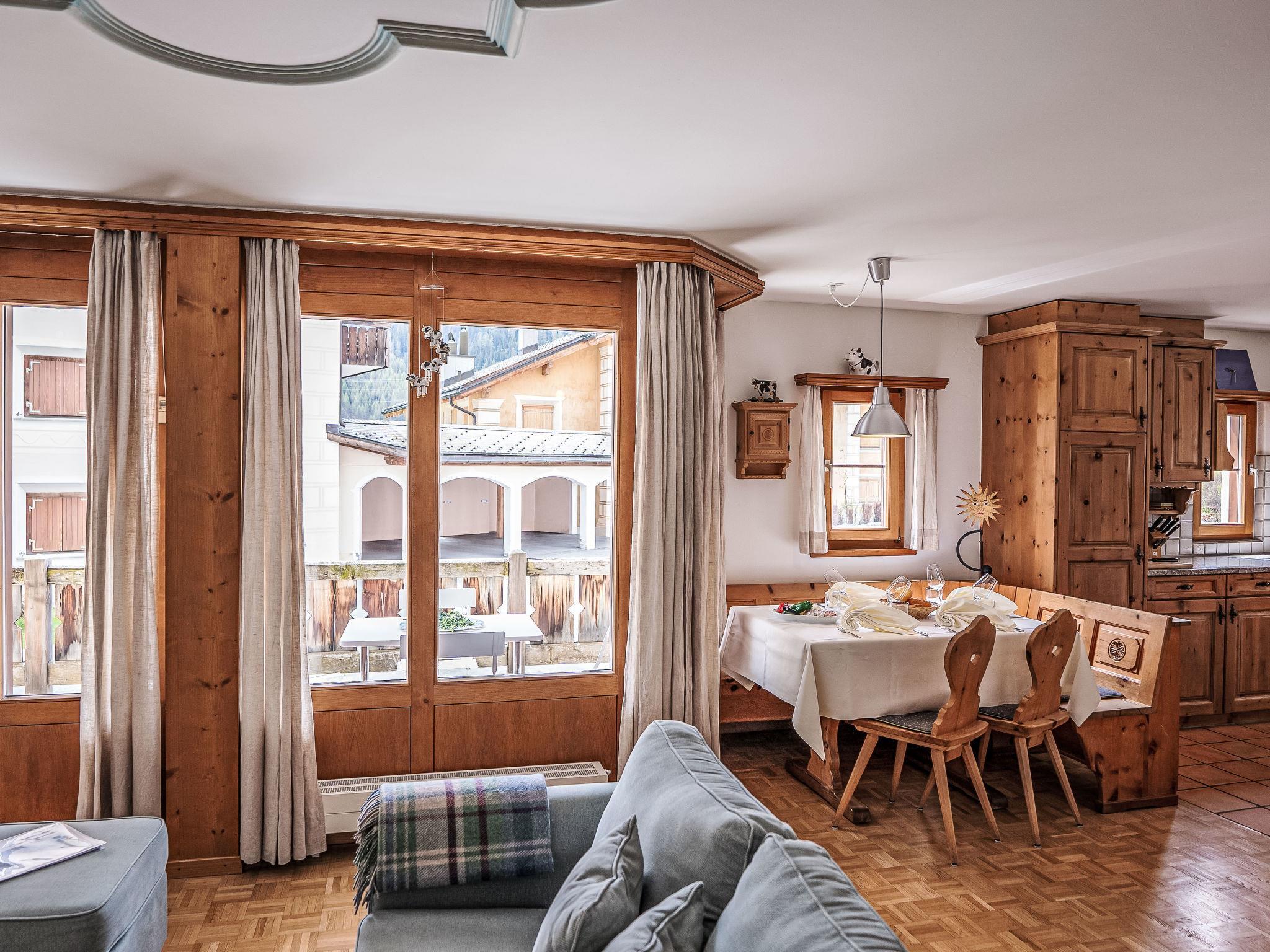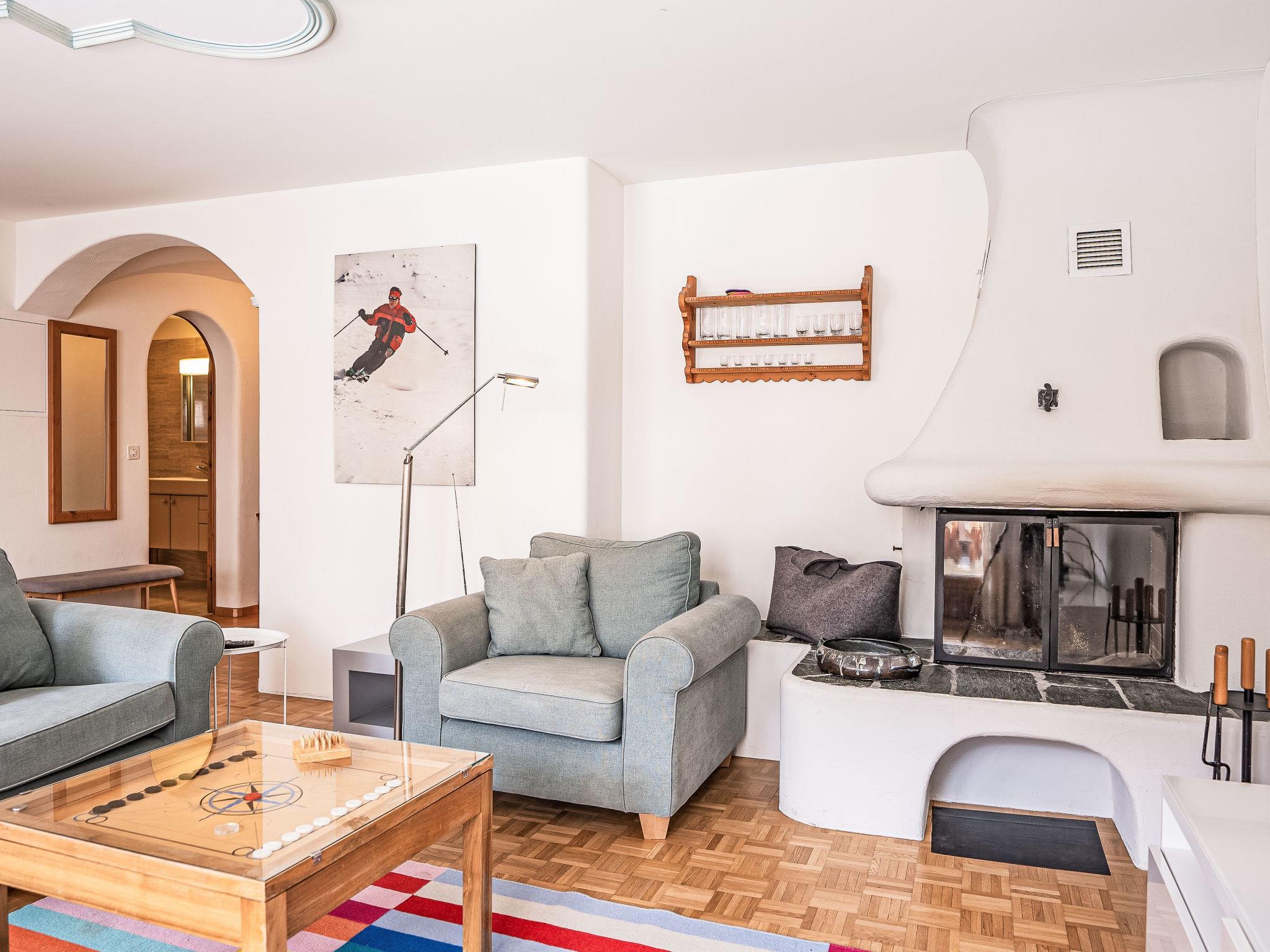 "Chesa Mezzaun", 3-room apartment 98 m2, on the ground floor. Very comfortable and beautiful furnishings: living/dining room with open-hearth fireplace and TV. Exit to the balcony, south facing position. 1 double bedroom with 1 french bed (1 x 160 cm, length 195 cm). 1 double bedroom with 1 french bed (1 x 160 cm, length 190 cm). Open kitchen (4 hot plates, oven, dishwasher, toaster, kettle, freezer, electric coffee machine, Capsules for coffee machine (Nespresso) extra, raclette grill, fondue Set (cheese)) with dining nook. Bath/bidet/WC, sep. WC. Heating. Balcony furniture. Side, of the mountains and the resort. Facilities: hair dryer. Internet (WiFi, free). Garage space n 48, height 205 cm, width 200 cm. Please note: non-smokers only. Maximum 1 pet/ dog allowed.