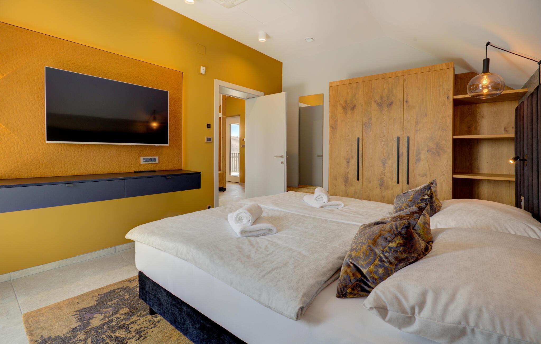 Tillbringa avkopplande dagar för två i denna eleganta semesterlägenhet på första våningen, som ligger på en rymlig egendom mitt i ett grönt kulligt landskap. Här kan ni se fram emot avkoppling, komfort och moderna faciliteter mitt i den fridfulla naturen. Känn dig som hemma i det ljusa vardagsrummet med matplats och koppla av i den mysiga soffan. Förutom en underbar utsikt erbjuder din lägenhet dig också ett gemensamt wellnessområde med bastu, inomhuspool och gym för en avkopplande paus.