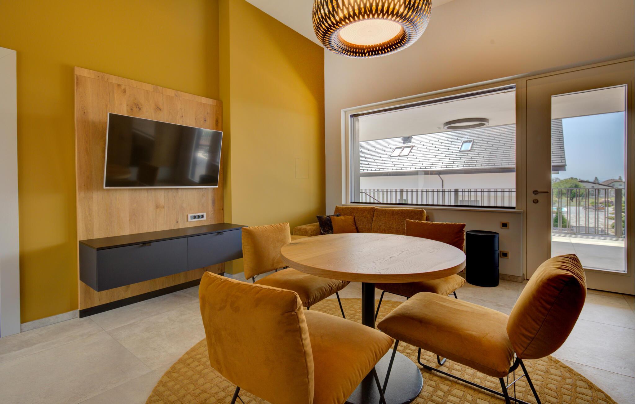 Tillbringa avkopplande dagar för två i denna eleganta semesterlägenhet på första våningen, som ligger på en rymlig egendom mitt i ett grönt kulligt landskap. Här kan ni se fram emot avkoppling, komfort och moderna faciliteter mitt i den fridfulla naturen. Känn dig som hemma i det ljusa vardagsrummet med matplats och koppla av i den mysiga soffan. Förutom en underbar utsikt erbjuder din lägenhet dig också ett gemensamt wellnessområde med bastu, inomhuspool och gym för en avkopplande paus.