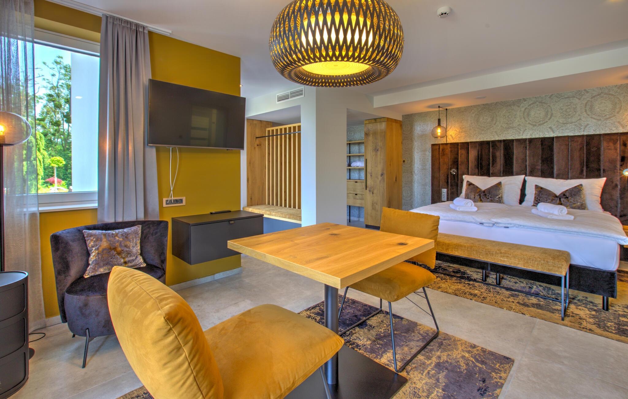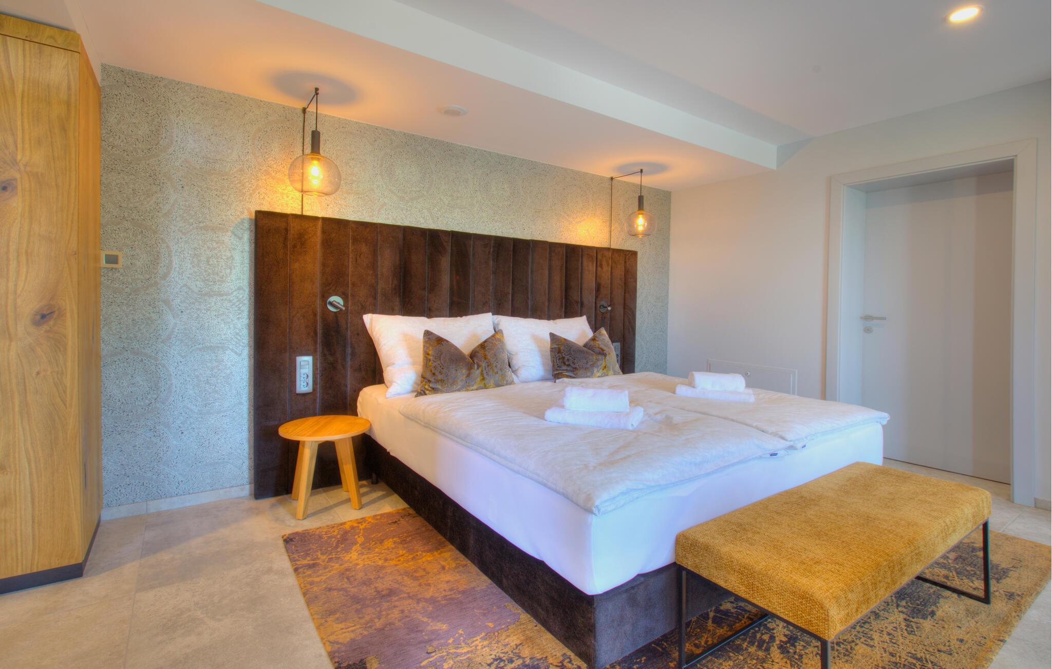 Tillbringa avkopplande dagar för två i denna eleganta semesterlägenhet på första våningen, som ligger på en rymlig egendom mitt i ett grönt kulligt landskap. Här kan ni se fram emot avkoppling, komfort och moderna faciliteter mitt i den fridfulla naturen. Känn dig som hemma i det ljusa vardagsrummet med matplats och koppla av i den mysiga soffan. Förutom en underbar utsikt erbjuder din lägenhet dig också ett gemensamt wellnessområde med bastu, inomhuspool och gym för en avkopplande paus.