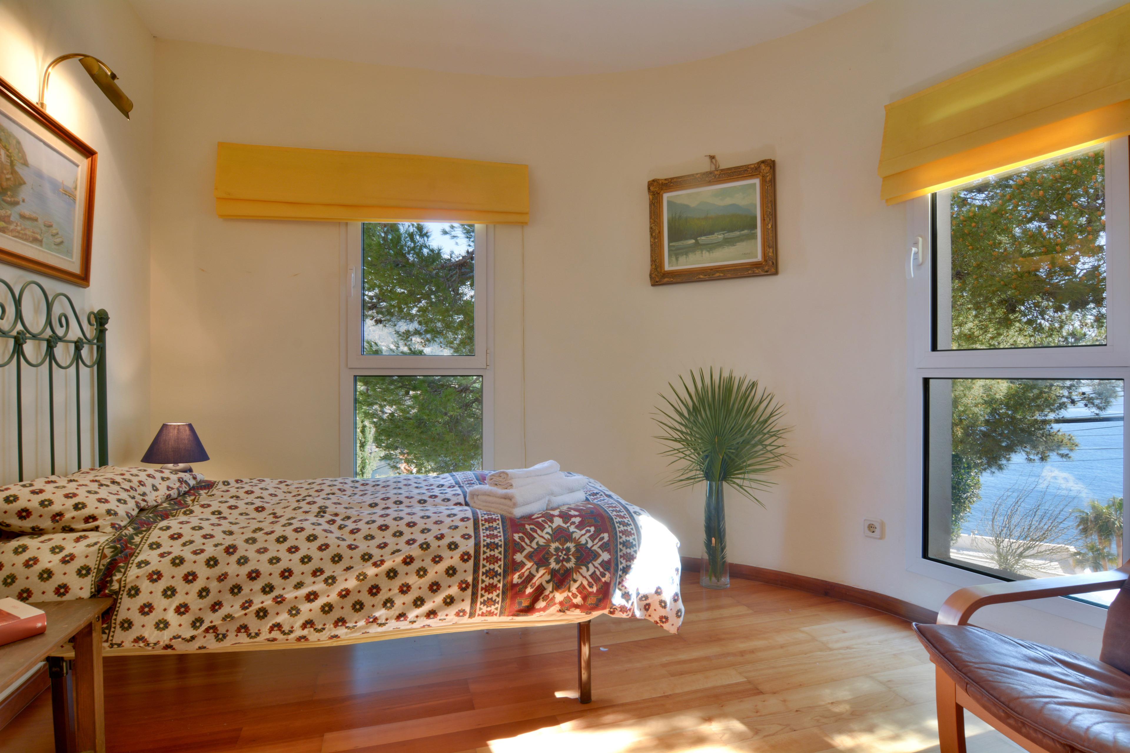 The master bedroom is on the upper level with ensuite bathroom, this bedroom opens onto an amazing terrace with open views to the bay in one direction, the port and mountains to the other side, there are chill out sofas and chairs for relaxing and enjoying a drink while admiring the beautiful view.