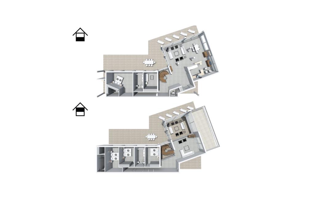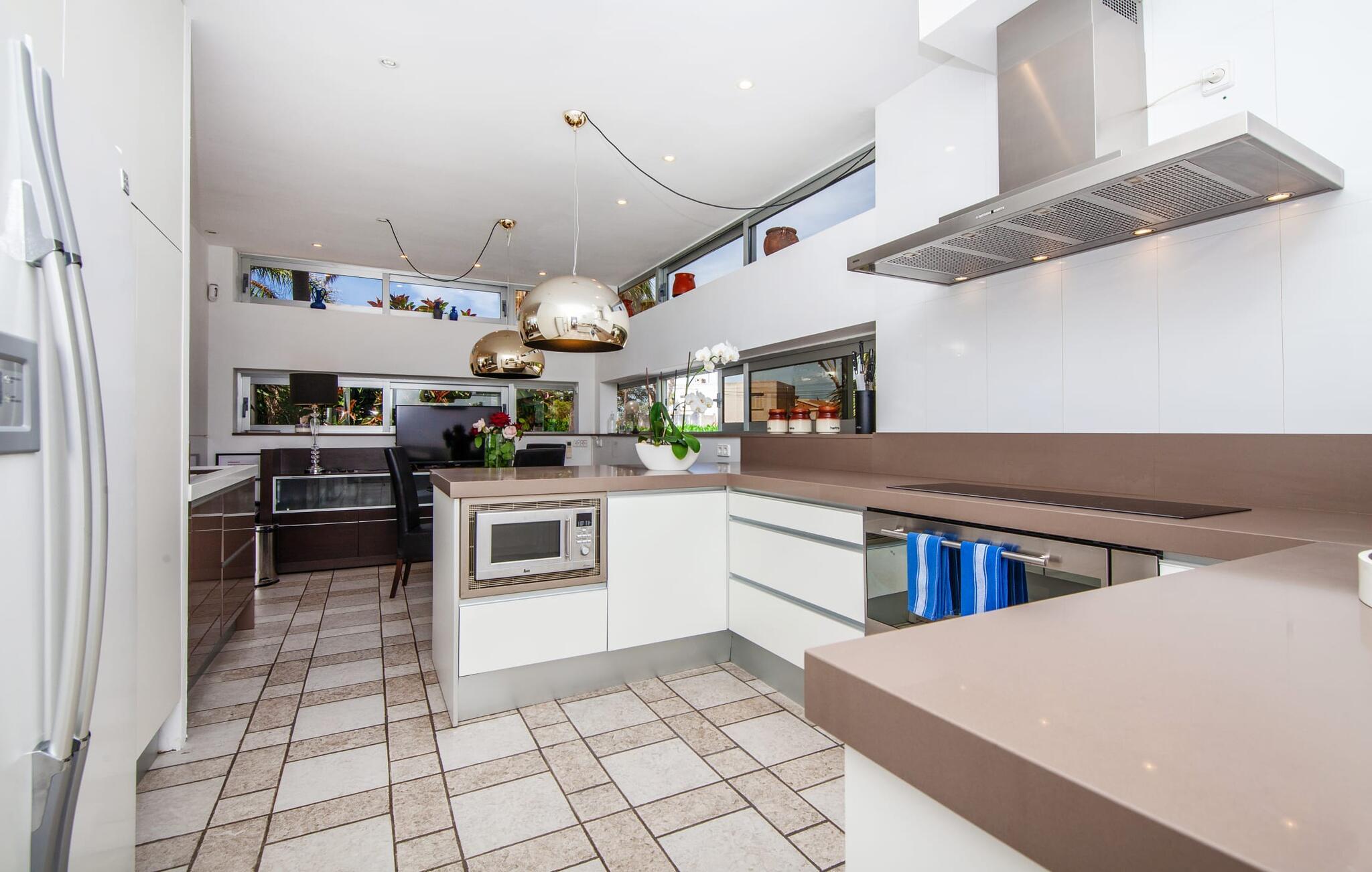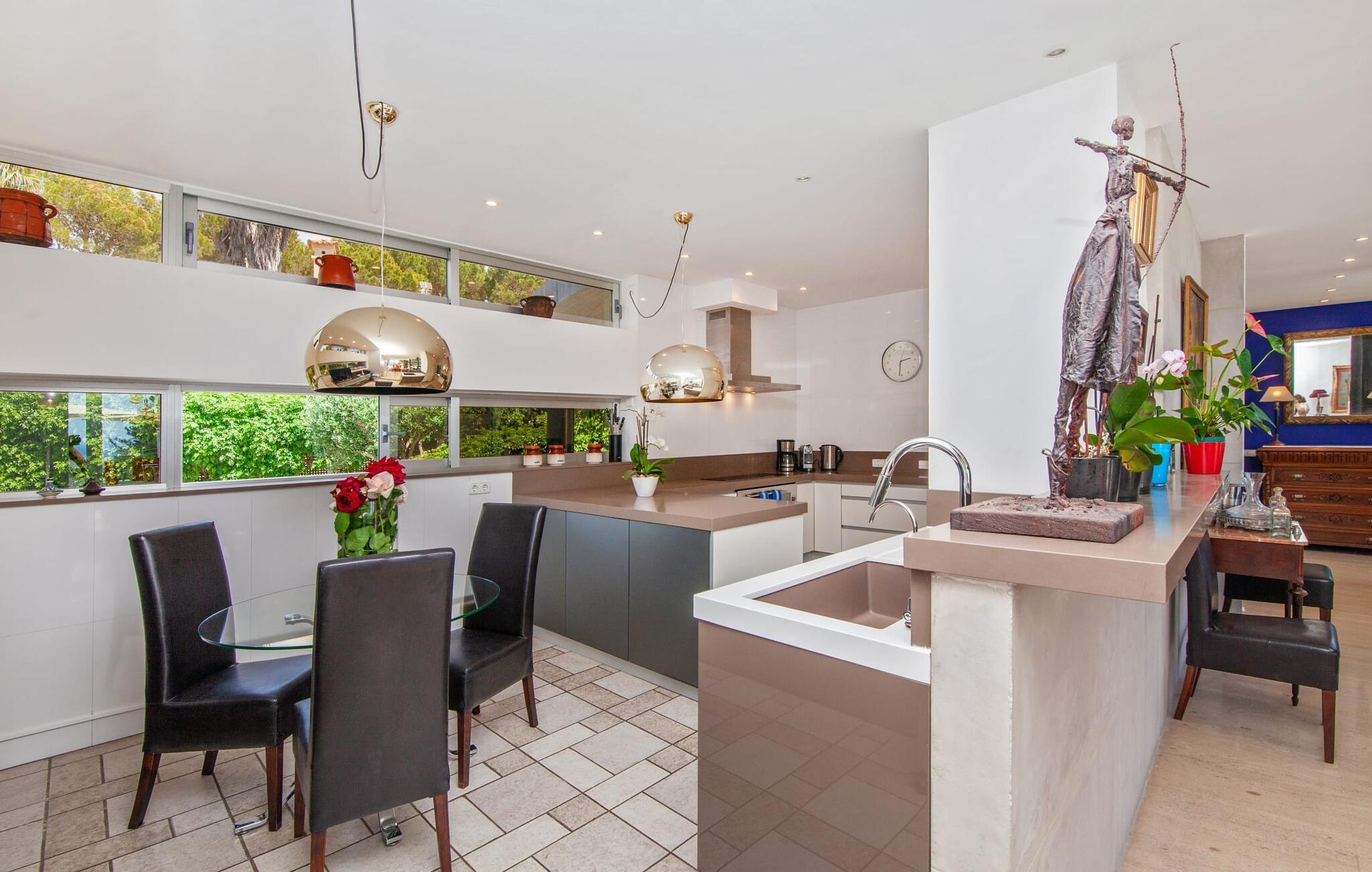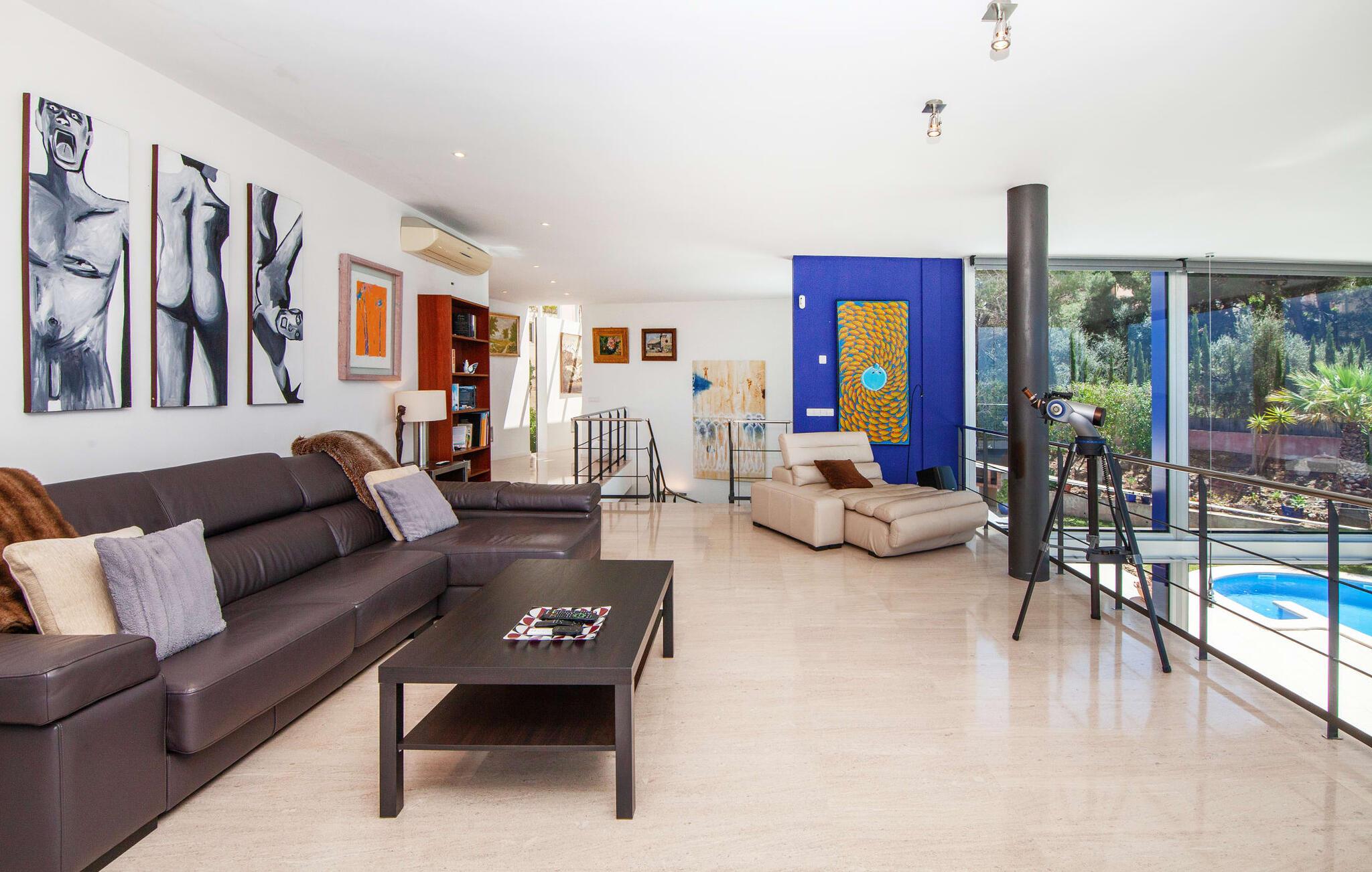 Den rymliga och avslappnat designade interiören i denna moderna villa kommer säkert att glädja dig lika mycket! Den har många eleganta designfunktioner. Från vardagsrummet, som inbjuder till avkoppling (med platt-TV, toppmodern öppen spis och två eleganta soffor), kommer man in i den angränsande matplatsen, som övergår i det öppna köket. Färgerna varierar här, men är ändå i perfekt harmoni. De stora arbetsytorna i köket erbjuder tillräckligt med utrymme för att prova mer vågade recept. Det finns ett härligt litet glasbord med fyra läderfåtöljer för ett snabbt morgonkaffe. Förutom gästtoaletten ligger också ett av sovrummen med eget badrum på bottenvåningen. För övrigt har arkitekterna också låtit generositet råda i alla badrum, inklusive användningen av material. Glas- och marmorelement smälter vackert samman och lämnar ingen tvekan om att du har valt ett förstklassigt hem här. En trappa leder från den ljusa foajén till övervåningen. Här ser du ett andra högkvalitativt vardagsrum som direkt angränsar till de tre sovrummen och badrumsområdena. Panoramaterrassen skriker bara efter att tas ut och förundras över utsikten.
