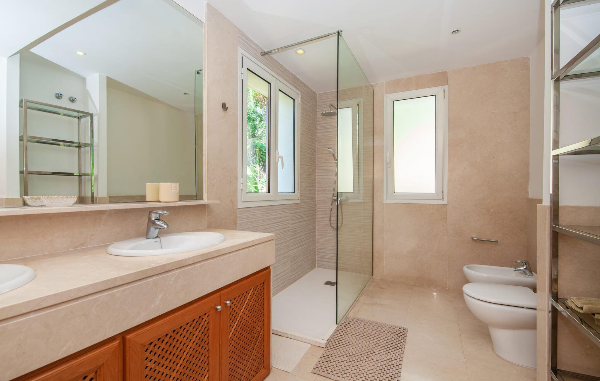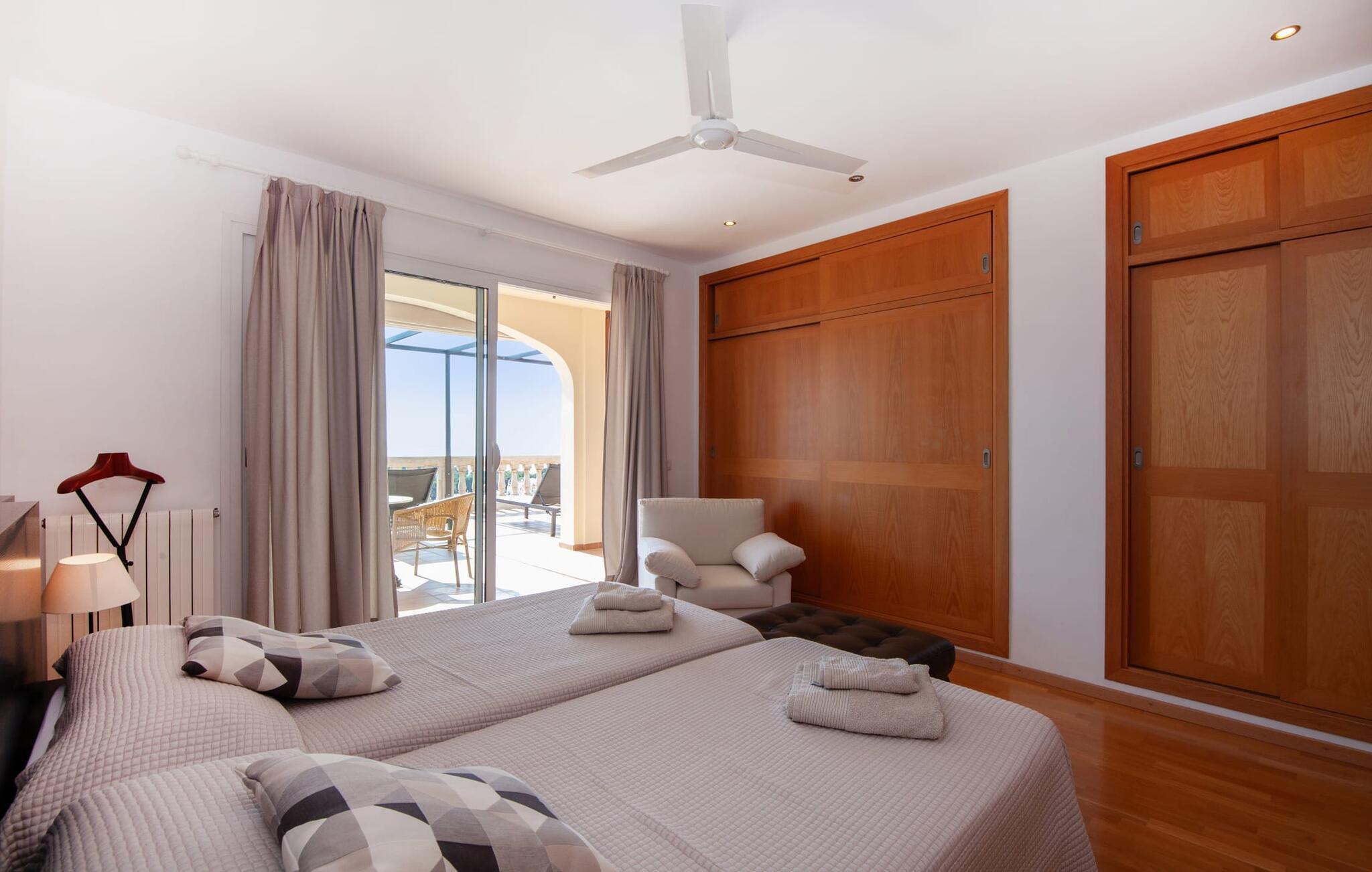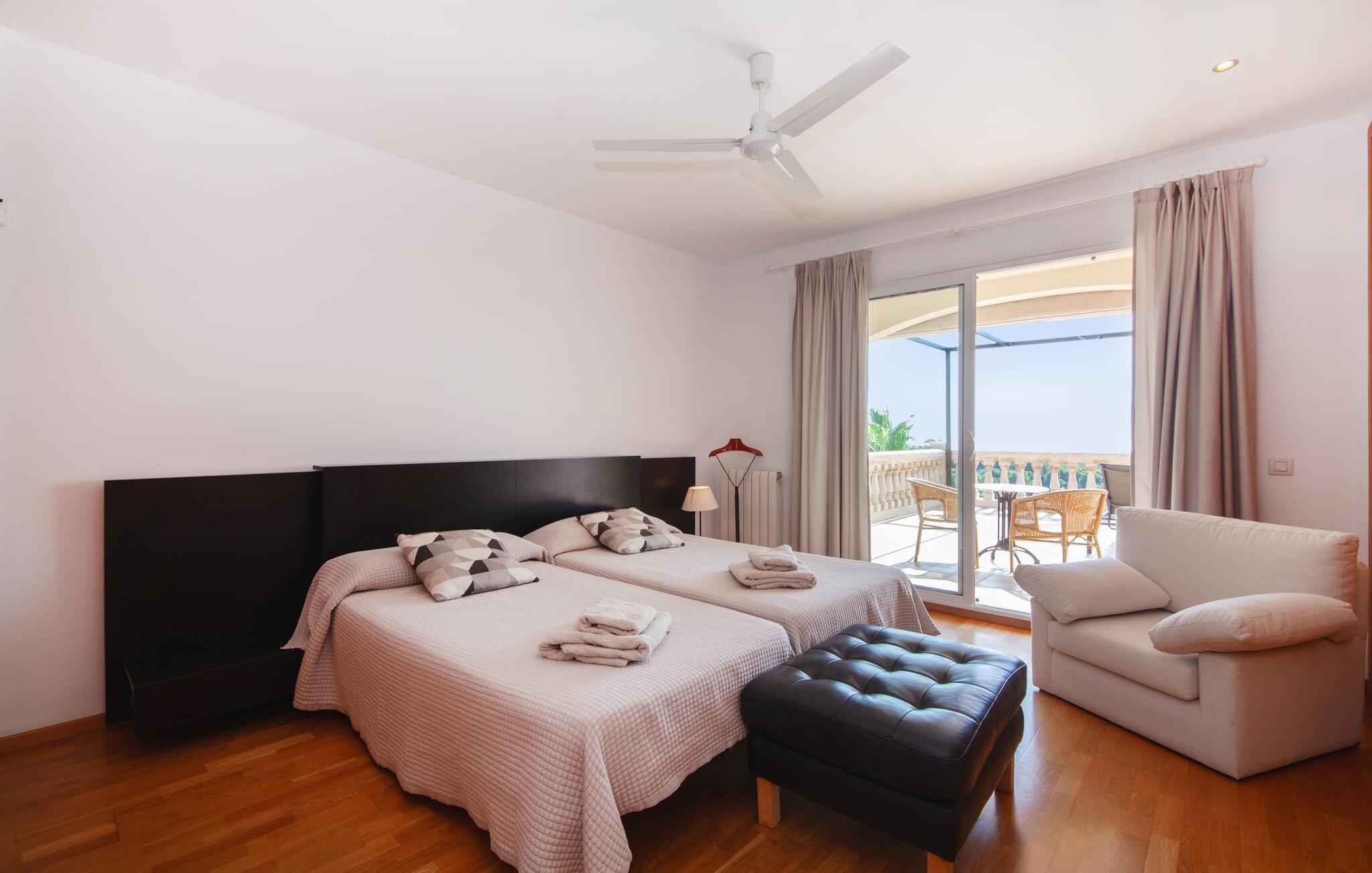 På övervåningen finns tre rymliga sovrum med dubbelsäng, varav ett har eget badrum, och ytterligare två badrum. Alla sovrum har direkt tillgång till den övre terrassen. Fönstren i söderläge är försedda med träluckor och både bottenvåningen och ett sovrum på övervåningen har takfläktar. Villan är utrustad med luftkonditionering på varje våning för att säkerställa komfort under hela din vistelse.