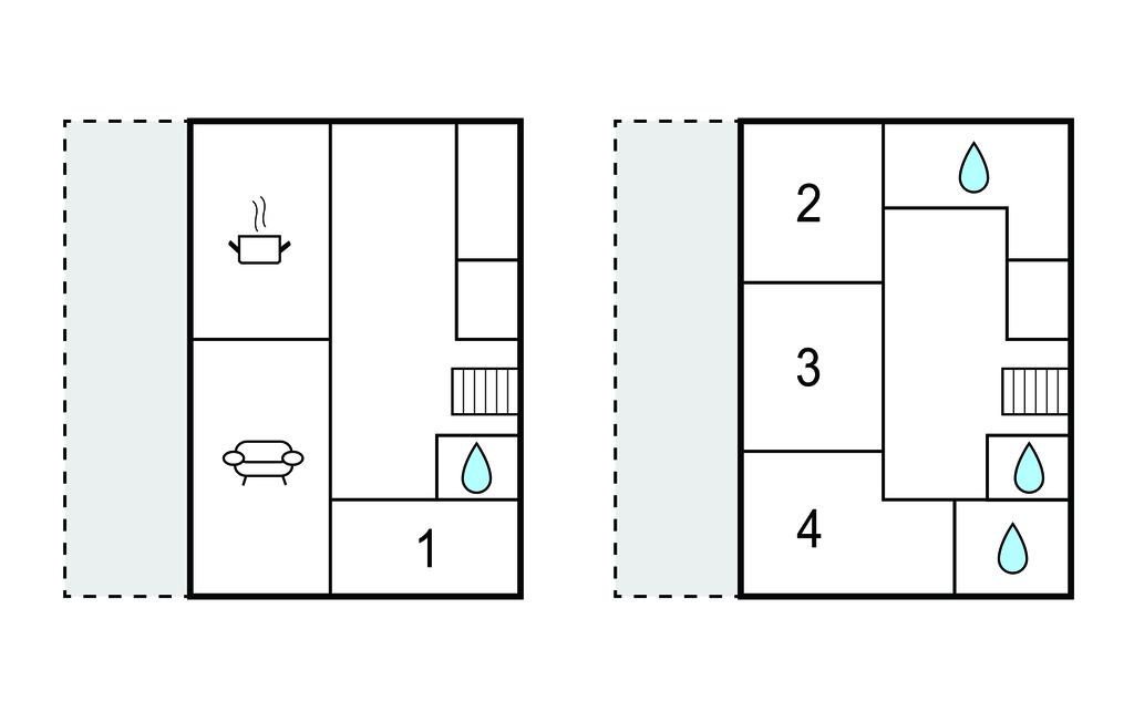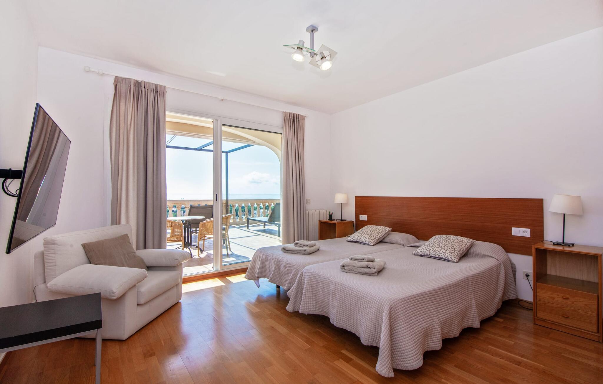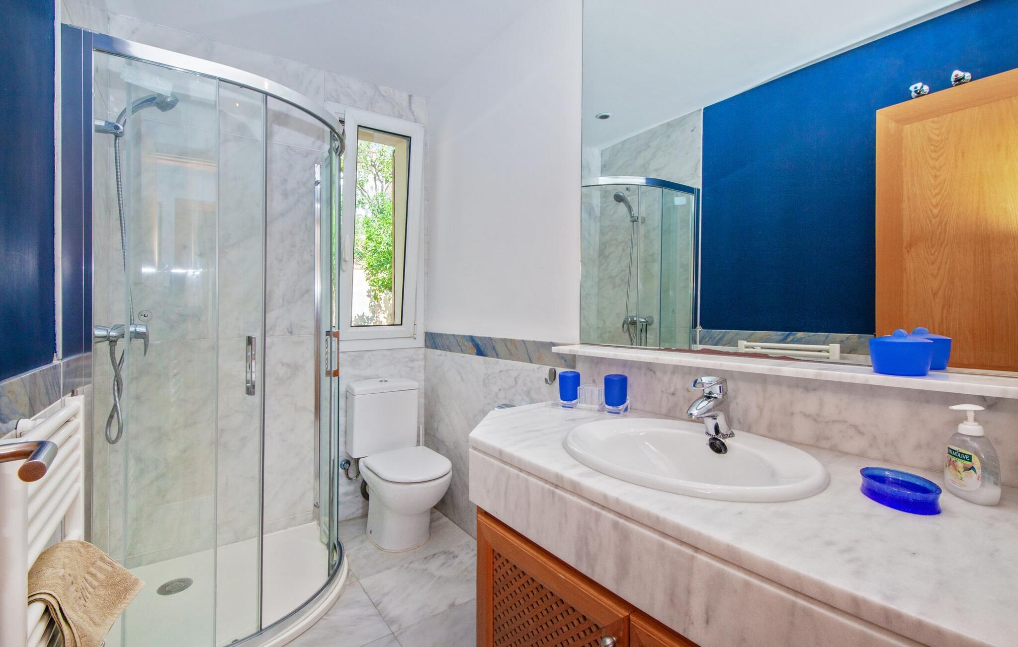 På övervåningen finns tre rymliga sovrum med dubbelsäng, varav ett har eget badrum, och ytterligare två badrum. Alla sovrum har direkt tillgång till den övre terrassen. Fönstren i söderläge är försedda med träluckor och både bottenvåningen och ett sovrum på övervåningen har takfläktar. Villan är utrustad med luftkonditionering på varje våning för att säkerställa komfort under hela din vistelse.