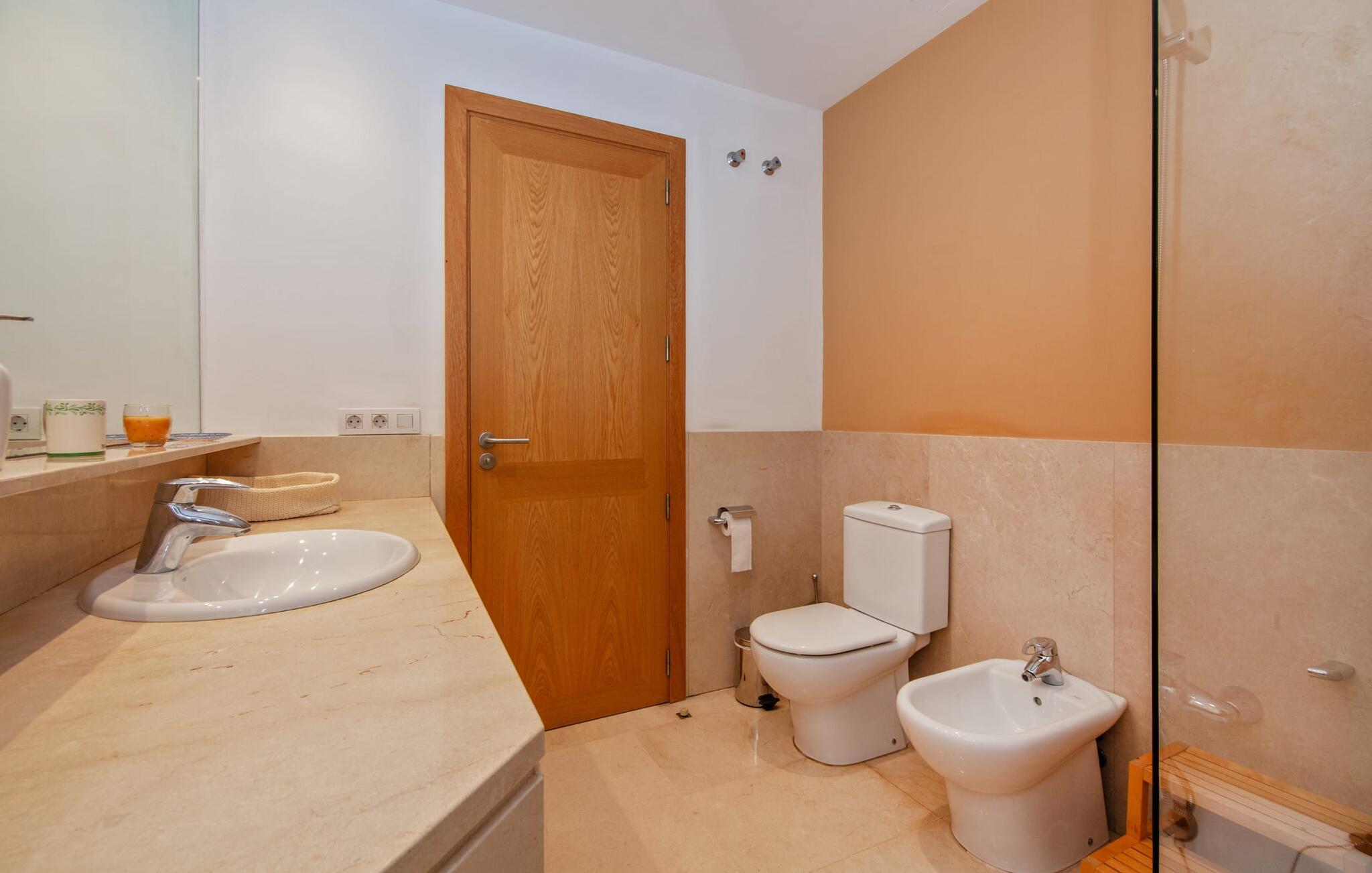 Det huvudsakliga vardagsrummet på första våningen har ett ljust översvämmat vardagsrum och matsal med öppen planlösning med skjutbara glasdörrar från golv till tak som leder till balkongterrassen. Det moderna köket är välutrustat och har egen utgång till terrassen. Det finns också ett sovrum med dubbelsäng, ett badrum med badkar och en tvättstuga på denna våning.
